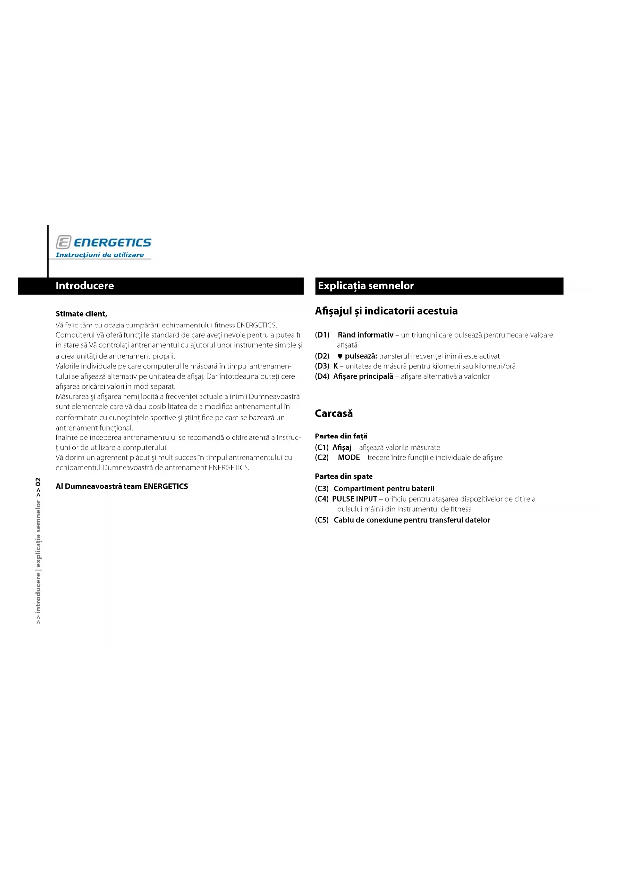 - Întreţinere Instrucţiuni de utilizare E-201 >> cuprins >> 01Instrucţiuni de utilizare >> introducere | explicaţia semnelor >> 02 Explicaţia semnelor Aşajul şi indicatorii acestuia (D1) Rând informativ – un triunghi care pulsează pentru fiecare valoare afişată (D2) pulsează: transferul frecvenţei inimii este activat (D3) K – unitatea de măsură pentru kilometri sau kilometri/oră (D4) Aşare principală – afişare alternativă a valorilor Carcasă Partea din faţă (C1) Aşaj – afişează valorile măsurate (C2) MODE – trecere între funcţiile individuale de afişare Partea din spate (C3) Compartiment pentru baterii (C4) PULSE INPUT – orificiu pentru ataşarea dispozitivelor de citire a pulsului mâinii din instrumentul de fitness (C5) Cablu de conexiune pentru transferul datelor Introducere Stimate client, Vă felicităm cu ocazia cumpărării echipamentului fitness ENERGETICS. Computerul Vă oferă funcţiile standard de care aveţi nevoie pentru a putea fi în stare să Vă controlaţi antrenamentul cu ajutorul unor instrumente simple şi a crea unităţi de antrenament proprii. Valorile individuale pe care computerul le măsoară în timpul antrenamen- tului se afişează alternativ pe unitatea de afişaj. Dar întotdeauna puteţi cere afişarea oricărei valori în mod separat. Măsurarea şi afişarea nemijlocită a frecvenţei actuale a inimii Dumneavoastră sunt elementele care Vă dau posibilitatea de a modifica antrenamentul în conformitate cu cunoştinţele sportive şi ştiinţifice pe care se bazează un antrenament funcţional. Înainte de începerea antrenamentului se recomandă o citire atentă a instruc- ţiunilor de utilizare a computerului. Vă dorim un agrement plăcut şi mult succes în timpul antrenamentului cu echipamentul Dumneavoastră de antrenament ENERGETICS. Al Dumneavoastră team ENERGETICSRO >> montajul şi pornirea >> 03 p. 8
