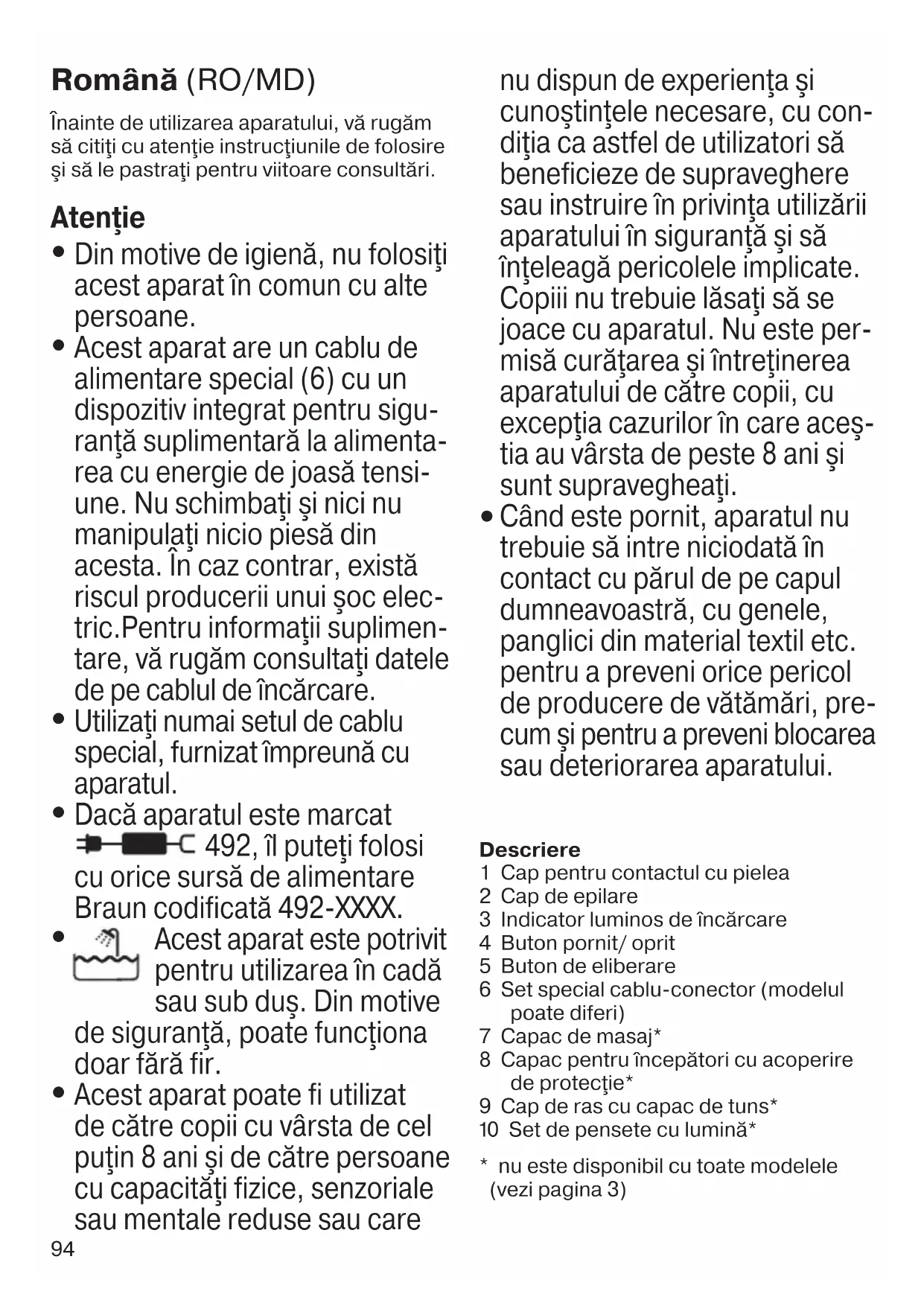 Când este pornit, aparatul nu trebuie să intre niciodată în contact cu părul de pe capul dumneavoastră, cu genele, panglici din material textil etc. pentru a preveni orice pericol de producere de vătămări, pre- cum şi pentru a preveni blocarea sau deteriorarea aparatului. Descriere 1 Cap pentru contactul cu pielea 2 Cap de epilare 3 Indicator luminos de încărcare 4 Buton pornit/ oprit 5 Buton de eliberare 6 Set special cablu-conector (modelul poate diferi) 7 Capac de masaj* 8 Capac pentru începători cu acoperire de protecţie* 9 Cap de ras cu capac de tuns* 0 Set de pensete cu lumină*