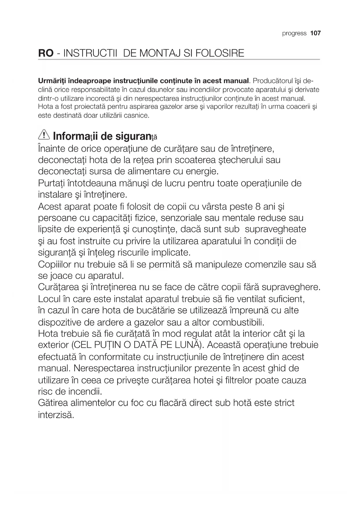 Înainte de orice operaţiune de curăţare sau de întreţinere, deconectaţi hota de la reţea prin scoaterea ştecherului sau deconectaţi sursa de alimentare cu energie. Purtaţi întotdeauna mănuşi de lucru pentru toate operaţiunile de instalare şi întreţinere. Acest aparat poate fi folosit de copii cu vârsta peste 8 ani şi persoane cu capacităţi fizice, senzoriale sau mentale reduse sau lipsite de experienţă şi cunoştinţe, dacă sunt sub supravegheate şi au fost instruite cu privire la utilizarea aparatului în condiţii de siguranţă şi înţeleg riscurile implicate. Copiiilor nu trebuie să li se permită să manipuleze comenzile sau să se joace cu aparatul. Curăţarea şi întreţinerea nu se face de către copii fără supraveghere. Locul în care este instalat aparatul trebuie să fie ventilat suficient, în cazul în care hota de bucătărie se utilizează împreună cu alte dispozitive de ardere a gazelor sau a altor combustibili. Hota trebuie să fie curăţată în mod regulat atât la interior cât şi la exterior (CEL PUŢIN O DATĂ PE LUNĂ). Această operaţiune trebuie efectuată în conformitate cu instrucţiunile de întreţinere din acest manual. Nerespectarea instrucţiunilor prezente în acest ghid de utilizare în ceea ce priveşte curăţarea hotei şi filtrelor poate cauza risc de incendii. Gătirea alimentelor cu foc cu flacără direct sub hotă este strict interzisă.108 progress Instrucțiuni de siguranţă Utilizarea flăcării este dăunătoare filtrelor şi poate provoca risc de incendiu; prin urmare, trebuie evitată în orice situaţie. Orice prăjire trebuie să se facă cu grijă, pentru a se asigura că uleiul nu se supraîncălzeste şi aprinde. AVERTISMENT! Părţile accesibile ale hotei pot deveni fierbinti când este hota este utilizat cu aparate de gătit. Pentru înlocuirea becurilor, utilizati numai tipul de becuri indicat în secţiunea Întreţinere/Înlocuirea becurilor din acest manual. AVERTISMENT! Nu conectaţi aparatul la reţeaua electrică până când instalarea este complet terminată. În ceea ce priveşte măsurile tehnice şi de siguranţă care trebuie adoptate pentru evacuarea fumului, este important să se urmărească îndeaproape normele locale. Sistemul de evacuare a fumului pentru acest aparat nu trebuie să fie conectat la nici sistem de ventilaţie existent care este folosit în alte scopuri, cum ar fi evacuarea gazelor de ardere rezultate de la aparatele consumatoare de gaz sau alţi combustibili. Nu folosiţi şi nu lăsaţi hota fără bec montat corect din cauza riscului de electrocutare. Nu folosiţi niciodată hota fără ca aceasta să aibă grilele montate în mod eficient. Hota nu trebuie utilizată NICIODATĂ ca suprafaţă de sprijin dacă acest lucru nu este precizat in mod expres. Folosiţi numai şuruburile de fixare furnizate împreună cu produsul pentru instalare sau, în cazul în care nu sunt incluse, achiziţionaţi tipul corespunzător de şuruburi. Use the correct length for the screws which are identified in the Installation Guide. În caz de incertitudine, consultaţi un centru de asistenţă service autorizat sau o persoană cu calificare corespunzătoare. AVERTISMENT! Neinstalarea şuruburilor sau a dispozitivul de fixare în conformitate cu aceste instrucţiuni poate duce la pericolelor de natură electrică. Protejarea mediului inconjurator Reciclaţi materialele marcate cu simbolul . Pentru a recicla ambalajele, acestea trebuie puse în containerele corespunzătoare. Ajutaţi la protejarea mediului şi a sănătăţii umane şi la reciclarea deşeurilor din aparatele electrice şi electrocasnice. Nu aruncaţi aparatele marcate cu acest simbol împreună cu deşeurile menajere. Returnaţi produsul la centrul local de reciclare sau contactaţi administraţia oraşului dvs. Utilizare Hota a fost realizată pentru a fi utilizată în versiunea aspirantă cu evacuare externă sau în versiunea filtrantă cu recirculare internă . Instalarea Tensiunea din reţea trebuie să corespundă cu tensiunea la care se referă eticheta situată în interiorul hotei. Dacă este prevăzută cu ştecher conectaţi hota la o priză conform cu normele în vigoare, poziţionată întro zona accesibilă şi după instalare. Dacă nu este prevăzută cu ştecher (conexiunea este direct la reţea) sau ştecherul nu este poziţionat întro zonă accesibilă şi după instalare, aplicaţi un întrerupător bipolar la normă care să asigure deconectarea completă de la reţea în condiţiile categoriei de supratensiune III, conform regulilor de instalare. Atenţie! înainte de a efectua conectarea circuitului hotei la alimentaţia din reţea şi de a verifica funcţionarea corectă, controlaţi totdeauna dacă cablul a fost montat în mod corect.progress 109 Distanţa minimă între suprafaţa suportului recipientelor pe dispozitivul de gătit şi partea de jos a hotei nu trebuie să fie mai mică de 50cm în cazul maşinilor de gătit electrice, şi de 65cm în cazul maşinilor de gătit cu gaz sau mixte. Dacă instrucţiiunile dispozitivului de gătit cu gaz specifică o distanţă mai mare, este necesar să ţineţi cont de aceasta. Întreţinere Atenţie! Înainte de orice intervenţie de curăţenie şi întreţinere, deconectaţi hota de la reţeaua electrică, scoţând ştecherul sau deconectând întrerupătorul general al locuinţei. Hota trebuie curăţată frecvent (cel puţin cu aceeaşi frecvenţă cu care se curăţă filtrele antigrăsime), fie în interior cât şi în exterior. Pentru curăţare folosiţi un material îmbibat cu detergenţi lichizi neutri. Evitaţi folosirea produselor pe bază de abrazivi NU FOLOSIŢI ALCOOL! Atenţie! Nerespectarea normelor de curăţare a hotei şi de înlocuire a filtrelor conduce la potenţiale riscuri de incendii. Vă sfătuim să respectaţi îndeaproape instrucţiunile prezente în acest manual. Producătorul îşi declină orice responsa