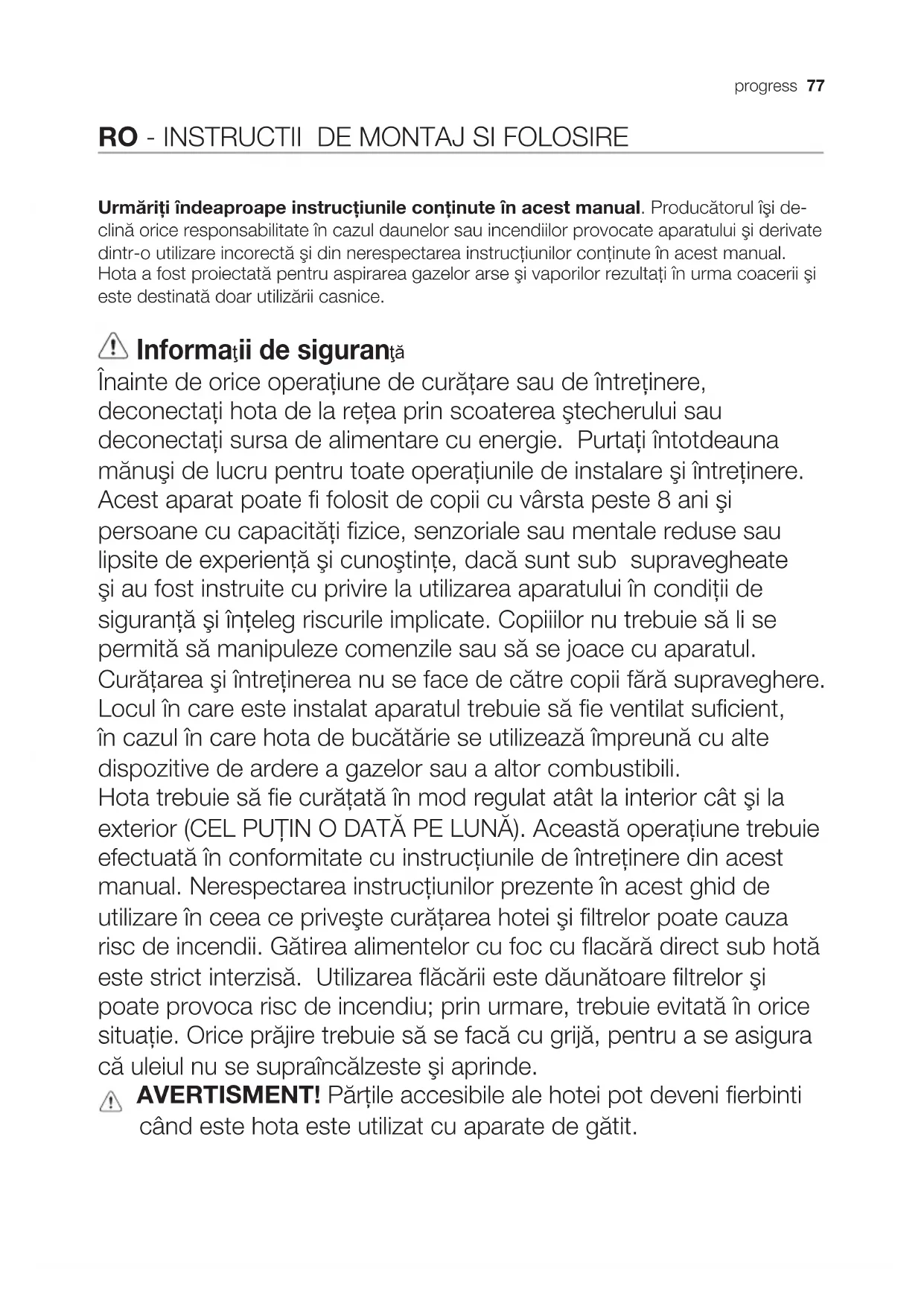 Înainte de orice operaţiune de curăţare sau de întreţinere, deconectaţi hota de la reţea prin scoaterea ştecherului sau deconectaţi sursa de alimentare cu energie. Purtaţi întotdeauna mănuşi de lucru pentru toate operaţiunile de instalare şi întreţinere. Acest aparat poate fi folosit de copii cu vârsta peste 8 ani şi persoane cu capacităţi fizice, senzoriale sau mentale reduse sau lipsite de experienţă şi cunoştinţe, dacă sunt sub supravegheate şi au fost instruite cu privire la utilizarea aparatului în condiţii de siguranţă şi înţeleg riscurile implicate. Copiiilor nu trebuie să li se permită să manipuleze comenzile sau să se joace cu aparatul. Curăţarea şi întreţinerea nu se face de către copii fără supraveghere. Locul în care este instalat aparatul trebuie să fie ventilat suficient, în cazul în care hota de bucătărie se utilizează împreună cu alte dispozitive de ardere a gazelor sau a altor combustibili. Hota trebuie să fie curăţată în mod regulat atât la interior cât şi la exterior (CEL PUŢIN O DATĂ PE LUNĂ). Această operaţiune trebuie efectuată în conformitate cu instrucţiunile de întreţinere din acest manual. Nerespectarea instrucţiunilor prezente în acest ghid de utilizare în ceea ce priveşte curăţarea hotei şi filtrelor poate cauza risc de incendii. Gătirea alimentelor cu foc cu flacără direct sub hotă este strict interzisă. Utilizarea flăcării este dăunătoare filtrelor şi poate provoca risc de incendiu; prin urmare, trebuie evitată în orice situaţie. Orice prăjire trebuie să se facă cu grijă, pentru a se asigura că uleiul nu se supraîncălzeste şi aprinde. AVERTISMENT! Părţile accesibile ale hotei pot deveni fierbinti când este hota este utilizat cu aparate de gătit.78 progress Instrucțiuni de siguranţă Pentru înlocuirea becurilor, utilizati numai tipul de becuri indicat în secţiunea Întreţinere/Înlocuirea becurilor din acest manual. AVERTISMENT! Nu conectaţi aparatul la reţeaua electrică până când instalarea este complet terminată. În ceea ce priveşte măsurile tehnice şi de siguranţă care trebuie adoptate pentru evacuarea fumului, este important să se urmărească îndeaproape normele locale. Sistemul de evacuare a fumului pentru acest aparat nu trebuie să fie conectat la nici sistem de ventilaţie existent care este folosit în alte scopuri, cum ar fi evacuarea gazelor de ardere rezultate de la aparatele consumatoare de gaz sau alţi combustibili. Nu folosiţi şi nu lăsaţi hota fără bec montat corect din cauza riscului de electrocutare. Nu folosiţi niciodată hota fără ca aceasta să aibă grilele montate în mod eficient. Hota nu trebuie utilizată NICIODATĂ ca suprafaţă de sprijin dacă acest lucru nu este precizat in mod expres. Folosiţi numai şuruburile de fixare furnizate împreună cu produsul pentru instalare sau, în cazul în care nu sunt incluse, achiziţionaţi tipul corespunzător de şuruburi. Use the correct length for the screws which are identified in the Installation Guide. În caz de incertitudine, consultaţi un centru de asistenţă service autorizat sau o persoană cu calificare corespunzătoare. AVERTISMENT! Neinstalarea şuruburilor sau a dispozitivul de fixare în conformitate cu aceste instrucţiuni poate duce la pericolelor de natură electrică. Protejarea mediului inconjurator Reciclaţi materialele marcate cu simbolul . Pentru a recicla ambalajele, acestea trebuie puse în containerele corespunzătoare. Ajutaţi la protejarea mediului şi a sănătăţii umane şi la reciclarea deşeurilor din aparatele electrice şi electrocasnice. Nu aruncaţi aparatele marcate cu acest simbol împreună cu deşeurile menajere. Returnaţi produsul la centrul local de reciclare sau contactaţi administraţia oraşului dvs. Utilizare Hota a fost realizată pentru a fi utilizată în versiunea aspirantă cu evacuare externă sau în versiunea filtrantă cu recirculare internă . Instalarea Tensiunea din reţea trebuie să corespundă cu tensiunea la care se referă eticheta situată în interiorul hotei. Dacă este prevăzută cu ştecher conectaţi hota la o priză conform cu normele în vigoare, poziţionată întro zona accesibilă şi după instalare. Dacă nu este prevăzută cu ştecher (conexiunea este direct la reţea) sau ştecherul nu este poziţionat întro zonă accesibilă şi după instalare, aplicaţi un întrerupător bipolar la normă care să asigure deconectarea completă de la reţea în condiţiile categoriei de supratensiune III, conform regulilor de instalare. Atenţie! înainte de a efectua conectarea circuitului hotei la alimentaţia din reţea şi de a verifica funcţionarea corectă, controlaţi totdeauna dacă cablul a fost montat în mod corect.progress 79 Hota este prevăzută cu un cablu de alimentare special; în cazul deteriorării acestuia, apelaţi la serviciul de asistenţă tehnică. Distanţa minimă între suprafaţa suportului recipientelor pe dispozitivul de gătit şi partea de jos a hotei nu trebuie să fie mai mică de 50cm în cazul maşinilor de gătit electrice, şi de 65cm în cazul maşinilor de gătit cu gaz sau mixte. Dacă instrucţiiunile dispozitivului de gătit cu gaz specifică o distanţă mai mare, este necesar să ţineţi cont de aceasta. Funcţionarea Se recomandă o viteza crescută, în special în cazul unei concentraţii mari de vapori în bucătărie. Vă sfătuim să o lăsaţi să aspire 5 minute înainte de a demara procesul de coacere şi de a o lăsa în funcţiune, la închiderea procesului de coacere, pentru încă 15 minute (aproximativ).