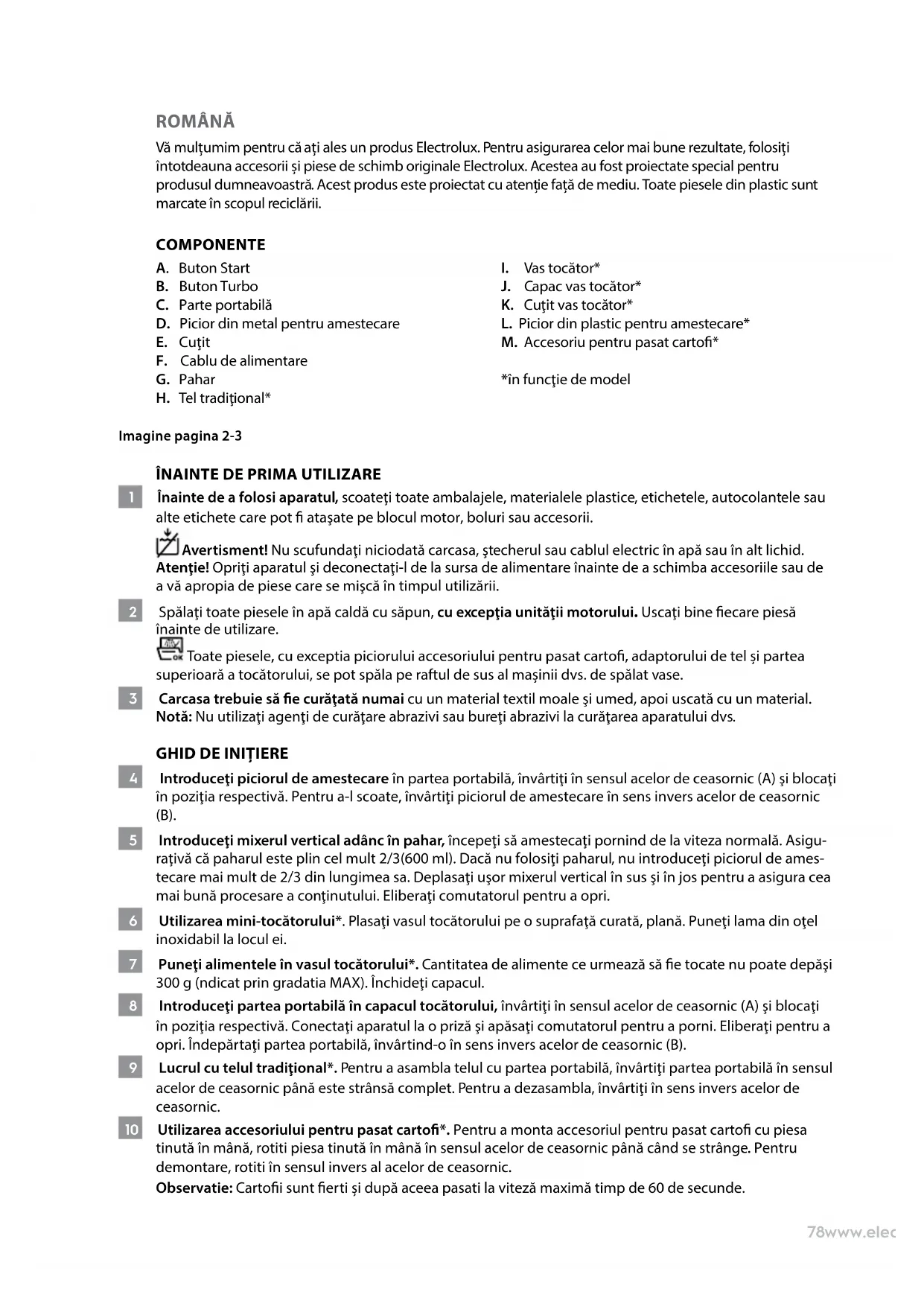 Simbolul de pe produs indică faptul că acesta conţine o baterie care nu trebuie aruncată cu deşeurile menajere obişnuite. Acest simbol de pe produs sau de pe ambalaj indică faptul produsul nu poate aruncat împreună cu deşeurile menajere. Pentru reciclare, produsul trebuie dus la un punct de colectare sau la un centru de service Electrolux, care poate demonta şi recicla bateria şi componentele electrice într-un mod sigur şi profesional. Pentru colectarea separată a produselor electrice şi bateriilor reciclabile, urmaţi reglementările în vigoare la nivel naţional. Electrolux îşi rezervă dreptul de a modica produsele, informaţiile şi specicaţiile fără preaviz.82www.electrolux.com SRPSKI Hvala Vam na odabiru Electrolux proizvoda. Kako biste osigurali najbolje rezultate, uvek koristite originalnu dodatnu opremu i rezervne delove kompanije Electrolux. Oni su dizajnirani posebno za Vaš proizvod. Ovaj proizvod je dizajniran s pažnjom na životnu sredinu. Svi plastični delovi obeleženi su u svrhu recikliranja. KOMPONENTE A. Dugme za pokretanje B. Turbo dugme C. Deo koji se drži u ruci D. Metalna nožica za mešanje E. Nožić F. Kabl za napajanje G. Čaša H. Klasična žica za mućenje*