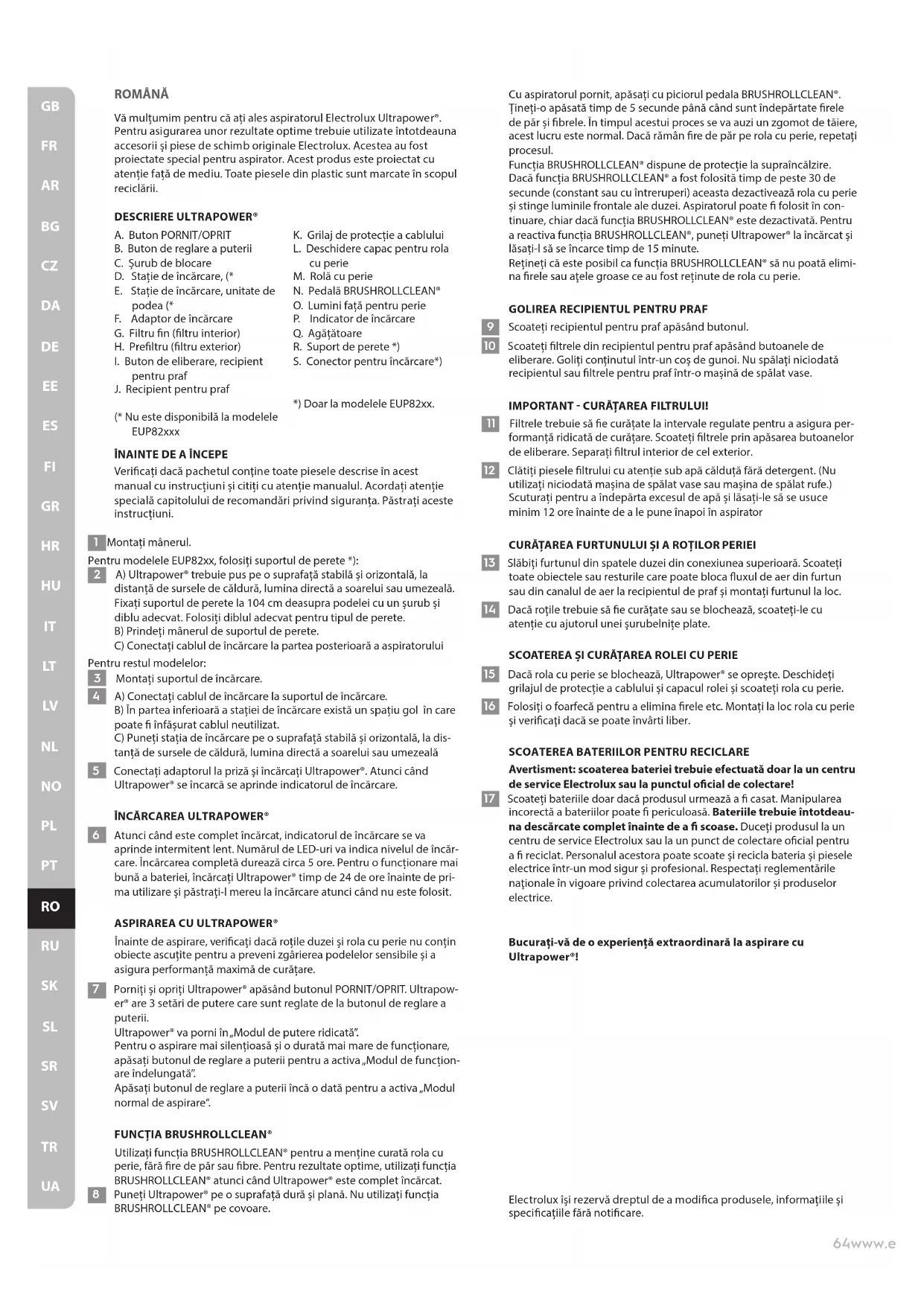 Avertisment: scoaterea bateriei trebuie efectuată doar la un centru de service Electrolux sau la punctul ocial de colectare! 17 Scoateți bateriile doar dacă produsul urmează a casat. Manipularea incorectă a bateriilor poate periculoasă. Bateriile trebuie întotdeau- na descărcate complet înainte de a scoase. Duceți produsul la un centru de service Electrolux sau la un punct de colectare ocial pentru a reciclat. Personalul acestora poate scoate și recicla bateria și piesele electrice într-un mod sigur și profesional. Respectați reglementările naţionale în vigoare privind colectarea acumulatorilor și produselor electrice. Bucurați-vă de o experiență extraordinară la aspirare cu Ultrapower®!65www.electrolux.com