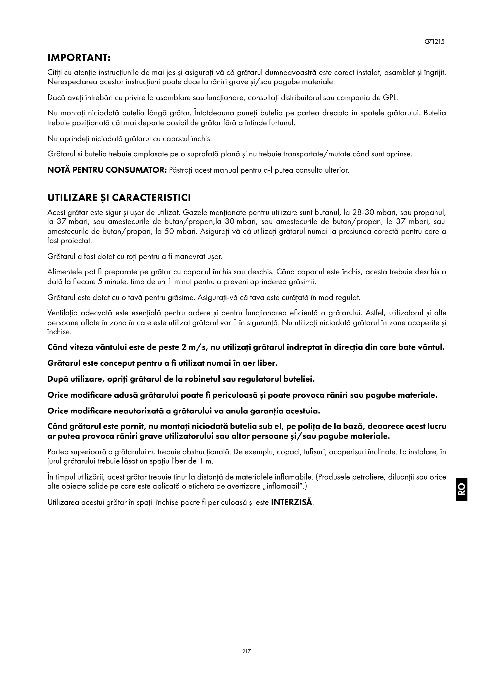 Acest grătar este sigur şi uşor de utilizat. Gazele menţionate pentru utilizare sunt butanul, la 28-30mbari, sau propanul, la 37mbari, sau amestecurile de butan/propan,la 30mbari, sau amestecurile de butan/propan, la 37 mbari, sau amestecurile de butan/propan, la 50 mbari. Asiguraţi-vă că utilizaţi grătarul numai la presiunea corectă pentru care a fost proiectat. Grătarul a fost dotat cu roţi pentru a fi manevrat uşor. Alimentele pot fi preparate pe grătar cu capacul închis sau deschis. Când capacul este închis, acesta trebuie deschis o dată la fiecare 5minute, timp de un 1minut pentru a preveni aprinderea grăsimii. Grătarul este dotat cu o tavă pentru grăsime. Asiguraţi-vă că tava este curăţată în mod regulat. Ventilaţia adecvată este esenţială pentru ardere şi pentru funcţionarea eficientă a grătarului. Astfel, utilizatorul şi alte persoane aflate în zona în care este utilizat grătarul vor fi în siguranţă. Nu utilizaţi niciodată grătarul în zone acoperite şi închise. Când viteza vântului este de peste 2m/s, nu utilizaţi grătarul îndreptat în direcţia din care bate vântul. Grătarul este conceput pentru a fi utilizat numai în aer liber. După utilizare, opriţi grătarul de la robinetul sau regulatorul buteliei. Orice modificare adusă grătarului poate fi periculoasă şi poate provoca răniri sau pagube materiale. Orice modificare neautorizată a grătarului va anula garanţia acestuia. Când grătarul este pornit, nu montaţi niciodată butelia sub el, pe poliţa de la bază, deoarece acest lucru ar putea provoca răniri grave utilizatorului sau altor persoane şi/sau pagube materiale. Partea superioară a grătarului nu trebuie obstrucţionată. De exemplu, copaci, tufişuri, acoperişuri înclinate. La instalare, în jurul grătarului trebuie lăsat un spaţiu liber de 1m. În timpul utilizării, acest grătar trebuie ţinut la distanţă de materialele inflamabile. (Produsele petroliere, diluanţii sau orice alte obiecte solide pe care este aplicată o eticheta de avertizare „inflamabil”.) Utilizarea acestui grătar în spaţii închise poate fi periculoasă şi este INTERZISĂ. RO218