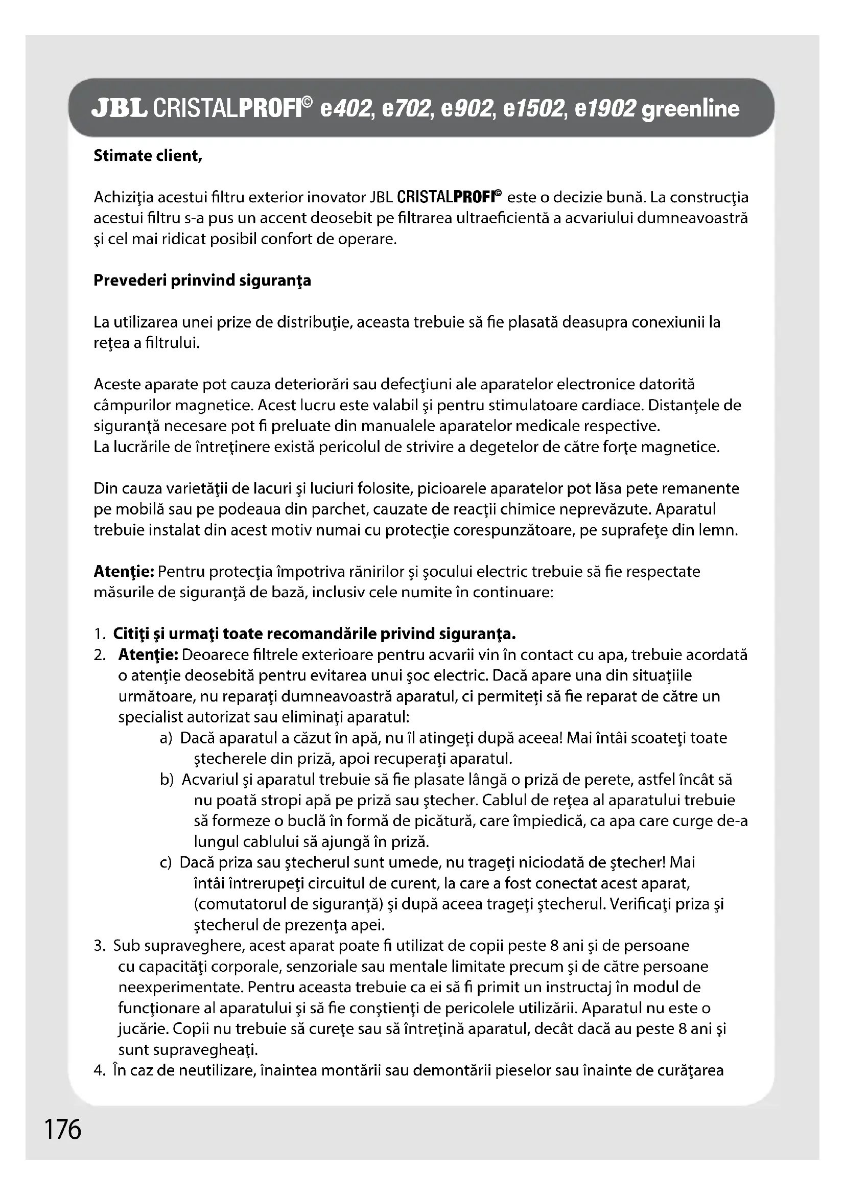 o atenţie deosebită pentru evitarea unui şoc electric. Dacă apare una din situaţiile următoare, nu reparaţi dumneavoastră aparatul, ci permiteți să e reparat de către un specialist autorizat sau eliminaţi aparatul:a) Dacă aparatul a căzut în apă, nu îl atingeţi după aceea! Mai întâi scoateţi toate ştecherele din priză, apoi recuperaţi aparatul. b) Acvariul şi aparatul trebuie să e plasate lângă o priză de perete, astfel încât să nu poată stropi apă pe priză sau ştecher. Cablul de reţea al aparatului trebuie să formeze o buclă în formă de picătură, care împiedică, ca apa care curge de-a lungul cablului să ajungă în priză.c) Dacă priza sau ştecherul sunt umede, nu trageţi niciodată de ştecher! Mai întâi întrerupeţi circuitul de curent, la care a fost conectat acest aparat, (comutatorul de siguranţă) şi după aceea trageţi ştecherul. Vericaţi priza şi ştecherul de prezenţa apei.3. Sub supraveghere, acest aparat poate utilizat de copii peste 8 ani şi de persoane cu capacităţi corporale, senzoriale sau mentale limitate precum şi de către persoane neexperimentate. Pentru aceasta trebuie ca ei să primit un instructaj în modul de funcţionare al aparatului şi să e conştienţi de pericolele utilizării. Aparatul nu este o jucărie. Copii nu trebuie să cureţe sau să întreţină aparatul, decât dacă au peste 8 ani şi sunt supravegheaţi.4. În caz de neutilizare, înaintea montării sau demontării pieselor sau înainte de curăţarea JBL CRISTALPROFI