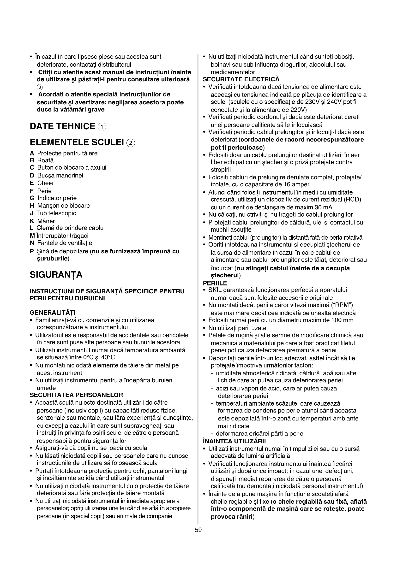 - Acordaţioatenţiespecialăinstrucţiunilorde securitateşiavertizare;neglijareaacestorapoate ducelavătămărigrave DATE TEHNICE 1 ElEmENTElE SCUlEI 2 A Protecţie pentru tăiere B Roată C Buton de blocare a axului D Bucşa mandrinei E Cheie F Perie G Indicator perie H Manşon de blocare J Tub telescopic k Mâner l Clemă de prindere cablu m Întrerupător trăgaci N Fantele de ventilaţie P Şină de depozitare (nusefurnizeazăîmpreunăcu şuruburile) SIGURANŢA
