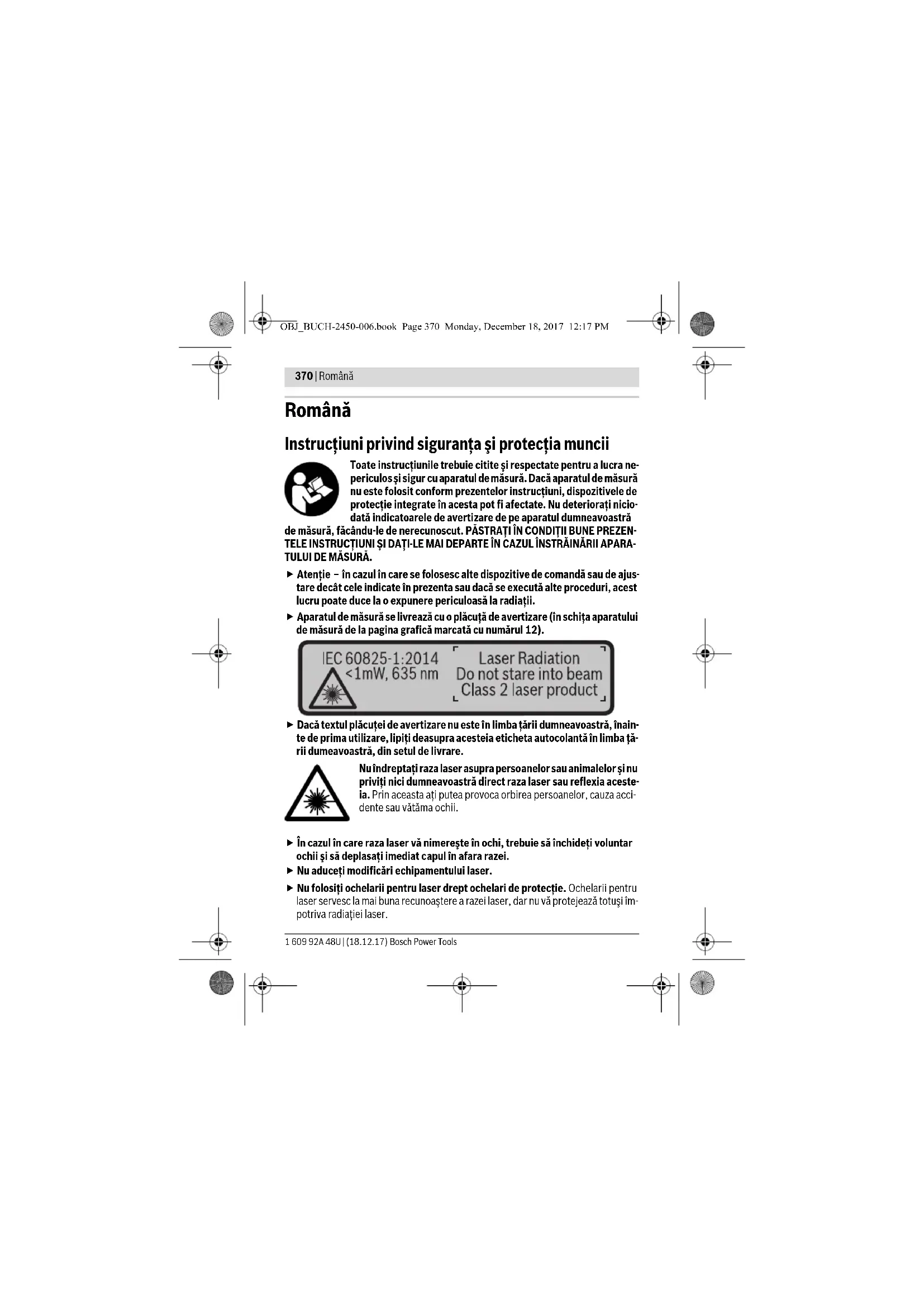 Муратбаев к., 180 үй “Гермес” БО, 7 қабат Тел.: +7 (727) 331 31 00 Факс: +7 (727) 233 07 87 E-Mail: ptka@bosch.com Сервистік қызмет көрсету орталықтары мен қабылдау пунктерінің мекен-жайы туралы толық және өзекті ақпаратты Сіз: www.bosch-professional.kz ресми сайттан ала аласыз Кәдеге жарату Өлшеу құралын, оның жабдықтары мен қаптамасын қоршаған ортаны қорғайтын кәдеге жарату орнына тапсыру қажет. Өлшеу құралдарын және аккумуляторларды/батареяларды үй қоқысына тастамаңыз! Тек қана ЕО елдері үшін: Еуропа 2012/19/EU ережесі бойынша жарамсыз өлшеу құралдар ы және Еуропа 2006/66/EC ережесі бойынша зақымдалған немесе ескі аккумулятор/бата- реялар бөлек жиналып, кәдеге жаратылуы қажет. Техникалық өзгерістер енгізу құқығы сақталады. OBJ_BUCH-2450-006.book Page 369 Monday, December 18, 2017 12:17 PM370 | Română 1 609 92A 48U | (18.12.17) Bosch Power Tools Română Instrucţiuni privind siguranţa şi protecţia muncii Toate instrucţiunile trebuie citite şi respectate pentru a lucra ne- periculos şi sigur cu aparatul de măsură. Dacă aparatul de măsură nu este folosit conform prezentelor instrucţiuni, dispozitivele de protecţie integrate în acesta pot fi afectate. Nu deterioraţi nicio- dată indicatoarele de avertizare de pe aparatul dumneavoastră de măsură, făcându-le de nerecunoscut. PĂSTRAŢI ÎN CONDIŢII BUNE PREZEN- TELE INSTRUCŢIUNI ŞI DAŢI-LE MAI DEPARTE ÎN CAZUL ÎNSTRĂINĂRII APARA- TULUI DE MĂSURĂ. Atenţie – în cazul în care se folosesc alte dispozitive de comandă sau de ajus- tare decât cele indicate în prezenta sau dacă se execută alte proceduri, acest lucru poate duce la o expunere periculoasă la radiaţii. Aparatul de măsură se livrează cu o plăcuţă de avertizare (în schiţa aparatului de măsură de la pagina grafică marcată cu numărul 12). Dacă textul plăcuţei de avertizare nu este în limba ţării dumneavoastră, înain- te de prima utilizare, lipiţi deasupra acesteia eticheta autocolantă în limba ţă- rii dumeavoastră, din setul de livrare. Nu îndreptaţi raza laser asupra persoanelor sau animalelor şi nu priviţi nici dumneavoastră direct raza laser sau reflexia aceste- ia. Prin aceasta aţi putea provoca orbirea persoanelor, cauza acci- dente sau vătăma ochii. În cazul în care raza laser vă nimereşte în ochi, trebuie să închideţi voluntar ochii şi să deplasaţi imediat capul în afara razei. Nu aduceţi modificări echipamentului laser. Nu folosiţi ochelarii pentru laser drept ochelari de protecţie. Ochelarii pentru laser servesc la mai buna recunoaştere a razei laser, dar nu vă protejează totuşi îm- potriva radiaţiei laser. OBJ_BUCH-2450-006.book Page 370 Monday, December 18, 2017 12:17 PMRomână | 371 Bosch Power Tools 1 609 92A 48U | (18.12.17) Nu folosiţi ochelarii pentru laser drept ochelari de soare sau în traficul rutier. Ochelarii pentru laser nu vă oferă protecţie totală împotriva razelor ultraviolete şi vă diminuează gradul de percepţie a culorilor. Nu permiteţi repararea aparatului de măsură decât de către personal de specialitate corespunzător calificat şi numai cu piese de schimb originale. Nu- mai în acest mod poate fi garantată siguranţa de exploatare a aparatului de măsură. Nu permiteţi copiilor să folosească nesupravegheaţi aparatul de măsură cu la- ser. Ei pot provoca în mod accidental orbirea persoanelor. Nu lucraţi cu aparatul de măsură în mediu cu pericol de explozie în care se află lichide, gaze sau pulberi inflamabile. În aparatul de măsură se pot produce scân- tei care să aprindă praful sau vaporii. Atenţie! În cazul utilizării aparatului de măsură cu Bluetooth® se pot produce deranjamente ale altor echipamente şi instalaţii, avioane şi aparate medicale (de exemplu stimulatoare cardiace, aparate auditive). De asemenea, nu poa- te fi complet exclusă afectarea oamenilor şi animalelor din imediata vecinăta- te. Nu utilizaţi aparatul de măsură cu Bluetooth® în apropierea aparatelor me- dicale, staţiilor de benzină, instalaţiilor chimice, sectoarelor cu pericol de explozie şi în zonele de detonare. Nu utilizaţ i aparatul de măsură cu Blue- tooth® în avioane. Evitaţi folosirea mai îndelungată în imediata apropiere a corpului. Marca Bluetooth® şi sigla (logo)sunt mărci înregistrate şi proprietatea Bluetooth SIG, Inc. Utilizarea acestei mărci/sigle de către Robert Bosch Power Tools GmbH se efectuează sub licenţă. Descrierea produsului şi a performanţelor Vă rugăm să desfaceţi pagina pliantă cu ilustrarea aparatului de măsură şi să o lăsaţi desfăcută cât timp citiţi instrucţiunile de folosire. Utilizare conform destinaţiei Aparatul de măsură este destinat măsurării distanţelor, lungimilor, înălţimilor, inter- valelor, înclinărilor şi calculării suprafeţelor şi volumelor. Rezultatele de măsurare pot fi transferate altor dispozitive via Bluetooth®. OBJ_BUCH-2450-006.book Page 371 Monday, December 18, 2017 12:17 PM372 | Română 1 609 92A 48U | (18.12.17) Bosch Power Tools Date tehnice Telemetru digital cu laser GLM 50 C Număr de identificare 3601K72C.. Domeniu de măsuare (normal) 0,05–50 m