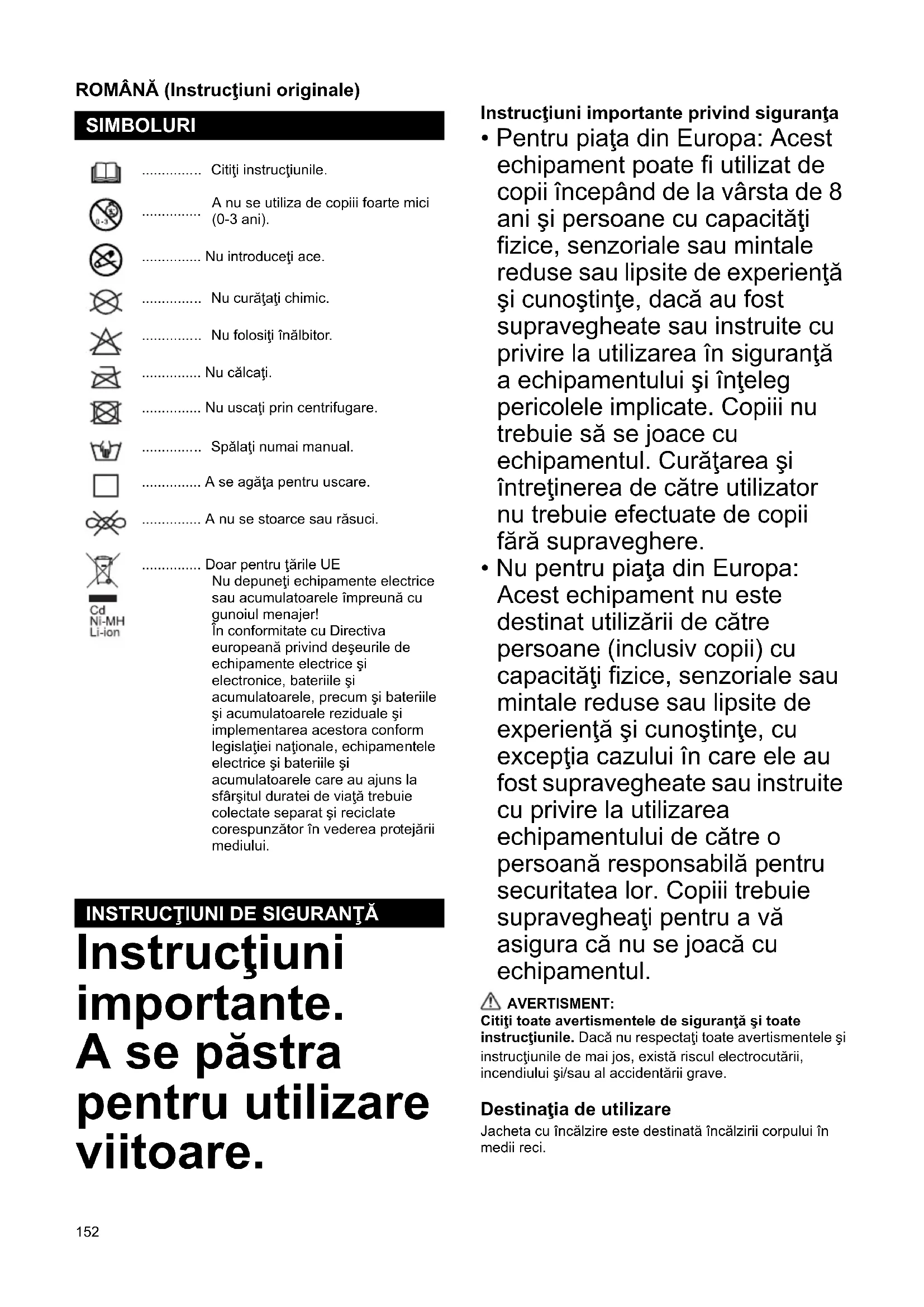 - Nu pentru piaţa din Europa: Acest echipament nu este destinat utilizării de către persoane (inclusiv copii) cu capacităţi fizice, senzoriale sau mintale reduse sau lipsite de experienţă şi cunoştinţe, cu excepţia cazului în care ele au fost supravegheate sau instruite cu privire la utilizarea echipamentului de către o persoană responsabilă pentru securitatea lor. Copiii trebuie supravegheaţi pentru a vă asigura că nu se joacă cu echipamentul. AVERTISMENT: Citiţi toate avertismentele de siguranţă şi toate instrucţiunile. Dacă nu respectaţi toate avertismentele şi instrucţiunile de mai jos, există riscul electrocutării, incendiului şi/sau al accidentării grave. Destinaţia de utilizare Jacheta cu încălzire este destinată încălzirii corpului în medii reci. SIMBOLURI ............... Citiţi instrucţiunile.