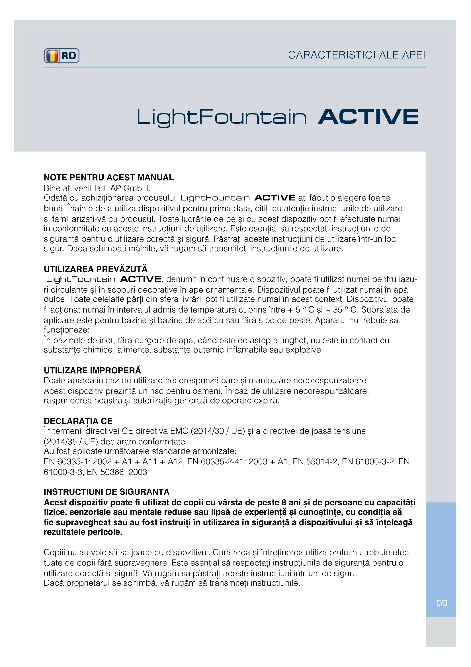 Odată cu achiziționarea produsului LightFountain ACTIVE ați făcut o alegere foarte bună. Înainte de a utiliza dispozitivul pentru prima dată, citiți cu atenție instrucțiunile de utilizare și familiarizați-vă cu produsul. Toate lucrările de pe și cu acest dispozitiv pot fi efectuate numai în conformitate cu aceste instrucțiuni de utilizare. Este esențial să respectați instrucțiunile de siguranță pentru o utilizare corectă și sigură. Păstrați aceste instrucțiuni de utilizare într-un loc sigur. Dacă schimbați mâinile, vă rugăm să transmiteți instrucțiunile de utilizare.