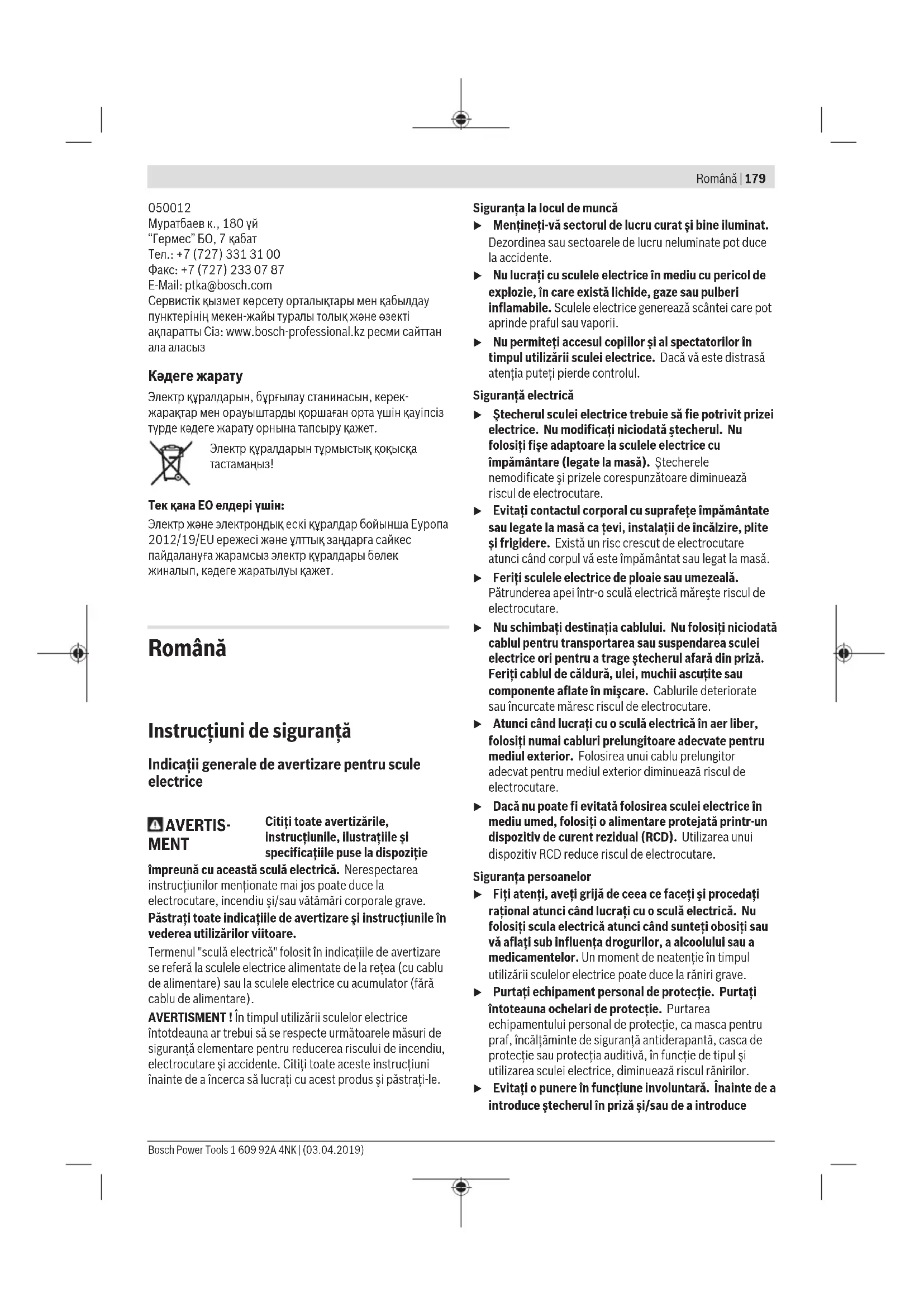 Кәдеге жарату Электр құралдарын, бұрғылау станинасын, керек- жарақтар мен орауыштарды қоршаған орта үшін қауіпсіз түрде кәдеге жарату орнына тапсыру қажет. Электр құралдарын тұрмыстық қоқысқа тастамаңыз! Тек қана ЕО елдері үшін: Электр және электрондық ескі құралдар бойынша Еуропа 2012/19/EU ережесі және ұлттық заңдарға сайкес пайдалануға жарамсыз электр құралдары бөлек жиналып, кәдеге жаратылуы қажет. Română Instrucţiuni de siguranţă Indicaţii generale de avertizare pentru scule electrice AVERTIS- MENT Citiţi toate avertizările, instrucţiunile, ilustraţiile şi specificaţiile puse la dispoziţie împreună cu această sculă electrică. Nerespectarea instrucţiunilor menţionate mai jos poate duce la electrocutare, incendiu şi/sau vătămări corporale grave. Păstraţi toate indicaţiile de avertizare şi instrucţiunile în vederea utilizărilor viitoare. Termenul "sculă electrică" folosit în indicaţiile de avertizare se referă la sculele electrice alimentate de la reţea (cu cablu de alimentare) sau la sculele electrice cu acumulator (fără cablu de alimentare). AVERTISMENT ! În timpul utilizării sculelor electrice întotdeauna ar trebui să se respecte următoarele măsuri de siguranţă elementare pentru reducerea riscului de incendiu, electrocutare şi accidente. Citiţi toate aceste instrucţiuni înainte de a încerca să lucraţi cu acest produs şi păstraţi-le. Siguranţa la locul de muncă u Menţineţi‑vă sectorul de lucru curat şi bine iluminat. Dezordinea sau sectoarele de lucru neluminate pot duce la accidente. u Nu lucraţi cu sculele electrice în mediu cu pericol de explozie, în care există lichide, gaze sau pulberi inflamabile. Sculele electrice generează scântei care pot aprinde praful sau vaporii. u Nu permiteţi accesul copiilor şi al spectatorilor în timpul utilizării sculei electrice. Dacă vă este distrasă atenţia puteţi pierde controlul. Siguranţă electrică u Ştecherul sculei electrice trebuie să fie potrivit prizei electrice. Nu modificaţi niciodată ştecherul. Nu folosiţi fişe adaptoare la sculele electrice cu împământare (legate la masă). Ştecherele nemodificate şi prizele corespunzătoare diminuează riscul de electrocutare. u Evitaţi contactul corporal cu suprafeţe împământate sau legate la masă ca ţevi, instalaţii de încălzire, plite şi frigidere. Există un risc crescut de electrocutare atunci când corpul vă este împământat sau legat la masă. u Feriţi sculele electrice de ploaie sau umezeală. Pătrunderea apei într‑o sculă electrică măreşte riscul de electrocutare. u Nu schimbaţi destinaţia cablului. Nu folosiţi niciodată cablul pentru transportarea sau suspendarea sculei electrice ori pentru a trage ştecherul afară din priză. Feriţi cablul de căldură, ulei, muchii ascuţite sau componente aflate în mişcare. Cablurile deteriorate sau încurcate măresc riscul de electrocutare. u Atunci când lucraţi cu o sculă electrică în aer liber, folosiţi numai cabluri prelungitoare adecvate pentru mediul exterior. Folosirea unui cablu prelungitor adecvat pentru mediul exterior diminuează riscul de electrocutare. u Dacă nu poate fi evitată folosirea sculei electrice în mediu umed, folosiţi o alimentare protejată printr-un dispozitiv de curent rezidual (RCD). Utilizarea unui dispozitiv RCD reduce riscul de electrocutare. Siguranţa persoanelor u Fiţi atenţi, aveţi grijă de ceea ce faceţi şi procedaţi raţional atunci când lucraţi cu o sculă electrică. Nu folosiţi scula electrică atunci când sunteţi obosiţi sau vă aflaţi sub influenţa drogurilor, a alcoolului sau a medicamentelor. Un moment de neatenţie în timpul utilizării sculelor electrice poate duce la răniri grave. u Purtaţi echipament personal de protecţie. Purtaţi întoteauna ochelari de protecţie. Purtarea echipamentului personal de protecţie, ca masca pentru praf, încălţăminte de siguranţă antiderapantă, casca de protecţie sau protecţia auditivă, în funcţie de tipul şi utilizarea sculei electrice, diminuează riscul rănirilor. u Evitaţi o punere în funcţiune involuntară. Înainte de a introduce ştecherul în priză şi/sau de a introduce Bosch Power Tools 1 609 92A 4NK | (03.04.2019)180 | Română acumulatorul în scula electrică, de a o ridica sau de a o transporta, asiguraţi‑vă că aceasta este oprită. Dacă atunci când transportaţi scula electrică ţineţi degetul pe întrerupător sau dacă porniţi scula electrică înainte de a o racorda la reţeaua de curent, puteţi provoca accidente. u Înainte de pornirea sculei electrice îndepărtaţi cleştii de reglare sau cheile fixe din aceasta. O cheie sau un cleşte ataşat la o componentă rotativă a sculei electrice poate provoca răniri. u Nu vă întindeţi pentru a lucra cu scula electrică. Menţineţi-vă întotdeauna stabilitatea şi echilibrul. Astfel veţi putea controla mai bine scula electrică în situaţii neaşteptate. u Purtaţi îmbrăcăminte adecvată. Nu purtaţi îmbrăcăminte largă sau podoabe. Feriţi părul şi îmbrăcămintea de piesele aflate în mişcare. Îmbrăcămintea largă, părul lung sau podoabele pot fi prinse în piesele aflate în mişcare. u Dacă pot fi montate echipamente de aspirare şi colectare a prafului, asiguraţi‑vă că acestea sunt racordate şi folosite în mod corect. Folosirea unei instalaţii de aspirare a prafului poate duce la reducerea poluării cu praf. u Nu vă lăsaţi amăgiţi de uşurinţa în operare dobândită în urma folosirii frecvente a sculelor electrice şi nu ignoraţi principiile de siguranţă al
