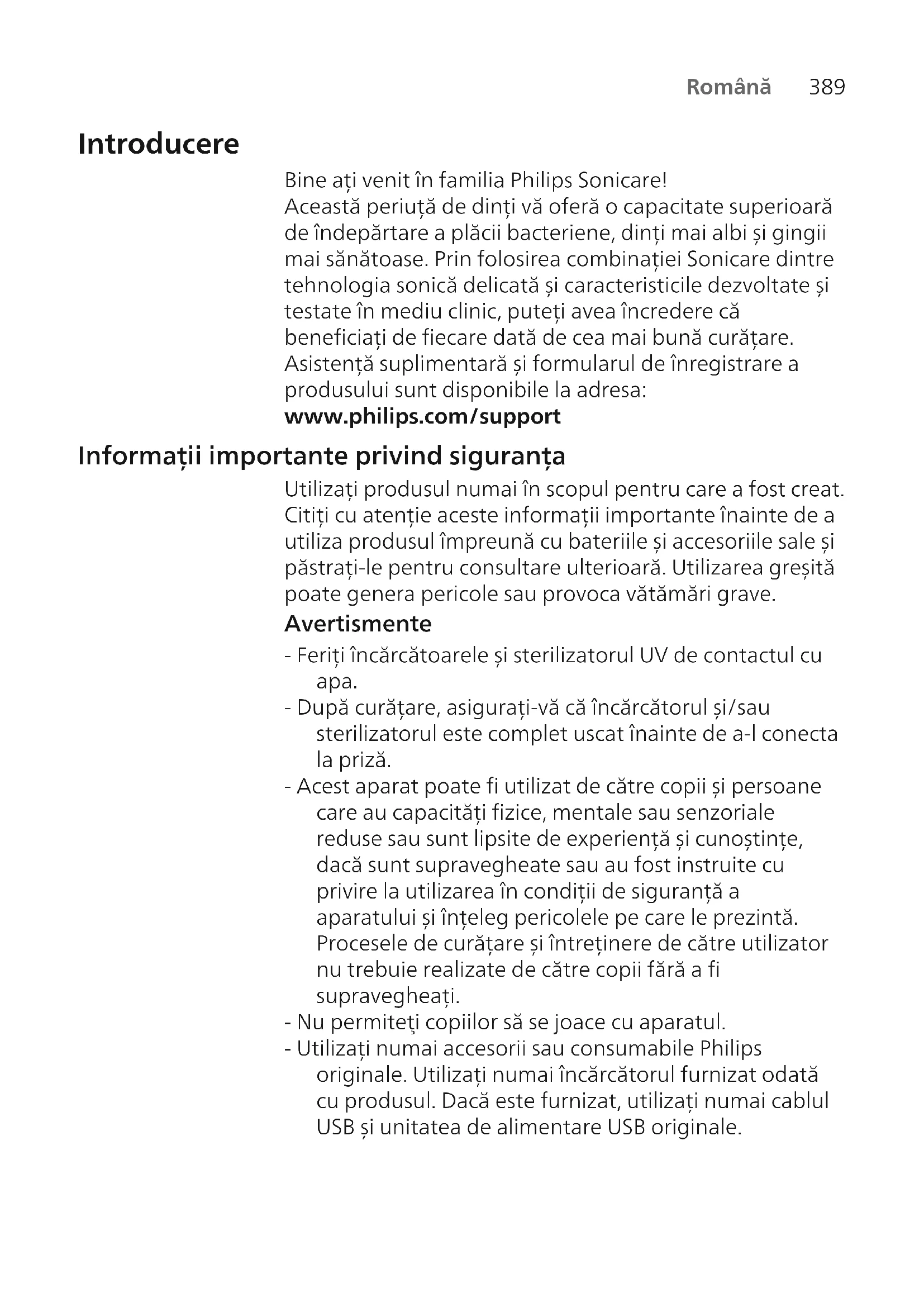 Română Introducere Bine ați venit în familia Philips Sonicare! Această periuță de dinți vă oferă o capacitate superioară de îndepărtare a plăcii bacteriene, dinți mai albi și gingii mai sănătoase. Prin folosirea combinației Sonicare dintre tehnologia sonică delicată și caracteristicile dezvoltate și testate în mediu clinic, puteți avea încredere că beneficiați de fiecare dată de cea mai bună curățare. Asistență suplimentară și formularul de înregistrare a produsului sunt disponibile la adresa: www.philips.com/support Informații importante privind siguranța Utilizați produsul numai în scopul pentru care a fost creat. Citiți cu atenție aceste informații importante înainte de a utiliza produsul împreună cu bateriile și accesoriile sale și păstrați-le pentru consultare ulterioară. Utilizarea greșită poate genera pericole sau provoca vătămări grave. Avertismente - Feriți încărcătoarele și sterilizatorul UV de contactul cu apa. - După curățare, asigurați-vă că încărcătorul și/sau sterilizatorul este complet uscat înainte de a-l conecta la priză. - Acest aparat poate fi utilizat de către copii și persoane care au capacități fizice, mentale sau senzoriale reduse sau sunt lipsite de experiență și cunoștințe, dacă sunt supravegheate sau au fost instruite cu privire la utilizarea în condiții de siguranță a aparatului și înțeleg pericolele pe care le prezintă. Procesele de curățare și întreținere de către utilizator nu trebuie realizate de către copii fără a fi supravegheați. - Nu permiteţi copiilor să se joace cu aparatul. - Utilizați numai accesorii sau consumabile Philips originale. Utilizați numai încărcătorul furnizat odată cu produsul. Dacă este furnizat, utilizați numai cablul USB și unitatea de alimentare USB originale.390 Română - Acest aparat nu conține piese care pot fi reparate de utilizator. Dacă aparatul este deteriorat, opriți utilizarea și contactați Centrul de asistență pentru clienți din țara dvs. Doar dispozitive cu cablu: Dacă cablul este deteriorat, înlocuiți încărcătorul cu sterilizator cu unul nou. - Nu utilizați încărcătorul și/sau sterilizatorul în aer liber sau în apropierea suprafețelor încălzite. - Nu spălați nicio parte componentă a produsului în mașina de spălat vase. - Acest aparat a fost conceput doar pentru curățarea dinților, gingiilor și limbii. - Nu lăsaţi niciodată sterilizatorul îndemâna copiilor. - Opriţi utilizarea sterilizatorului dacă becul cu lumină UV rămâne pornit atunci când uşa este deschisă. Lumina UV poate fi dăunătoare pentru ochi şi piele. - Utilizați sterilizatorul numai cu ecranul de protecție pe poziție. - Nu atingeți becul UV al sterilizatorului UV atunci când este fierbinte. - Întrerupeți utilizarea unui cap de periere dacă prezintă peri deformați sau îndoiți. Înlocuiți capul de periere la fiecare 3 luni sau mai des dacă apar indicii de uzură. - Evitaţi contactul direct cu produse care conţin uleiuri esenţiale sau ulei de cocos. Contactul poate conduce la dislocarea perilor. - Opriți utilizarea aparatului și consultați stomatologul/medicul dacă apar sângerări excesive după utilizare, dacă sângerarea continuă să apară după 1 săptămână de utilizare sau dacă prezentați disconfort sau durere. - Dacă ați suferit intervenții chirurgicale la gingii sau în cavitatea bucală în ultimele 2 luni, consultați medicul stomatolog înainte de a utiliza acest aparat. - Dacă aveți un stimulator cardiac sau alte dispozitive implantate, contactați medicul sau producătorul dispozitivului implantat, înainte de utilizare. - Dacă aveți probleme medicale, consultați medicul înainte de a utiliza acest aparat.391 Română - Acest aparat este un dispozitiv de îngrijire personală și nu este conceput pentru a fi utilizat de mai mulți pacienți într-un cabinet dentar sau o instituție de stomatologie. Instrucțiuni de siguranță privind bateriile - Acest aparat conține baterii care pot fi îndepărtate numai de către persoane calificate. - Utilizați produsul numai în scopul pentru care a fost creat. Citiți cu atenție aceste informații înainte de a utiliza produsul împreună cu bateriile și accesoriile sale și păstrați-le pentru consultare ulterioară. Utilizarea greșită poate genera pericole sau provoca vătămări grave. Accesoriile furnizate pot varia pentru produse diferite. - Utilizați numai accesorii și consumabile Philips originale. Utilizați numai unitatea de alimentare detașabilă TCBxxxx, HX6100, HX6110, HX6160 sau WAAxxxx. - Păstrați produsul și bateriile la distanță de foc și nu le expuneți la lumina directă a soarelui sau la temperaturi ridicate. - Dacă produsul se încălzește în mod anormal, emană un miros anormal, își schimbă culoarea sau dacă încărcarea sa durează mai mult decât de obicei, încetați utilizarea și încărcarea produsului și contactați Philips. - Nu așezați produsele și bateriile acestora în cuptoare cu microunde sau pe mașinile de gătit cu inducție. - Pentru a preveni încălzirea bateriilor sau eliberarea de substanțe toxice sau periculoase, nu deschideți, nu modificați, nu perforați, nu deteriorați și nu dezasamblați produsul sau bateria. Nu scurtcircuitați, nu supraîncărcați și nu încărcați invers bateriile. - Acest aparat conţine baterii care nu se pot înlocui. Când bateria a ajuns la sfârșitul duratei de utilizare, aparatul trebuie eliminat corespunzător, consultați secțiunea referitoare la reciclare. - Dacă bateriile sunt deteriorate sau prezintă scurgeri, evitați contactul cu pielea sau cu ochii. Dacă se întâmplă acest lucru, clătiți bine cu apă imediat și solicitați asistență medicală.392 Română - Atunci când manipulați baterii, asigurați-vă că mâinile dvs., produsul și bateriile sunt uscate. - Pentru a evita scurtcircu