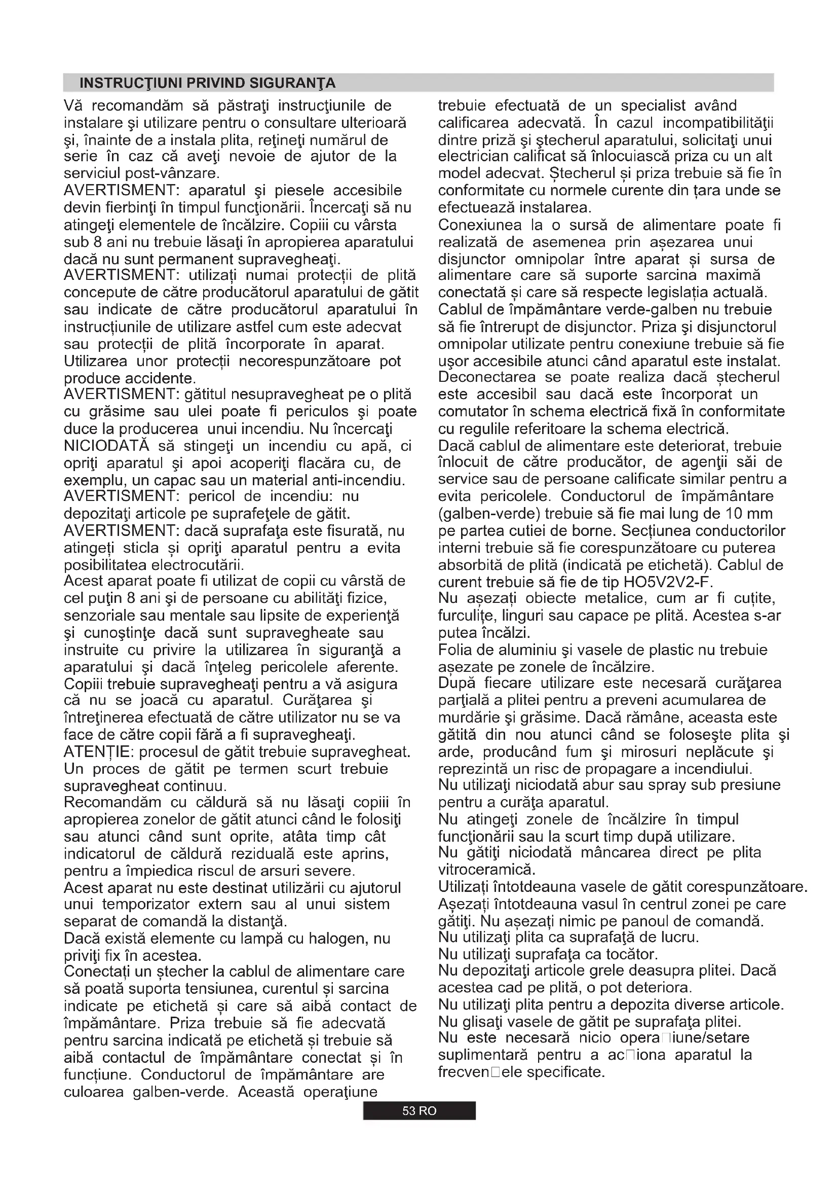 Vă recomandăm să păstrați instrucțiunile de instalare și utilizare pentru o consultare ulterioară și, înainte de a instala plita, rețineți numărul de serie în caz că aveți nevoie de ajutor de la serviciul post-vânzare.