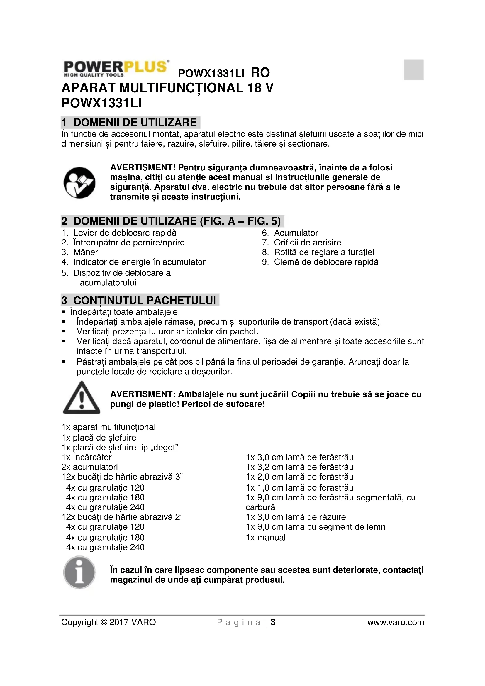 - Puneți mănuși de protecție pentru schimbarea accesoriilor. După o utilizare mai îndelungată accesoriile se înfierbântă.POWX1331LI RO Copyright © 2017 VARO P a g i n a | 7 www.varo.com