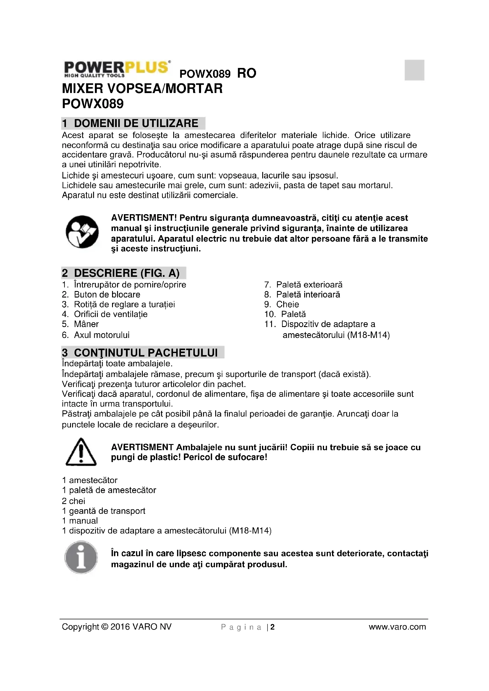 VARO N.V. - Joseph Van Instraat 9 - BE2500 Lier - BELGIA, declară că Produsul : Mixer Vopsea/Mortar marcă înregistrată: POWERplus model: POWX089 este în conformitate cu specificaţiile esenţiale şi alte prevederi relevante ale Directivelor Europene aplicabile, pe baza aplicării standardelor europene armonizate. Orice modificare neautorizată a aparatelor atrage după sine anularea acestei declaraţii. Directivele europene (inclusiv, dacă este cazul, amendamentele lor, până la data semnăturii); 2014/30/EU 2006/42/EC 2011/65/EU Standardele europene armonizate (inclusiv, dacă este cazul, amendamentele lor, până la data semnăturii); EN60745-1 : 2009 EN55014-1 : 2006 EN55014-2 : 1997 EN61000-3-2 : 2014 EN61000-3-3 : 2013 Persoana care păstrează documentaţia tehnică : Philippe Vankerkhove, VARO – Vic. Van Rompuy N.V. Subsemnatul acţionează în numele Directorului general executiv al societăţii, Hugo Cuypers Divizia de reglementare – Director de conformitate Data: 01/12/2016POWX089 HU Copyright © 2016 VARO NV O l d a l | 1 www.varo.com 1 BERENDEZÉS ................................................................................ 2