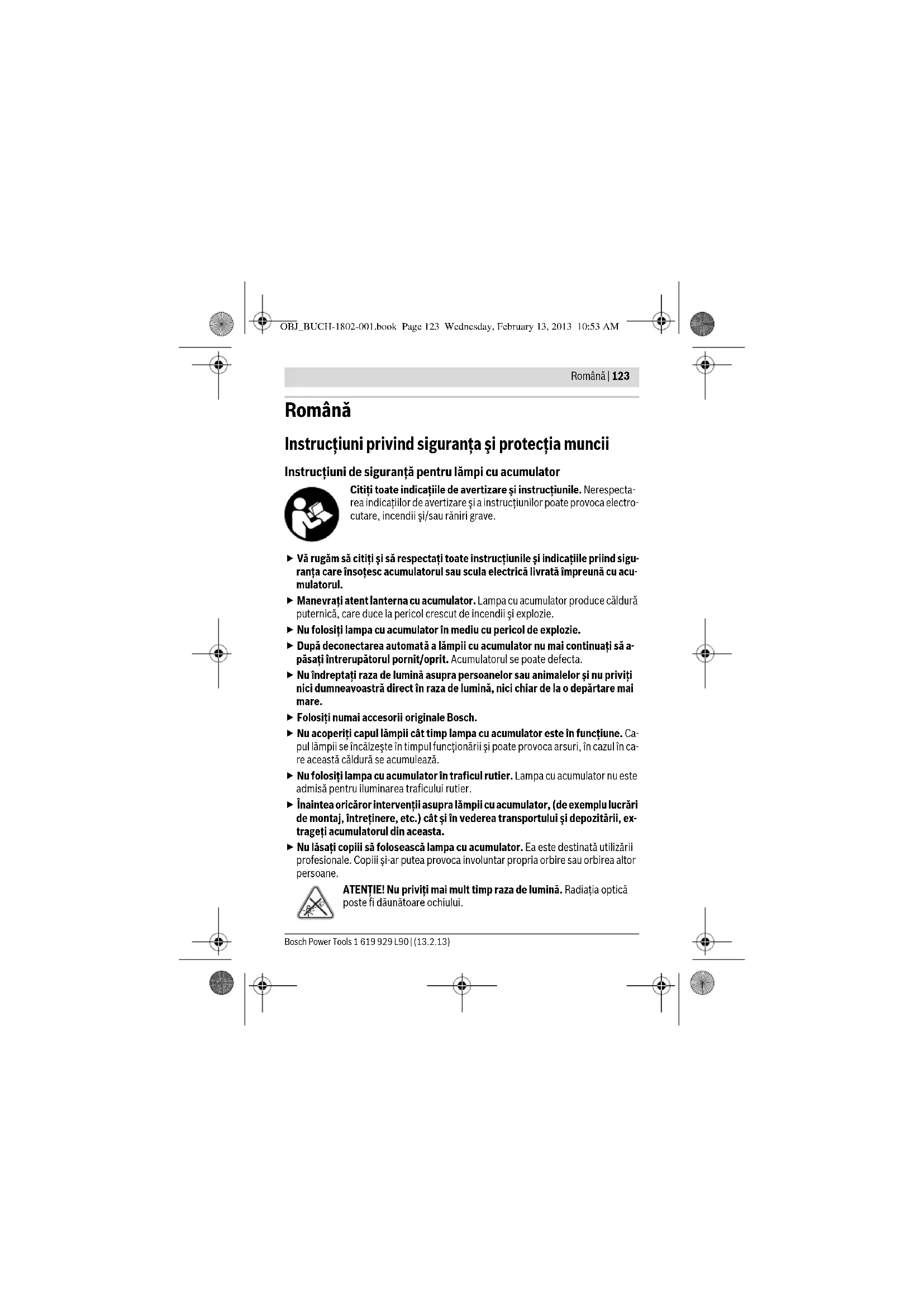 Техникалық өзгерістер енгізу құқығы сақталады. OBJ_BUCH-1802-001.book Page 122 Wednesday, February 13, 2013 10:53 AMRomână | 123 Bosch Power Tools 1 619 929 L90 | (13.2.13) Română Instrucţiuni privind siguranţa şi protecţia muncii Instrucţiuni de siguranţă pentru lămpi cu acumulator Citiţi toate indicaţiile de avertizare şi instrucţiunile. Nerespecta- rea indicaţiilor de avertizare şi a instrucţiunilor poate provoca electro- cutare, incendii şi/sau răniri grave. Vă rugăm să citiţi şi să respectaţi toate instrucţiunile şi indicaţiile priind sigu- ranţa care însoţesc acumulatorul sau scula electrică livrată împreună cu acu- mulatorul. Manevraţi atent lanterna cu acumulator. Lampa cu acumulator produce căldură puternică, care duce la pericol crescut de incendii şi explozie. Nu folosiţi lampa cu acumulator în mediu cu pericol de explozie. După deconectarea automată a lămpii cu acumulator nu mai continuaţi să a- păsaţi întrerupătorul pornit/oprit. Acumulatorul se poate defecta. Nu îndreptaţi raza de lumină asupra persoanelor sau animalelor şi nu priviţi nici dumneavoastră direct în raza de lumină, nici chiar de la o depărtare mai mare. Folosiţi numai accesorii originale Bosch. Nu acoperiţi capul lămpii cât timp lampa cu acumulator este în funcţiune. Ca- pul lămpii se încălzeşte în timpul funcţionării şi poate provoca arsuri, în cazul în ca- re această căldură se acumulează. Nu folosiţi lampa cu acumulator în traficul rutier. Lampa cu acumulator nu este admisă pentru iluminarea traficului rutier. Înaintea oricăror intervenţii asupra lămpii cu acumulator, (de exemplu lucrări de montaj, întreţinere, etc.) cât şi în vederea transportului şi depozitării, ex- trageţi acumulatorul din aceasta. Nu lăsaţi copiii să folosească lampa cu acumulator. Ea este destinată utilizării profesionale. Copiii şi-ar putea provoca involuntar propria orbire sau orbirea altor persoane. ATENŢIE! Nu priviţi mai mult timp raza de lumină. Radiaţia optică poste fi dăunătoare ochiului. OBJ_BUCH-1802-001.book Page 123 Wednesday, February 13, 2013 10:53 AM124 | Română 1 619 929 L90 | (13.2.13) Bosch Power Tools Nu deschideţi acumulatorul. Există pericol de scurtcircuit. Feriţi acumulatorul de căldură, de asemeni de ex. de radiaţii solare continue, foc, apă şi umezeală. Există pericol de explozie. Feriţi acumulatorii nefolosiţi de agrafele de birou, monede, chei, cuie, şuru- buri sau alte obiecte metalice mici, care ar putea provoca şuntarea contacte- lor. Un scurtcircuit între contactele acumulatorului poate duce la arsuri sau incen- diu. În caz de utilizare greşită, din acumulator se poate scurge lichid. Evitaţi con- tactul cu acesta. În caz de contact accidental clătiţi bine cu apă. Dacă lichidul vă intră în ochi, consultaţi şi un medic. Lichidul scurs din acumulator poate duce la iritaţii ale pielii sau la arsuri. În cazul deteriorării sau utilizării necorespunzătoare a acumulatorului se pot degaja vapori. Aerisiţi cu aer proaspăt iar dacă vi se face rău consultaţi un me- dic. Vaporii pot irita căile respiratorii. Încărcaţi acumulatorii numai în încărcătoarele recomandate de producător. Dacă un încărcător destinat unui anumit tip de acumulator este folosit la încărcarea altor tipuri de acumulator decât cele prevăzute pentru el, există pericol de incen- diu. Folosiţi acumulatorul numai împreună cu scula dunmneavoastră electrică Bosch. Numai astfel acumulatorul va fi protejat împotriva suprasolicitării pericu- loase. Folosiţi numai acumulatori originali Bosch având tensiunea specificată pe plăcuţa indicatoare a tipului lămpii dumneavoastră cu acumulator Bosch. În cazul utilizării altor acumulatori, de exemplu produse contrafăcute, acumulatori modificaţi sau de fabricaţie străină, există pericol de vătămări corporale sau pagu- be materiale cauzate de explozia acumulatorilor. Descrierea produsului şi a performanţelor Utilizare conform destinaţiei Lampa cu acumulator este destinată iluminării manuale, a unor spaţii limitate, în loca- ţii uscate. Elemente componente Numerotarea elementelor componente se referă la schiţa lanternei cu acumulator de la pagina grafică. 1 Capul lămpii OBJ_BUCH-1802-001.book Page 124 Wednesday, February 13, 2013 10:53 AMRomână | 125 Bosch Power Tools 1 619 929 L90 | (13.2.13) 2 Întrerupător pornit/oprit 3 Acumulator* 4 Tastă deblocare acumulator* *Accesoriile ilustrate sau descrise nu sunt cuprinse în setul de livrare standard. Puteţi găsi accesoriile complete în programul nostru de accesorii. Date tehnice Montare Încărcarea acumulatorului (accesoriu) (vezi figura A) Folosiţi numai încărcătoarele menţionate la pagina de accesorii. Numai aceste încărcătoare sunt adecvate pentru acumulatorul litiu-ion utilizat la lanterna dum- neavoastră cu acumulator. Indicaţie: Acumulatorul se livrează parţial încărcat. Pentru a asigura funcţionarea la capacitatea nominală a acumulatorului, înainte de prima utilizare încărcaţi complet acumulatorul în încărcător. Acumulatorul cu tehnologie litiu-ion poate fi încărcat în orice moment, fără ca prin a- ceasta să i se reducă durata de viaţă. O întrerupere a procesului de încărcare nu dău- nează acumulatorului. Acumulatorul litiu-ion este protejat împotriva descărcării profunde prin intermediul sistemului „Electronic Cell Protection (ECP)“. Atunci când acumulatorul este descăr- cat, lanterna cu acumulator este deconectată de un circuit de protecţie. După deconectarea automată a lanternei cu acumulator nu mai apăsaţi în conti- nuare întrerupătorul pornit/oprit. Aceasta ar putea afecta acumulatorul. Pentru extragerea acumulatorului 3 apăsaţi tastele de deblocare 4 şi extrageţi acumu- latorul trăgându-l spre spate din lanterna cu acumulator. Nu forţaţi. Lante
