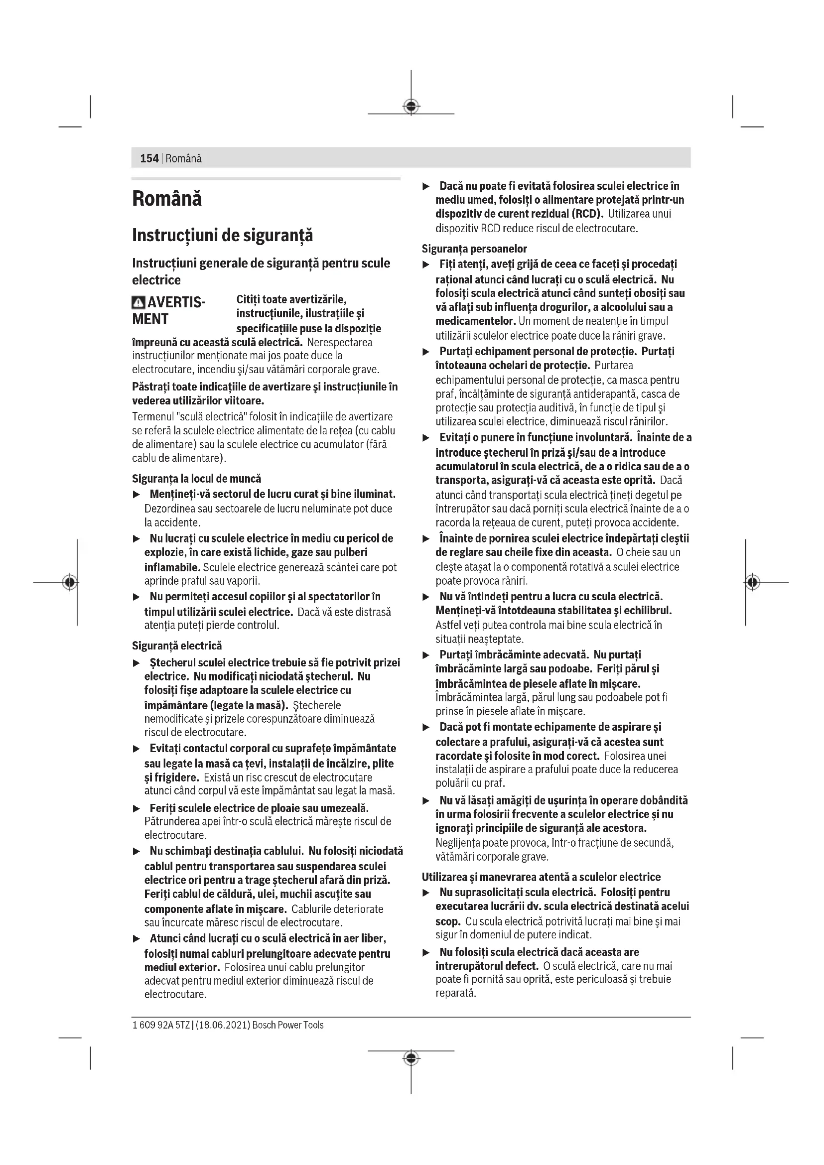 Бұл литий-иондық аккумуляторлар қауіпті тауарларға қойылатын талаптарға сай болуы керек. Пайдаланушы аккумуляторларды көшеде қосымша құжаттарсыз тасымалдай алады. Үшінші тұлғалар (мысалы, әуе көлігі немесе жіберу) орамаға және маркаларға қойылатын арнайы талаптарды сақтау керек. Жіберуге дайындау кезінде қауіпті жүктерді тасымалдау маманымен хабарласу керек. Аккумуляторды корпусы зақымдалған болса ғана жіберіңіз. Ашық түйіспелерді желімдеңіз және аккумуляторды орамада қозғалмайтындай ораңыз. Қажет болса, қосымша ұлттық ережелерді сақтаңыз. Кәдеге жарату Электр құралдарды, аккумуляторларды, керек-жарақтарды және орау материалдарын экологиялық тұрғыдан дұрыс утилизациялауға тапсыру керек. Электр құралдарды және аккумуляторларды/ батареяларды үй қоқысына тастамаңыз! Тек қана ЕО елдері үшін: Еуропа 2012/19/EU ережесі бойынша жарамсыз электр құралдары және Еуропа 2006/66/EC ережесі бойынша зақымдалған немесе ескі аккумулятор/батареялар бөлек жиналып кәдеге жаратылуы қажет. Аккумуляторлар/батареялар: Литий-иондық: Тасымалдау бөліміндегі нұсқауларды орындаңыз (қараңыз „Тасымалдау“, Бет153). Bosch Power Tools 1 609 92A 5TZ | (18.06.2021)154 | Română Română Instrucţiuni de siguranţă Instrucţiuni generale de siguranţă pentru scule electrice AVERTIS- MENT Citiţi toate avertizările, instrucţiunile, ilustraţiile şi specificaţiile puse la dispoziţie împreună cu această sculă electrică. Nerespectarea instrucţiunilor menţionate mai jos poate duce la electrocutare, incendiu şi/sau vătămări corporale grave. Păstraţi toate indicaţiile de avertizare şi instrucţiunile în vederea utilizărilor viitoare. Termenul "sculă electrică" folosit în indicaţiile de avertizare se referă la sculele electrice alimentate de la reţea (cu cablu de alimentare) sau la sculele electrice cu acumulator (fără cablu de alimentare). Siguranţa la locul de muncă u Menţineţi‑vă sectorul de lucru curat şi bine iluminat. Dezordinea sau sectoarele de lucru neluminate pot duce la accidente. u Nu lucraţi cu sculele electrice în mediu cu pericol de explozie, în care există lichide, gaze sau pulberi inflamabile. Sculele electrice generează scântei care pot aprinde praful sau vaporii. u Nu permiteţi accesul copiilor şi al spectatorilor în timpul utilizării sculei electrice. Dacă vă este distrasă atenţia puteţi pierde controlul. Siguranţă electrică u Ştecherul sculei electrice trebuie să fie potrivit prizei electrice. Nu modificaţi niciodată ştecherul. Nu folosiţi fişe adaptoare la sculele electrice cu împământare (legate la masă). Ştecherele nemodificate şi prizele corespunzătoare diminuează riscul de electrocutare. u Evitaţi contactul corporal cu suprafeţe împământate sau legate la masă ca ţevi, instalaţii de încălzire, plite şi frigidere. Există un risc crescut de electrocutare atunci când corpul vă este împământat sau legat la masă. u Feriţi sculele electrice de ploaie sau umezeală. Pătrunderea apei într‑o sculă electrică măreşte riscul de electrocutare. u Nu schimbaţi destinaţia cablului. Nu folosiţi niciodată cablul pentru transportarea sau suspendarea sculei electrice ori pentru a trage ştecherul afară din priză. Feriţi cablul de căldură, ulei, muchii ascuţite sau componente aflate în mişcare. Cablurile deteriorate sau încurcate măresc riscul de electrocutare. u Atunci când lucraţi cu o sculă electrică în aer liber, folosiţi numai cabluri prelungitoare adecvate pentru mediul exterior. Folosirea unui cablu prelungitor adecvat pentru mediul exterior diminuează riscul de electrocutare. u Dacă nu poate fi evitată folosirea sculei electrice în mediu umed, folosiţi o alimentare protejată printr-un dispozitiv de curent rezidual (RCD). Utilizarea unui dispozitiv RCD reduce riscul de electrocutare. Siguranţa persoanelor u Fiţi atenţi, aveţi grijă de ceea ce faceţi şi procedaţi raţional atunci când lucraţi cu o sculă electrică. Nu folosiţi scula electrică atunci când sunteţi obosiţi sau vă aflaţi sub influenţa drogurilor, a alcoolului sau a medicamentelor. Un moment de neatenţie în timpul utilizării sculelor electrice poate duce la răniri grave. u Purtaţi echipament personal de protecţie. Purtaţi întoteauna ochelari de protecţie. Purtarea echipamentului personal de protecţie, ca masca pentru praf, încălţăminte de siguranţă antiderapantă, casca de protecţie sau protecţia auditivă, în funcţie de tipul şi utilizarea sculei electrice, diminuează riscul rănirilor. u Evitaţi o punere în funcţiune involuntară. Înainte de a introduce ştecherul în priză şi/sau de a introduce acumulatorul în scula electrică, de a o ridica sau de a o transporta, asiguraţi‑vă că aceasta este oprită. Dacă atunci când transportaţi scula electrică ţineţi degetul pe întrerupător sau dacă porniţi scula electrică înainte de a o racorda la reţeaua de curent, puteţi provoca accidente. u Înainte de pornirea sculei electrice îndepărtaţi cleştii de reglare 