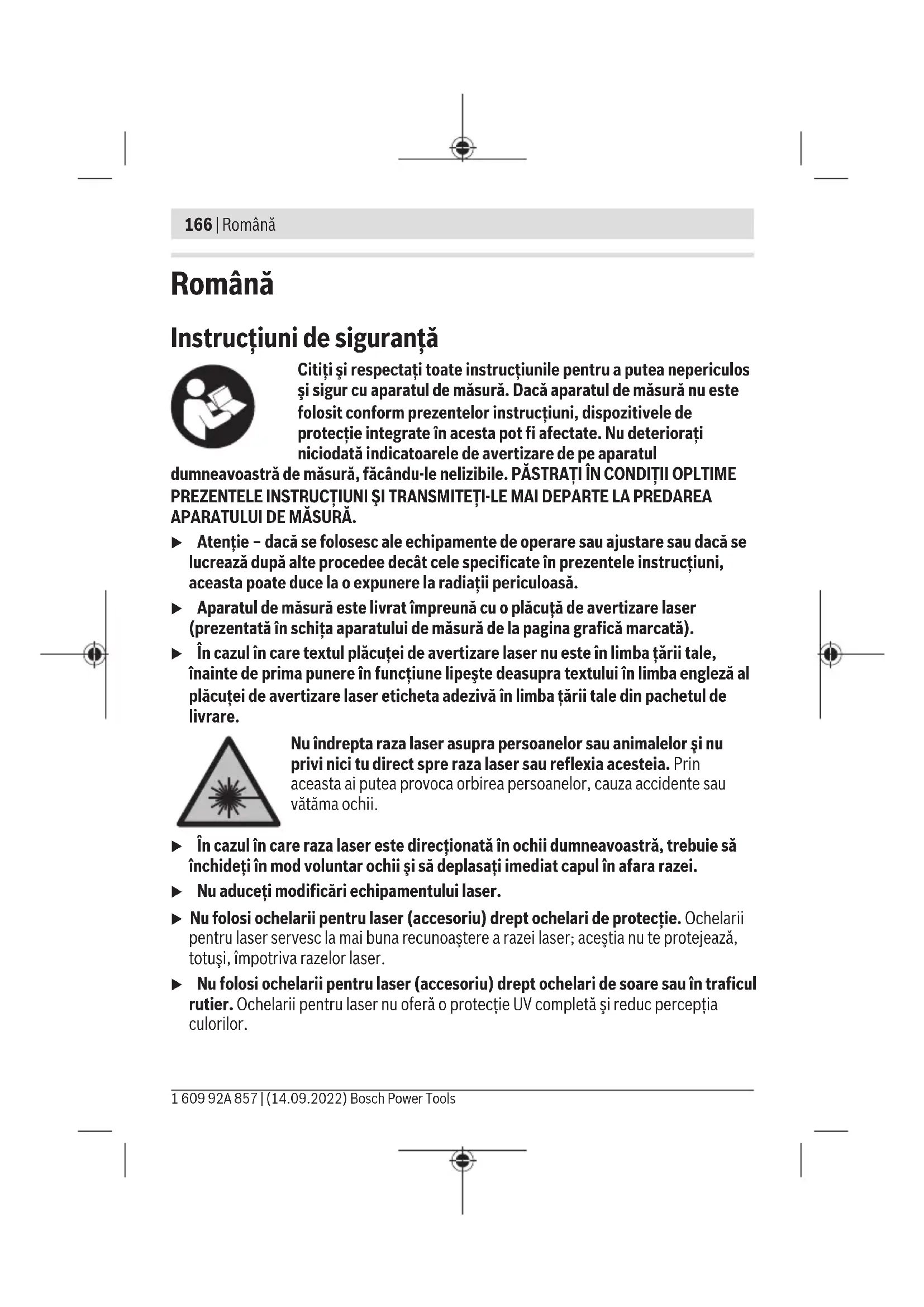 www.bosch-pt.com/serviceaddresses Кәдеге жарату Өлшеу құралын, оның жабдықтары мен қаптамасын қоршаған ортаны қорғайтын кәдеге жарату орнына тапсыру қажет. Қлшеу құралдарын не батареяларды үй қоқысына тастамаңыз! Тек қана ЕО елдері үшін: Ескі электрлік және электрондық құрылғылар туралы 2012/19/EU еуропалық директивасы және оның ұлттық заңнамада қолданылуы бойынша пайдалануға бұдан былай жарамсыз өлшеу құралдарын және 2006/66/ЕC еуропалық директивасы бойынша зақымдалған немесе ескірген аккумуляторларды/батареяларды бөлек жинап, қоршаған орта үшін қауіпсіз жолмен қайта өңдеуге жіберу қажет. Қате жолмен кәдеге жаратылған ескі электрлік және электрондық құрылғылар қауіпті заттардың болу мүмкіндігіне байланысты қоршаған ортаға және адам денсаулығына зиянды әсер тигізуі мүмкін. Bosch Power Tools 1 609 92A 857 | (14.09.2022)166 | Română Română Instrucţiuni de siguranţă Citiţi şi respectaţi toate instrucţiunile pentru a putea nepericulos şi sigur cu aparatul de măsură. Dacă aparatul de măsură nu este folosit conform prezentelor instrucţiuni, dispozitivele de protecţie integrate în acesta pot fi afectate. Nu deterioraţi niciodată indicatoarele de avertizare de pe aparatul dumneavoastră de măsură, făcându-le nelizibile. PĂSTRAŢI ÎN CONDIŢII OPLTIME PREZENTELE INSTRUCŢIUNI ŞI TRANSMITEŢI-LE MAI DEPARTE LA PREDAREA APARATULUI DE MĂSURĂ. u Atenţie – dacă se folosesc ale echipamente de operare sau ajustare sau dacă se lucrează după alte procedee decât cele specificate în prezentele instrucţiuni, aceasta poate duce la o expunere la radiaţii periculoasă. u Aparatul de măsură este livrat împreună cu o plăcuţă de avertizare laser (prezentată în schiţa aparatului de măsură de la pagina grafică marcată). u În cazul în care textul plăcuţei de avertizare laser nu este în limba ţării tale, înainte de prima punere în funcţiune lipeşte deasupra textului în limba engleză al plăcuţei de avertizare laser eticheta adezivă în limba ţării tale din pachetul de livrare. Nu îndrepta raza laser asupra persoanelor sau animalelor şi nu privi nici tu direct spre raza laser sau reflexia acesteia. Prin aceasta ai putea provoca orbirea persoanelor, cauza accidente sau vătăma ochii. u În cazul în care raza laser este direcţionată în ochii dumneavoastră, trebuie să închideţi în mod voluntar ochii şi să deplasaţi imediat capul în afara razei. u Nu aduceţi modificări echipamentului laser. u Nu folosi ochelarii pentru laser (accesoriu) drept ochelari de protecţie. Ochelarii pentru laser servesc la mai buna recunoaştere a razei laser; aceştia nu te protejează, totuşi, împotriva razelor laser. u Nu folosi ochelarii pentru laser (accesoriu) drept ochelari de soare sau în traficul rutier. Ochelarii pentru laser nu oferă o protecţie UV completă şi reduc percepţia culorilor. 1 609 92A 857 | (14.09.2022) Bosch Power ToolsRomână | 167 u Nu permiteţi repararea aparatului de măsură decât de către personal de specialitate corespunzător calificat şi numai cu piese de schimb originale. Numai în acest mod poate fi garantată siguranţa de exploatare a aparatului de măsură. u Nu lăsaţi copiii să folosească nesupravegheaţi aparatul de măsură cu laser. Ei ar putea provoca involuntar orbirea altor persoane sau a lor înşile. u Nu lucraţi cu aparatul de măsură în mediu cu pericol de explozie în care se află lichide, gaze sau pulberi inflamabile. În aparatul de măsură se pot produce scântei care să aprindă praful sau vaporii. Descrierea produsului şi a performanțelor sale Ţineţi cont de ilustraţiile din secţiunea anterioară a instrucţiunilor de utilizare. Utilizarea conform destinaţiei Aparatul de măsură este destinat proiectării şi verificării de linii orizontale şi verticale, precum şi de puncte pe direcţia normalei. Aparatul de măsură este destinat utilizării în mediul interior. Acest produs este un dispozitiv laser de consum conform EN50689. Componentele ilustrate Numerotarea componentelor ilustrate se referă la schiţa aparatului de măsură de la pagina grafică. (1) Orificiu de ieşire a liniei laser (2) Comutator de pornire/oprire (3) Tastă pentru modul de funcţionare Laser (4) Indicator privind descărcarea bateriilor (5) Indicator mod de funcţionare Laser (6) Număr de serie (7) Plăcuţă de avertizare laser (8) Dispozitiv de blocare a capacului compartimentului pentru baterii (9) Capac al compartimentului pentru baterii (10) Orificiu de 1/4" de prindere pe stativ (11) Stativ