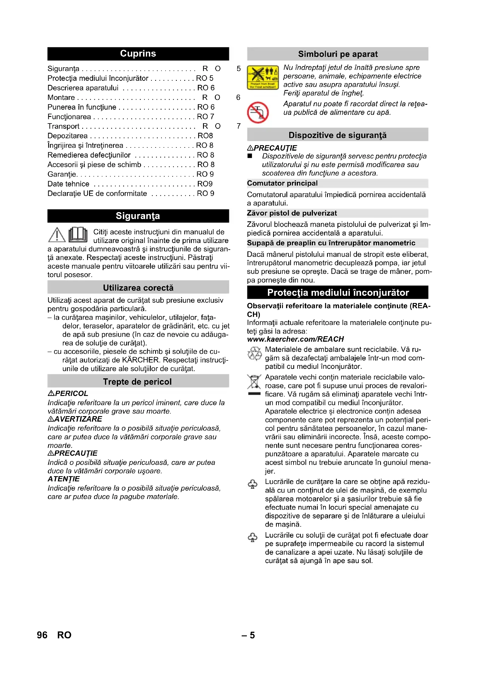 90 dB(A) Zastrzega się prawo wprowadzania zmian technicznych. Deklaracja zgodności UE Produkt: Myjka wysokociśnieniowa Typ: 1.676-xxx Obowiązujące dyrektywy UE 2000/14/WE 2014/30/UE 2006/42/WE (+2009/127/WE) 2011/65/UE Zastosowane normy zharmonizowane EN 50581 EN 55014–1: 2006+A1: 2009+A2: 2011 EN 55014–2: 2015 EN 60335–1 EN 60335–2–79 EN 61000–3–2: 2014 EN 61000–3–3: 2013 EN 62233: 2008 Zastosowana metoda oceny zgodności 2000/14/WE: Załącznik V Poziom mocy akustycznej dB(A) Zmierzony: 88 Gwarantowany: 90 Winnenden, 2016/04/01 CEO Head of Approbation 95PL– 5 Citiţi aceste instrucţiuni din manualul de utilizare original înainte de prima utilizare a aparatului dumneavoastră şi instrucţiunile de siguran- ţă anexate. Respectaţi aceste instrucţiuni. Păstraţi aceste manuale pentru viitoarele utilizări sau pentru vii- torul posesor. Utilizaţi acest aparat de curăţat sub presiune exclusiv pentru gospodăria particulară. – la curăţarea maşinilor, vehiculelor, utilajelor, faţa- delor, teraselor, aparatelor de grădinărit, etc. cu jet de apă sub presiune (în caz de nevoie cu adăuga- rea de soluţie de curăţat). – cu accesoriile, piesele de schimb şi soluţiile de cu- răţat autorizaţi de KÄRCHER. Respectaţi instrucţi- unile de utilizare ale soluţiilor de curăţat. PERICOL Indicaţie referitoare la un pericol iminent, care duce la vătămări corporale grave sau moarte. 몇 AVERTIZARE Indicaţie referitoare la o posibilă situaţie periculoasă, care ar putea duce la vătămări corporale grave sau moarte. 몇 PRECAUŢIE Indică o posibilă situaţie periculoasă, care ar putea duce la vătămări corporale uşoare. ATENŢIE Indicaţie referitoare la o posibilă situaţie periculoasă, care ar putea duce la pagube materiale. 몇 PRECAUŢIE Dispozitivele de siguranţă servesc pentru protecţia utilizatorului şi nu este permisă modificarea sau scoaterea din funcţiune a acestora. Comutatorul aparatului împiedică pornirea accidentală a aparatului. Zăvorul blochează maneta pistolului de pulverizat şi îm- piedică pornirea accidentală a aparatului. Dacă mânerul pistolului manual de stropit este eliberat, întrerupătorul manometric decuplează pompa, iar jetul sub presiune se opreşte. Dacă se trage de mâner, pom- pa porneşte din nou. Observaţii referitoare la materialele conţinute (REA- CH) Informaţii actuale referitoare la materialele conţinute pu- teţi găsi la adresa: www.kaercher.com/REACH Cuprins Siguranţa . . . . . . . . . . . . . . . . . . . . . . . . . . . .RO 5 Protecţia mediului înconjurător . . . . . . . . . . . RO 5 Descrierea aparatului . . . . . . . . . . . . . . . . . . RO 6 Montare . . . . . . . . . . . . . . . . . . . . . . . . . . . . .RO 6 Punerea în funcţiune . . . . . . . . . . . . . . . . . . . RO 6 Funcţionarea . . . . . . . . . . . . . . . . . . . . . . . . . RO 7 Transport . . . . . . . . . . . . . . . . . . . . . . . . . . . .RO 7 Depozitarea . . . . . . . . . . . . . . . . . . . . . . . . . . RO8 Îngrijirea şi întreţinerea . . . . . . . . . . . . . . . . . RO 8 Remedierea defecţiunilor . . . . . . . . . . . . . . . RO 8 Accesorii şi piese de schimb . . . . . . . . . . . . . RO 8 Garanţie. . . . . . . . . . . . . . . . . . . . . . . . . . . . . RO 9 Date tehnice . . . . . . . . . . . . . . . . . . . . . . . . . RO9 Declaraţie UE de conformitate . . . . . . . . . . . RO 9 Siguranţa Utilizarea corectă Trepte de pericol Simboluri pe aparat Nu îndreptaţi jetul de înaltă presiune spre persoane, animale, echipamente electrice active sau asupra aparatului însuşi. Feriţi aparatul de îngheţ. Aparatul nu poate fi racordat direct la reţea- ua publică de alimentare cu apă. Dispozitive de siguranţă Comutator principal Zăvor pistol de pulverizat Supapă de preaplin cu întrerupător manometric Protecţia mediului înconjurător Materialele de ambalare sunt reciclabile. Vă ru- găm să dezafectaţi ambalajele într-un mod com- patibil cu mediul înconjurător. Aparatele vechi conţin materiale reciclabile valo- roase, care pot fi supuse unui proces de revalori- ficare. Vă rugăm să eliminaţi aparatele vechi într- un mod compatibil cu mediul înconjurător. Aparatele electrice și electronice conțin adesea componente care pot reprezenta un potențial peri- col pentru sănătatea persoanelor, în cazul mane- vrării sau eliminării incorecte. Însă, aceste compo- nente sunt necesare pentru funcționarea cores- punzătoare a aparatului. Aparatele marcate cu acest simbol nu trebuie aruncate în gunoiul mena- jer. Lucrările de curăţare la care se obţine apă rezidu- ală cu un conţinut de ulei de maşină, de exemplu spălarea motoarelor şi a şasiurilor trebuie să fie efectuate numai în locuri special amenajate cu dispozitive de separare şi de înlăturare a uleiului de maşină. Lucrările cu soluţii de curăţat pot fi efectuate doar pe suprafeţe impermeabile cu racord la sistemul de canalizare a apei uzate. Nu lăsaţi soluţiile de curăţat să ajungă în ape sau sol. 96 RO– 6 În acest manual este descrisă dotarea maximă. În func- ţie de model pachetele de livrare pot diferi (vezi amba- lajul). Pachetul de livrare a aparatului dvs. este ilustrat pe am- balaj. La despachetare, verificaţi dacă conţinutul pache- tului este complet. Informaţi imediat distribuitorul dumneavoastră dacă lip- sesc părţi componente sau dacă intervin defecţiuni la transport. Pentru imagini vezi pagina interioară! 1 Racord de presiune înaltă 2 Comutatorul aparatului „0/OFF“ / „I/ON“ 3 Cârlig de depozitare pentru cablu de alimentare 4 Spaţiu de depozitare pentru furtunul de presiune 5 Mâner pentru transport 6 Racord de apă cu sită inclusă 7 Furtun de aspirare a detergentului, cu filtru de de- tergent şi capac 8 Rezervorul pentru soluţia de curăţat 9 Piesă de cuplare pentru conexiunea de apă 10 Spaţiu de depozitare pentru lance 11 Spaţiu de de