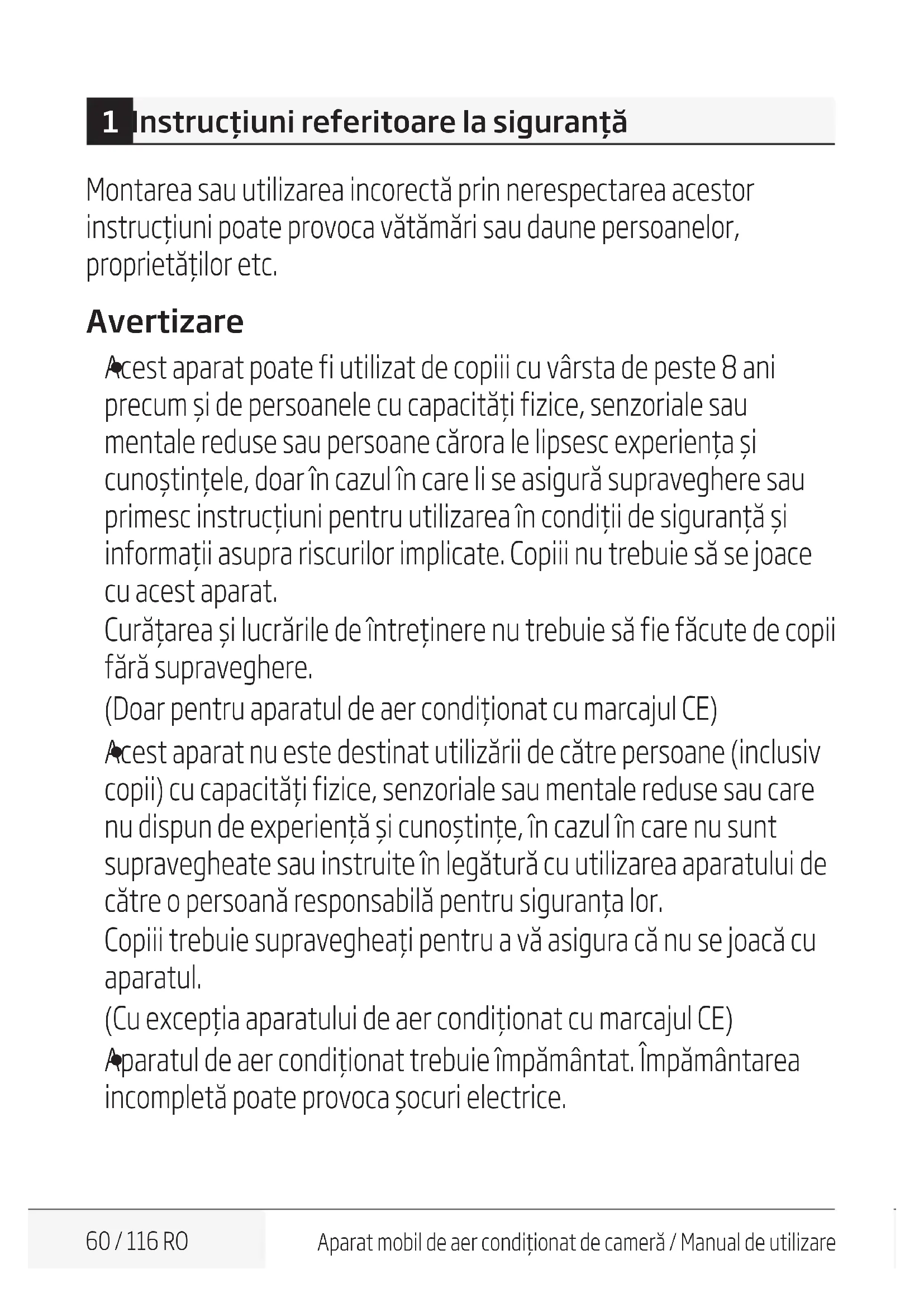 Acest aparat poate fi utilizat de copiii cu vârsta de peste 8 ani precum și de persoanele cu capacități fizice, senzoriale sau mentale reduse sau persoane cărora le lipsesc experiența și cunoștințele, doar în cazul în care li se asigură supraveghere sau primesc instrucțiuni pentru utilizarea în condiții de siguranță și informații asupra riscurilor implicate. Copiii nu trebuie să se joace cu acest aparat. Curățarea și lucrările de întreținere nu trebuie să fie făcute de copii fără supraveghere. (Doar pentru aparatul de aer condiţionat cu marcajul CE)