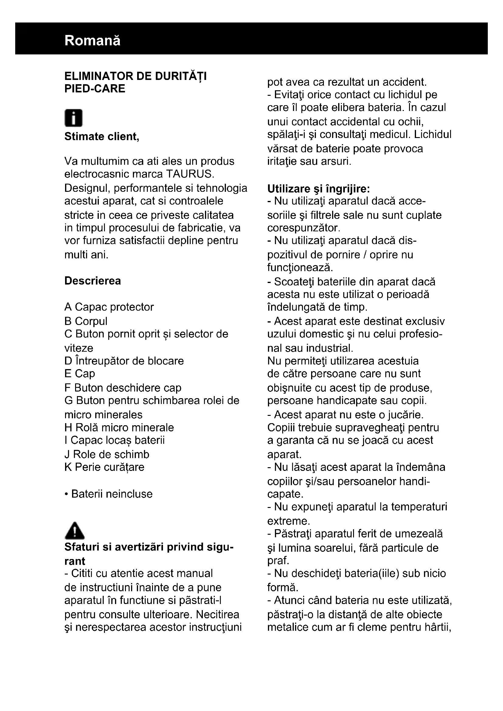 PIED-CARE Stimate client, Va multumim ca ati ales un produs electrocasnic marca TAURUS. Designul, performantele si tehnologia acestui aparat, cat si controalele stricte in ceea ce priveste calitatea in timpul procesului de fabricatie, va vor furniza satisfactii depline pentru multi ani. Descrierea A Capac protector B Corpul C Buton pornit oprit și selector de viteze D Întreupător de blocare E Cap F Buton deschidere cap G Buton pentru schimbarea rolei de micro minerales H Rolă micro minerale I Capac locaș baterii J Role de schimb K Perie curățare