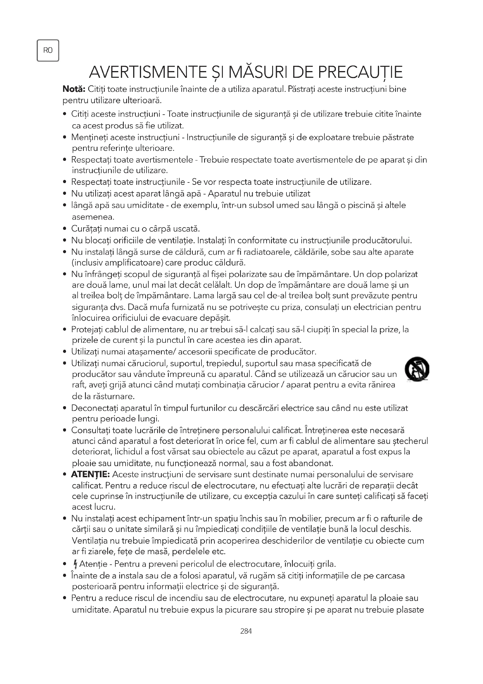 - Pentru a reduce riscul de incendiu sau de electrocutare, nu expuneți aparatul la ploaie sau umiditate. Aparatul nu trebuie expus la picurare sau stropire și pe aparat nu trebuie plasate285