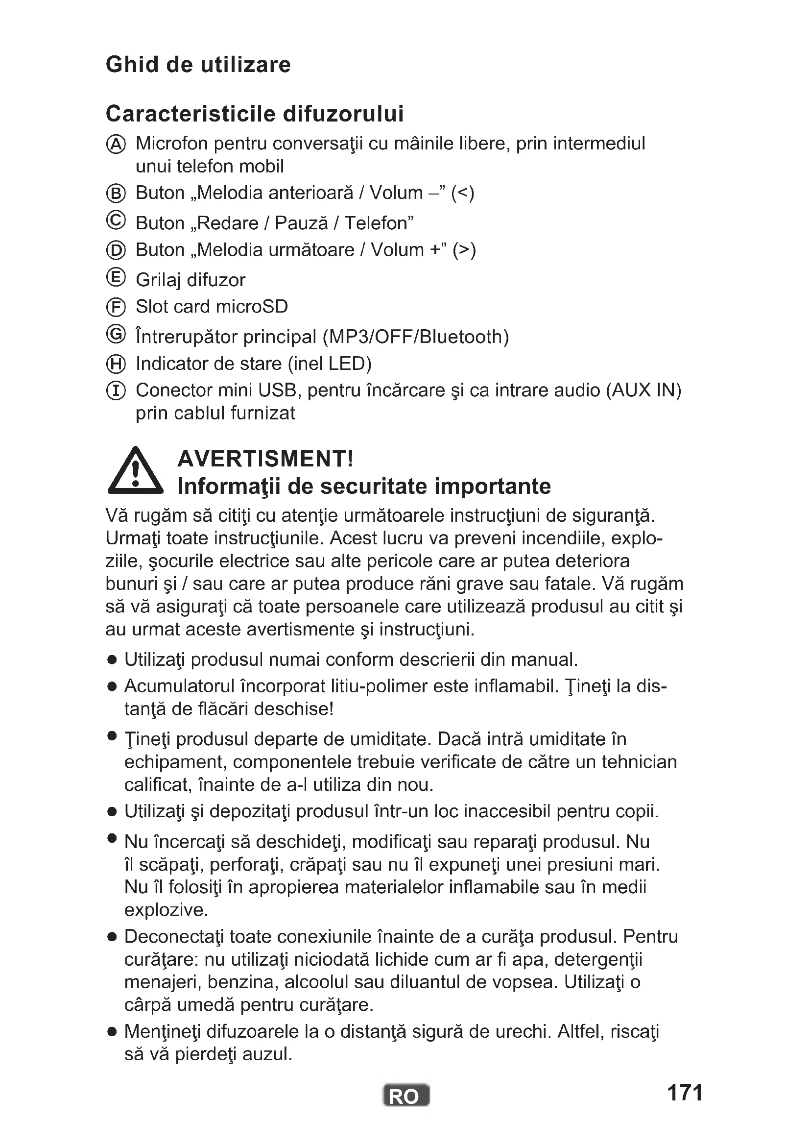 Conector mini USB, pentru încărcare şi ca intrare audio (AUX IN) prin cablul furnizat AVERTISMENT! Informaţii de securitate importante Vă rugăm să citiţi cu atenţie următoarele instrucţiuni de siguranţă. Urmaţi toate instrucţiunile. Acest lucru va preveni incendiile, explo- ziile, şocurile electrice sau alte pericole care ar putea deteriora bunuri şi / sau care ar putea produce răni grave sau fatale. Vă rugăm să vă asiguraţi că toate persoanele care utilizează produsul au citit şi au urmat aceste avertismente şi instrucţiuni.