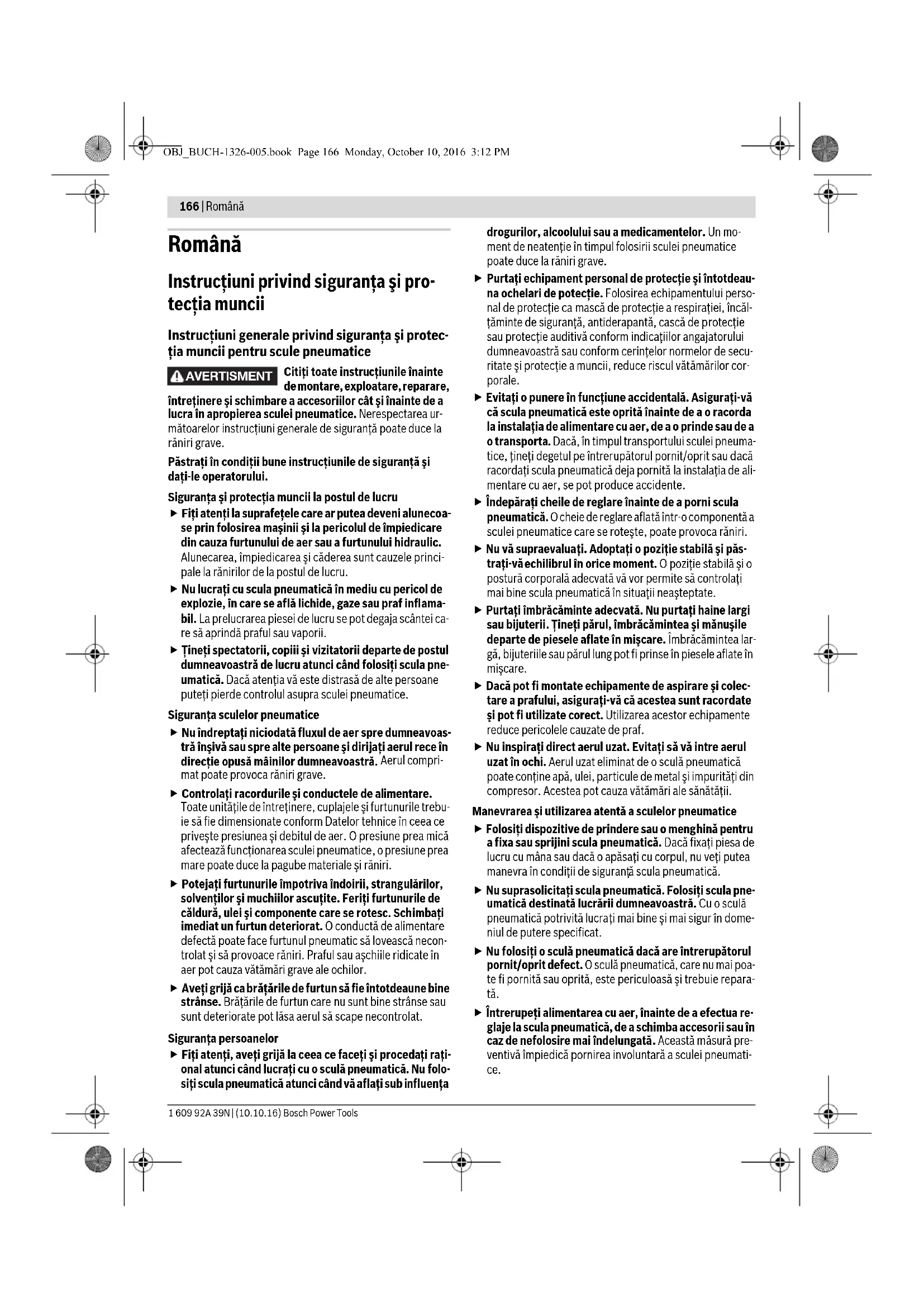 Purtaţi echipament personal de protecţie şi întotdeau- na ochelari de potecţie. Folosirea echipamentului perso- nal de protecţie ca mască de protecţie a respiraţiei, încăl- ţăminte de siguranţă, antiderapantă, cască de protecţie sau protecţie auditivă conform indicaţiilor angajatorului dumneavoastră sau conform cerinţelor normelor de secu- ritate şi protecţie a muncii, reduce riscul vătămărilor cor- porale. Evitaţi o punere în funcţiune accidentală. Asiguraţi-vă că scula pneumatică este oprită înainte de a o racorda la instalaţia de alimentare cu aer, de a o prinde sau de a o transporta. Dacă, în timpul transportului sculei pneuma- tice, ţineţi degetul pe întrerupătorul pornit/oprit sau dacă racordaţi scula pneumatică deja pornită la instalaţia de ali- mentare cu aer, se pot produce accidente. Îndepăraţi cheile de reglare înainte de a porni scula pneumatică. O cheie de reglare aflată într-o componentă a sculei pneumatice care se roteşte, poate provoca răniri. Nu vă supraevaluaţi. Adoptaţi o poziţie stabilă şi păs- traţi-vă echilibrul în orice moment. O poziţie stabilă şi o postură corporală adecvată vă vor permite să controlaţi mai bine scula pneumatică în situaţii neaşteptate. Purtaţi îmbrăcăminte adecvată. Nu purtaţi haine largi sau bijuterii. Ţineţi părul, îmbrăcămintea şi mănuşile departe de piesele aflate în mişcare. Îmbrăcămintea lar- gă, bijuteriile sau părul lung pot fi prinse în piesele aflate în mişcare. Dacă pot fi montate echipamente de aspirare şi colec- tare a prafului, asiguraţi-vă că acestea sunt racordate şi pot fi utilizate corect. Utilizarea acestor echipamente reduce pericolele cauzate de praf. Nu inspiraţi direct aerul uzat. Evitaţi să vă intre aerul uzat în ochi. Aerul uzat eliminat de o sculă pneumatică poate conţine apă, ulei, particule de metal şi impurităţi din compresor. Acestea pot cauza vătămări ale sănătăţii. Manevrarea şi utilizarea atentă a sculelor pneumatice Folosiţi dispozitive de prindere sau o menghină pentru a fixa sau sprijini scula pneumatică. Dacă fixaţi piesa de lucru cu mâna sau dacă o apăsaţi cu corpul, nu veţi putea manevra în condiţii de siguranţ ă scula pneumatică. Nu suprasolicitaţi scula pneumatică. Folosiţi scula pne- umatică destinată lucrării dumneavoastră. Cu o sculă pneumatică potrivită lucraţi mai bine şi mai sigur în dome- niul de putere specificat. Nu folosiţi o sculă pneumatică dacă are întrerupătorul pornit/oprit defect. O sculă pneumatică, care nu mai poa- te fi pornită sau oprită, este periculoasă şi trebuie repara- tă. Întrerupeţi alimentarea cu aer, înainte de a efectua re- glaje la scula pneumatică, de a schimba accesorii sau în caz de nefolosire mai îndelungată. Această măsură pre- ventivă împiedică pornirea involuntară a sculei pneumati- ce. AVERTISMENT OBJ_BUCH-1326-005.book Page 166 Monday, October 10, 2016 3:12 PMRomână | 167 Bosch Power Tools 1 609 92A 39N | (10.10.16) Depozitaţi sculele pneumatice nefolosite la loc inacce- sibil copiilor. Nu permiteţi folosirea sculei pneumatice de persoane nefamiliarizate cu aceasta sau care nu au citit prezentele instrucţiuni. Sculele pneumatice sunt periculoase atunci când sunt folosite de persoane lipsite de experienţă. Întreţineţi-vă cu grijă scula pneumatică. Controlaţi da- că, componentele mobile ale sculei pneumatice funcţi- onează impecabil şi nu se blochează şi dacă nu sunt pie- se rupte sau deteriorate care să afecteze buna funcţio- nare a sculei pneumatice. Înainte de utilizare, reparaţi piesele defecte ale sculei pneumatice. Cauza multor ac- cidente o constituie sculele pneumatice întreţinute neco- respunător. Folosiţi scula pneumatică, accesoriile, dispozitivele de lucru etc. conform prezentelor instrucţiuni. Ţineţi sea- ma în acest sens de activitatea ce urmează să o desfă- şuraţi. Astfel veţi reduce cât mai mult posibil degajarea pa- fului, vibraţiile şi zgomotele. Scula pneumatică ar trebui să fie montată, reglată sau utilizată numai de c ătre operatori corespunzător califi- caţi şi instruiţi. Nu este permisă modificarea sculei pneumatice. Modi- ficările pot diminua eficienţa măsurilor de securitate şi mă- ri riscurile pentru operator Service Nu permiteţi repararea sculei dumneavoastră pneuma- tice decât de către personal de specialitate corespun- zător calificat şi numai cu piese de schimb originale. Astfel veţi avea garanţia că este menţinută siguranţa sculei pneumatice. Instrucţiuni de siguranţă pentru şlefuitor pneu- matic cu excentric În cazul ruperii piesei de lucru sau a unui accesoriu sau chiar a sculei pnumatice, componente ale acestora pot fi aruncate afară cu viteză mare. În timpul funcţionării cât şi în timpul lucrărilor de repa- raţii sau întreţinere şi la schimbarea accesoriilor sculei pneumatice trebuie să purtaţi întotdeauna un echipa- ment de protecţie a ochilor rezistent la şocuri. Gradul se protecţie ncesar ar trebui evaluat pentru fiecare uti- lizare în parte. Purtaţi cască de protecţie atunci când lucraţi deasupra capului. Astfel veţi evita eventualele răniri. Aveţi grijă ca celelalte persoane să se afle la o distanţă sigură faţă de sectorul dumneavoastră de lucru. Toţi cei care intră în sectorul de lucru trebuie să poarte echipament personal de protecţie. Fragmentele rupte din piesa de lucru sau desprinse din discul de tăiere pot zbura prin aer şi cauza răniri chiar în afara sectorului direct de lucru. Atenţie! În timpul unei funcţionării mai îndelungate a sculei pneumatice accesoriile se pot înfierbânta. Folo- siţi mănuşi de protecţie. Operatorul şi personalul de întreţinere trebuie să fie capabili din punct de vedere fizic să manevreze dimen- siunile, greutatea şi puterea sculei pneumatice. Fiţi pregătiţi în caz de mi