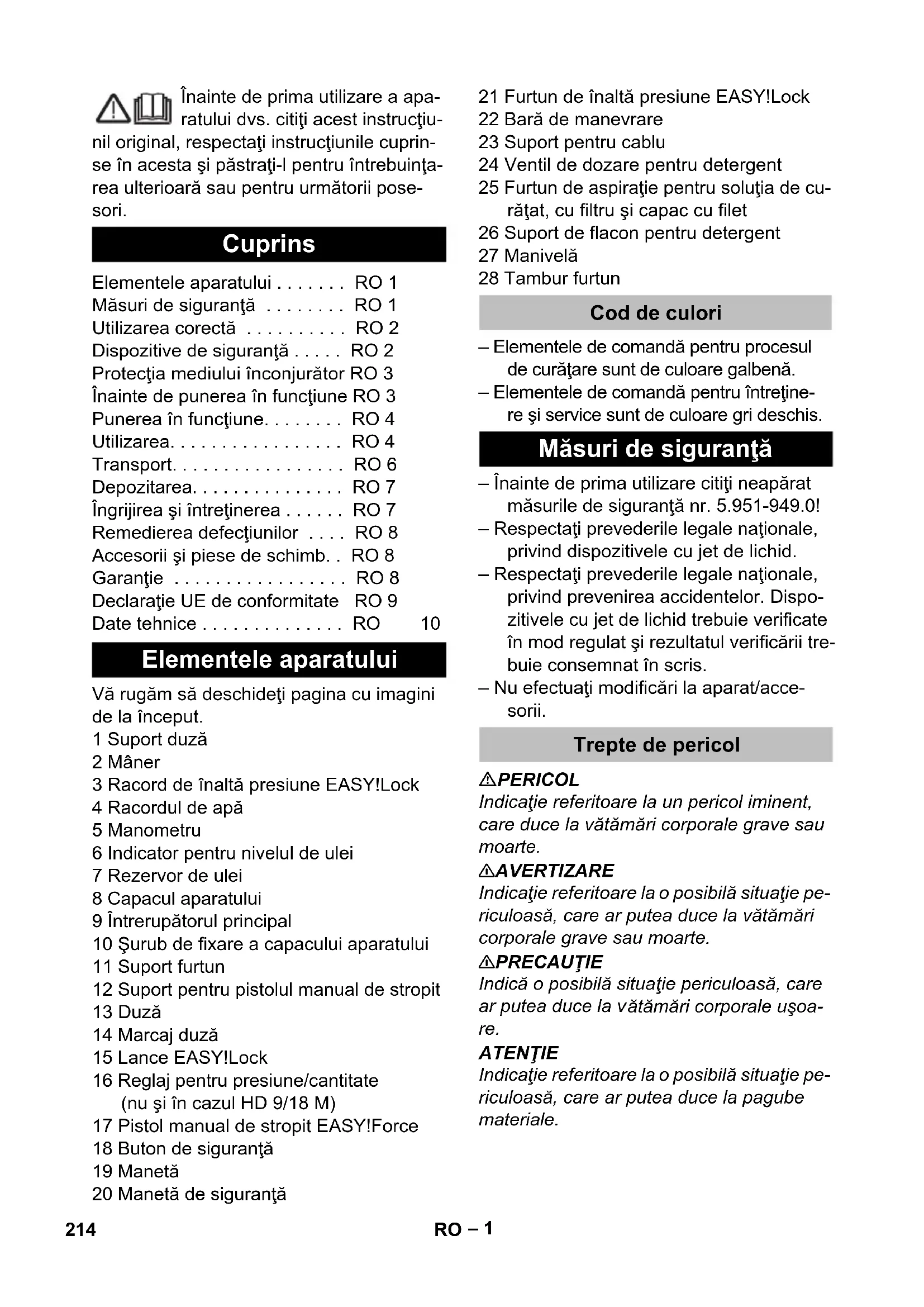 dB(A) 91 88 Materiały eksploatacyjne Ilość oleju l 0,5 0,75 Gatunek oleju SAE 90 Hypoid Wymiary i ciężar Długość mm 554 szerokość mm 509 wysokość mm 1000 Ciężar bez akcesoriów (MX) kg 48,6 42,1 (49) 47 (55) 48 (50) 213PL– 1 Înainte de prima utilizare a apa- ratului dvs. citiţi acest instrucţiu- nil original, respectaţi instrucţiunile cuprin- se în acesta şi păstraţi-l pentru întrebuinţa- rea ulterioară sau pentru următorii pose- sori. Vă rugăm să deschideţi pagina cu imagini de la început. 1 Suport duză 2 Mâner 3 Racord de înaltă presiune EASY!Lock 4 Racordul de apă 5 Manometru 6 Indicator pentru nivelul de ulei 7 Rezervor de ulei 8 Capacul aparatului 9 Întrerupătorul principal 10 Şurub de fixare a capacului aparatului 11 Suport furtun 12 Suport pentru pistolul manual de stropit 13 Duză 14 Marcaj duză 15 Lance EASY!Lock 16 Reglaj pentru presiune/cantitate (nu şi în cazul HD 9/18 M) 17 Pistol manual de stropit EASY!Force 18 Buton de siguranţă 19 Manetă 20 Manetă de siguranţă 21 Furtun de înaltă presiune EASY!Lock 22 Bară de manevrare 23 Suport pentru cablu 24 Ventil de dozare pentru detergent 25 Furtun de aspiraţie pentru soluţia de cu- răţat, cu filtru şi capac cu filet 26 Suport de flacon pentru detergent 27 Manivelă 28 Tambur furtun – Elementele de comandă pentru procesul de curăţare sunt de culoare galbenă. – Elementele de comandă pentru întreţine- re şi service sunt de culoare gri deschis. – Înainte de prima utilizare citiţi neapărat măsurile de siguranţă nr. 5.951-949.0! – Respectaţi prevederile legale naţionale, privind dispozitivele cu jet de lichid. – Respectaţi prevederile legale naţionale, privind prevenirea accidentelor. Dispo- zitivele cu jet de lichid trebuie verificate în mod regulat şi rezultatul verificării tre- buie consemnat în scris. – Nu efectuaţi modificări la aparat/acce- sorii. PERICOL Indicaţie referitoare la un pericol iminent, care duce la vătămări corporale grave sau moarte. 몇 AVERTIZARE Indicaţie referitoare la o posibilă situaţie pe- riculoasă, care ar putea duce la vătămări corporale grave sau moarte. 몇 PRECAUŢIE Indică o posibilă situaţie periculoasă, care ar putea duce la v ătămări corporale uşoa- re. ATENŢIE Indicaţie referitoare la o posibilă situaţie pe- riculoasă, care ar putea duce la pagube materiale. Cuprins Elementele aparatului . . . . . . . RO 1 Măsuri de siguranţă . . . . . . . . RO 1 Utilizarea corectă . . . . . . . . . . RO 2 Dispozitive de siguranţă . . . . . RO 2 Protecţia mediului înconjurător RO 3 Înainte de punerea în funcţiune RO 3 Punerea în funcţiune. . . . . . . . RO 4 Utilizarea. . . . . . . . . . . . . . . . . RO 4 Transport. . . . . . . . . . . . . . . . . RO 6 Depozitarea. . . . . . . . . . . . . . . RO 7 Îngrijirea şi întreţinerea . . . . . . RO 7 Remedierea defecţiunilor . . . . RO 8 Accesorii şi piese de schimb. . RO 8 Garanţie . . . . . . . . . . . . . . . . . RO 8 Declaraţie UE de conformitate RO 9 Date tehnice . . . . . . . . . . . . . . RO 10 Elementele aparatului Cod de culori Măsuri de siguranţă Trepte de pericol 214 RO– 2 Jeturile sub presiune pot fi peri- culoase în cazul utilizării necon- forme. Jetul nu trebuie îndreptat spre per- soane, animale, echipamente electrice ac- tive sau asupra aparatului însuşi. Conform normelor în vigoare, apa- ratul nu trebuie exploatat niciodată fără un separator de sistem la re- ţeaua de apă potabilă. Se va utili- za un separator de sistem adecvat, de la fir- ma KÄRCHER, sau un separator de sistem alternativ, conform EN 12729 tip BA. Apa, care curge printr-un separator de sis- tem este clasificată ca fiind nepotabilă. 몇 PRECAUŢIE Separatorul de sistem trebuie conectat în- totdeauna la alimentarea de apă, niciodată direct la aparat. Folosiţi acest aparat de curăţat sub presiu- ne exclusiv pentru – curăţarea cu jetul de presiune joasă şi soluţie de curăţat (ex. curăţarea maşini- lor industriale, a autovehiculelor, a clă- dirilor, a sculelor); – curăţarea cu jet de presiune înaltă fără soluţie de curăţat (ex. curăţarea faţade- lor, teraselor, uneltelor de grădină). Pentru murdărie persistentă recomandăm folosirea frezelor de mizerie care sunt dis- ponibile ca accesorii opţionale. La HD...Plus, freza de mizerie se livrează împreună cu aparatul. Cerinţe referitoare la calitatea apei: ATENŢIE Ca mediu sub presiune se poate utiliza numai apă curată. Impurităţile din apă pot cauza uzura premaură a aparatului şi depuneri. Dacă utilizaţi apă reciclată, nu trebuie să fie depăşite următoarele valori limită. Dispozitivele de siguranţă au rolul de a pro- teja utilizatorul şi nu trebuie scoase din funcţiune sau evitate în timpul funcţionării. Când cantitatea de apă este redusă de la regulatorul de presiune/debit, supapa de preaplin se deschide şi o parte a apei curge înapoi în partea de aspirare a pompei. Dacă maneta pistolului manual de stropit este eliberată, întrerupătorul manometric decuplează pompa, iar jetul sub presiune se opreşte. Dacă trageţi de manetă, pompa porneşte din nou. Supapa de siguranţă se deschide când se depăşeşte presiunea de lucru admisă; apa curge înapoi la partea de aspirare a pom- pei. Supapa de preaplin, întrerupătorul mano- metric şi supapa de siguranţă sunt reglate şi sigilate din fabrică. Reglarea lor se face doar la service. Simboluri pe aparat Utilizarea corectă Valoare pH 6,5...9,5 Conductivitate electrică * Conductanţă apă proaspătă +1200 µS/cm Materiale decantabile ** < 0,5 mg/l Materiale filtrabile *** < 50 mg/l Hidrocarburi < 20 mg/l Clorură < 300 mg/l Sulfat < 240 mg/l Calciu < 200 mg/l Duritate totală < 28 °dH < 50 °TH < 500 ppm (mg CaCO