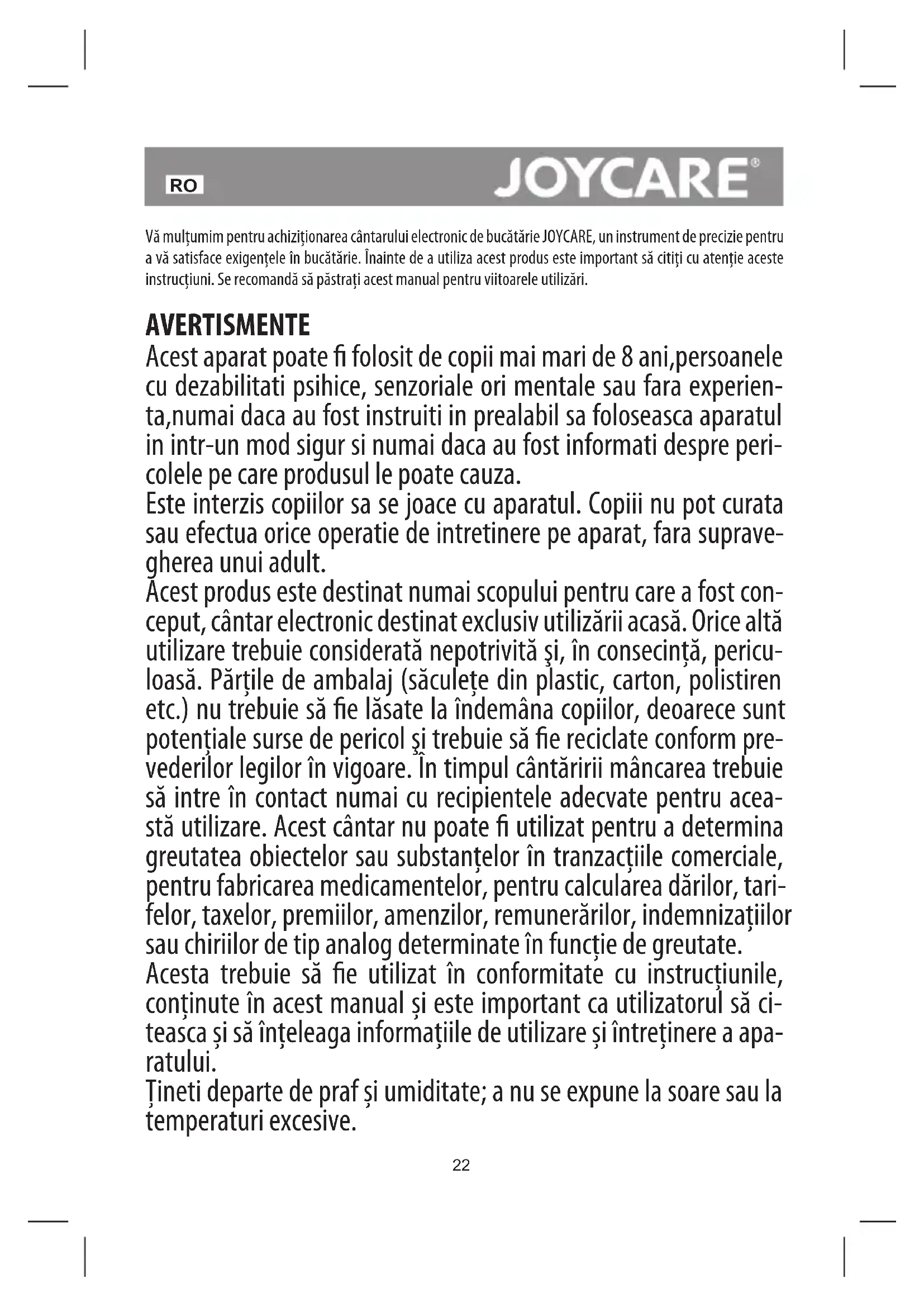 Vă mulţumim pentru achiziţionarea cântarului electronic de bucătărie JOYCARE, un instrument de precizie pentru a vă satisface exigenţele în bucătărie. Înainte de a utiliza acest produs este important să citiţi cu atenţie aceste instrucţiuni. Se recomandă să păstraţi acest manual pentru viitoarele utilizări. AVERTISMENTE Acest aparat poate folosit de copii mai mari de 8 ani,persoanele cu dezabilitati psihice, senzoriale ori mentale sau fara experien- ta,numai daca au fost instruiti in prealabil sa foloseasca aparatul in intr-un mod sigur si numai daca au fost informati despre peri- colele pe care produsul le poate cauza. Este interzis copiilor sa se joace cu aparatul. Copiii nu pot curata sau efectua orice operatie de intretinere pe aparat, fara suprave- gherea unui adult. Acest produs este destinat numai scopului pentru care a fost con- ceput, cântar electronic destinat exclusiv utilizării acasă. Orice altă utilizare trebuie considerată nepotrivită şi, în consecinţă, pericu- loasă. Părţile de ambalaj (săculeţe din plastic, carton, polistiren etc.) nu trebuie să e lăsate la îndemâna copiilor, deoarece sunt potenţiale surse de pericol şi trebuie să e reciclate conform pre- vederilor legilor în vigoare. În timpul cântăririi mâncarea trebuie să intre în contact numai cu recipientele adecvate pentru acea- stă utilizare. Acest cântar nu poate utilizat pentru a determina greutatea obiectelor sau substanţelor în tranzacţiile comerciale, pentru fabricarea medicamentelor, pentru calcularea dărilor, tari- felor, taxelor, premiilor, amenzilor, remunerărilor, indemnizaţiilor sau chiriilor de tip analog determinate în funcţie de greutate. Acesta trebuie să e utilizat în conformitate cu instrucțiunile, conținute în acest manual și este important ca utilizatorul să ci- teasca și să înțeleaga informațiile de utilizare și întreținere a apa- ratului. Țineti departe de praf și umiditate; a nu se expune la soare sau la temperaturi excesive.23 CARACTERISTICI TEHNICE Capacitate: 5 kg Diviziune: 1 g Touch screen Foarte subţire 18 mm Ecran LCD Platou din sticlă temperată Tastă selectare unitate de măsură g / oz Tastă TARE / ON / OFF: tastă pornire, oprire şi tară Stingere automată Indicator de supraîncărcare Indicator baterii consumate Alimentare: 2 baterii cu litiu CR2032 (3V) (bateriile de test sunt incluse) Condiții de utilizare: Temperatura camerei: de la 10 ° C până la 40 ° C.Umiditatea relativă: de la 30% până la 75%, fără condensare. Presiune: între 700 - 1060 hPa. Condiții de mediu de transport și depozitare: Temperatura: de la 10 până la 40 ° C. Umiditate: de la 5 până la 95%.Presiune: între 700 - 1060 hPa.