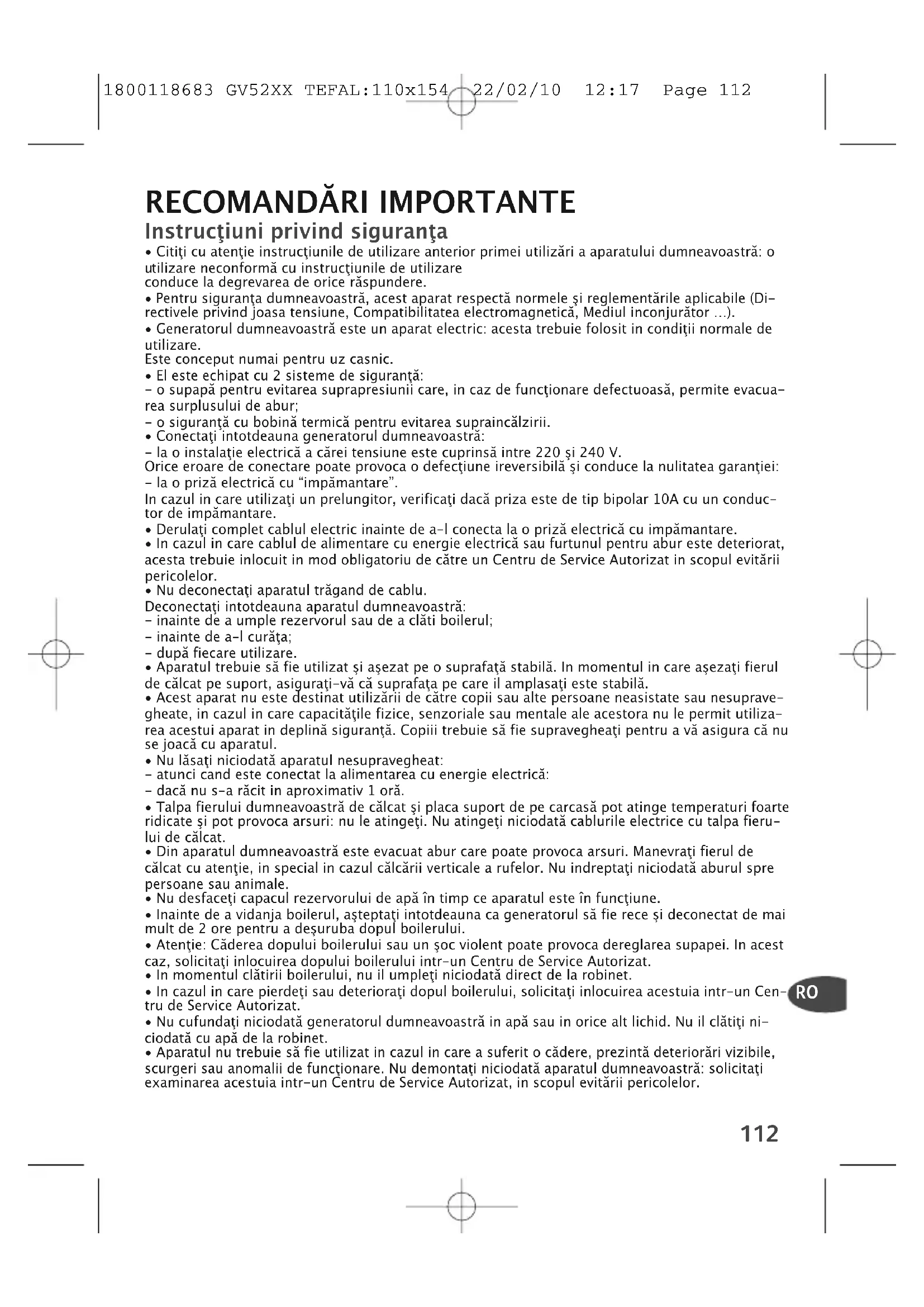 - Pentru a obţine un rezultat bun, noi vă sfătuim să efectuaţi operaţiu-nea incă o dată. Probleme Cauze posibile Soluţii Centrala de abur nu porneştesau martorul luminos al fieruluide călcat nu este aprins.Aparatul nu este sub tensiune. Verificaţi dacă aparatul este conectat, înmod corect, la o priză în stare defuncţionare şi dacă este sub tensiune.Apa curge prin orificiile de petalpă.Termostatul este dereglat:temperatura este încă prea joasă.Contactaţi un centru de service autorizat.Utilizaţi abur când fieruldumneavoastră de călcat nu estesuficient de cald.Verificaţi reglajul termostatului.Aşteptaţi ca martorul luminos al fieruluide călcat să se stingă înainte de a acţionabutonul de evacuarea a aburului.Nu deşurubaţi iciodată dopulboilerului atâtatimp cât aburul ste evacuat dinfierul de călcat.Nu aşezaţi niciodată fie-rul de călcat pe un suportdin metal, care l-ar puteadeteriora ci, mai degrabă,pe placa suport de pecarcasă: aceasta esteechipată cu tălpi antide-rapante şi a fost conce-pută pentru a rezista latemperaturi ridicate.În cazul în care apadumneavoastrăeste bogată în cal-car, amplificaţifrecvenţa. Mai ales,nu utilizaţi produsedetartrante pentrua clăti boilerul:acestea l-ar puteadeteriora. 1800118683 GV52XX TEFAL:110x154 22/02/10 12:17 Page 115116 Dacă nu este posibil să determinaţi cauza unei pene, adresaţi-vă unui centru de service autorizat. Să participăm la protecţia mediului înconjurător! Aparatul dumneavoastră conţine numeroase materiale valorificabile sau reciclabile. Predaţi-l la un punct de colectare sau, în lipsa acestuia, la un centru de service autorizat pentru a fi procesat în mod corespunzător. Probleme Cauze posibile Soluţii Apa curge prin orificiile de pe talpă. Apa s-a condensat pe conducte, pentru că utilizaţi aburul pentru prima dată sau nu aţi utilizat aburul o perioadă mai îndelungată. Nu adăugaţi niciodată produse în boiler (a se vedea articolul ce tip de apă poate fi utilizată). Pe rufe, apar urme de apă. Husa de pe masa de călcat este saturată cu apă, pentru că nu este adaptată puterii unei centrale de abur. Asiguraţi-vă că folosiţi o masă potrivită (platou cu grilaj care evită condensul). Se scurge o substanţă albă prin orificiile de pe talpa fierului de călcat. Boilerul dumneavoastră elimină calcar, deoarece nu a fost clătit cu regularitate. Clătiţi boilerul. (vezi secţiunea „Clătirea boilerului”) Se scurge o substanţă maronie prin orificiile de pe talpa fierului de călcat care pătează rufele. Utilizaţi produse chimice pentru detartrare sau aditivi în apa pe care o folosiţi pentru călcat. Nu adăugaţi niciodată niciun fel de produs în rezervor (vezi secţiunea „Ce apă este recomandată?”). Talpa este murdară sau maronie şi ar putea păta rufele. Utilizaţi fierul de călcat la o temperatură prea ridicată. Consultaţi sfaturile noastre cu privire la reglarea temperaturilor. Rufele dumneavoastră nu au fost clătite suficient sau aţi călcat un obiect de îmbrăcăminte nou înainte de a-l spăla. Asiguraţi-vă că rufele sunt suficient de bine clătite pentru a elimina eventualele depuneri de săpun sau de produse chimice pe îmbrăcămintea nouă. Utilizaţi amidon. Pulverizaţi întotdeauna amidonul pe faţa opusă celei pe care urmează să o călcaţi. Cantitatea de abur este mică sau nu este evacuat abur deloc. Boilerul este gol. Umpleţi boilerul. Temperatura tălpii este reglată la nivelul maxim. Centrala de abur funcţionează normal, dar aburul, fiind foarte cald, este uscat, aşadar mai puţin vizibil. Iese abur în jurul buşonului. Buşonul nu este strâns corespunzător. Strângeţi buşonul din nou. Garnitura buşonului este deteriorată. Contactaţi un centru de service autorizat. Aparatul este defect. Nu mai utilizaţi centrala de abur şi contactaţi un centru de service autorizat. Se elimină abur sau apă în partea inferioară a aparatului. Aparatul este defect. Nu mai utilizaţi centrala de abur şi contactaţi un centru de service autorizat.