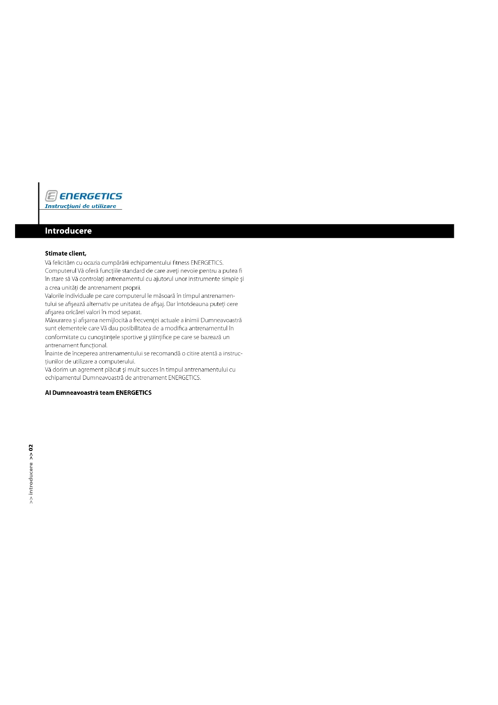 - Компютърът не изисква специална поддръжка. Редовно контролирайте здравото фиксиране на винтовете и връзките. Незабавно сменете повре- дените части. Обърнете се към дистрибутора на ENERGETICS.Упътване за употреба >> 14RO Cuprins Introducere p. 2
