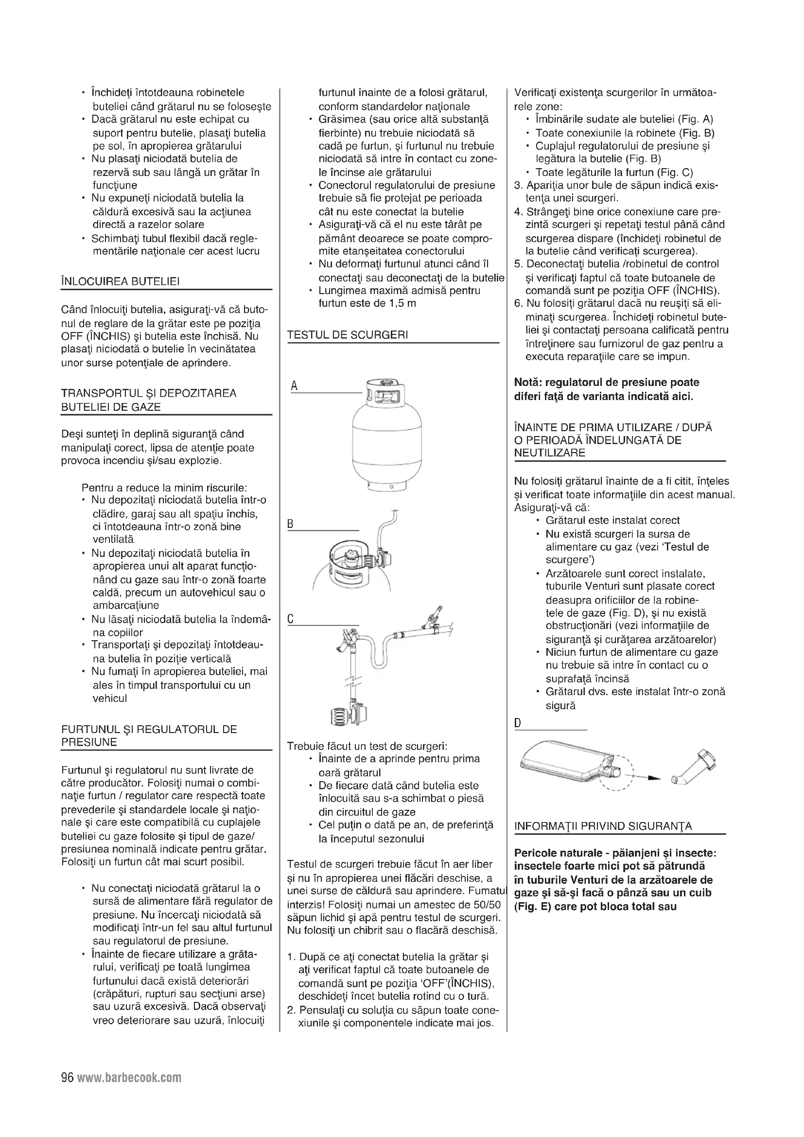 - Cel puţin o dată pe an, de preferinţă la începutul sezonului Testul de scurgeri trebuie făcut în aer liber şi nu în apropierea unei flăcări deschise, a unei surse de căldură sau aprindere. Fumatul interzis! Folosiţi numai un amestec de 50/50 săpun lichid şi apă pentru testul de scurgeri. Nu folosiţi un chibrit sau o flacără deschisă.