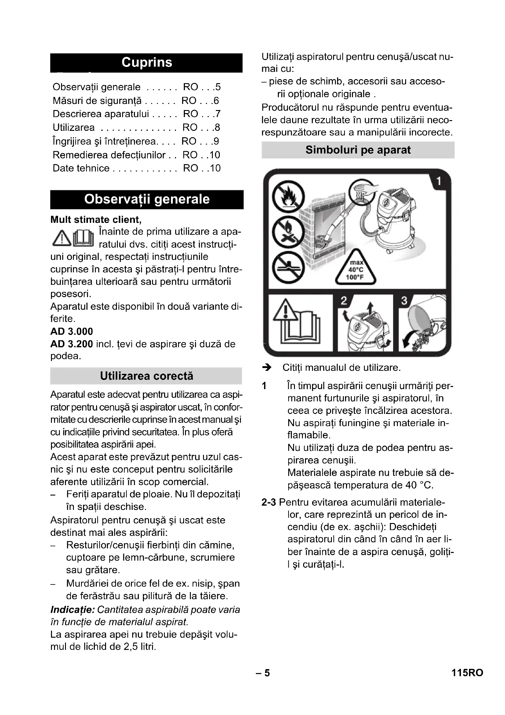 - Moc P znam. 1000 W Moc P maks. 1200 W Klasa ochrony II Bezpiecznik sieciowy (zwłoczny) 10 A Pojemność zbiornika 17 l Pochłanianie wody przy użyciu rękojeści 2,5 l Pochłanianie wody przy użyciu dyszy do podłóg 2,5 l Kabel sieciowy H05VV-F 2x0,75 Poziom ciśnienia aku- stycznego (EN 60704-2-1) 73 dB(A) Ciężar (bez akcesoriów) 7,4 kg 114 PLRomânete – 5 Mult stimate client, Înainte de prima utilizare a apa- ratului dvs. citiţi acest instrucţi- uni original, respectaţi instrucţiunile cuprinse în acesta şi păstraţi-l pentru între- buinţarea ulterioară sau pentru următorii posesori. Aparatul este disponibil în două variante di- ferite. AD 3.000 AD 3.200 incl. ţevi de aspirare şi duză de podea. Aparatul este adecvat pentru utilizarea ca aspi- rator pentru cenuşă şi aspirator uscat, în confor- mitate cu descrierile cuprinse în acest manual şi cu indicaţiile privind securitatea. În plus oferă posibilitatea aspirării apei. Acest aparat este prevăzut pentru uzul cas- nic şi nu este conceput pentru solicitările aferente utilizării în scop comercial. – Feriţi aparatul de ploaie. Nu îl depozitaţi în spaţii deschise. Aspiratorul pentru cenuşă şi uscat este destinat mai ales aspirării: – Resturilor/cenuşii fierbinţi din cămine, cuptoare pe lemn-cărbune, scrumiere sau grătare. – Murdăriei de orice fel de ex. nisip, şpan de ferăstrău sau pilitură de la tăiere. Indicaţie: Cantitatea aspirabilă poate varia în funcţie de materialul aspirat. La aspirarea apei nu trebuie depăşit volu- mul de lichid de 2,5 litri. Utilizaţi aspiratorul pentru cenuşă/uscat nu- mai cu: – piese de schimb, accesorii sau acceso- rii opţionale originale . Producătorul nu răspunde pentru eventua- lele daune rezultate în urma utilizării neco- respunzătoare sau a manipulării incorecte. Citiţi manualul de utilizare. Cuprins Observaţii generale