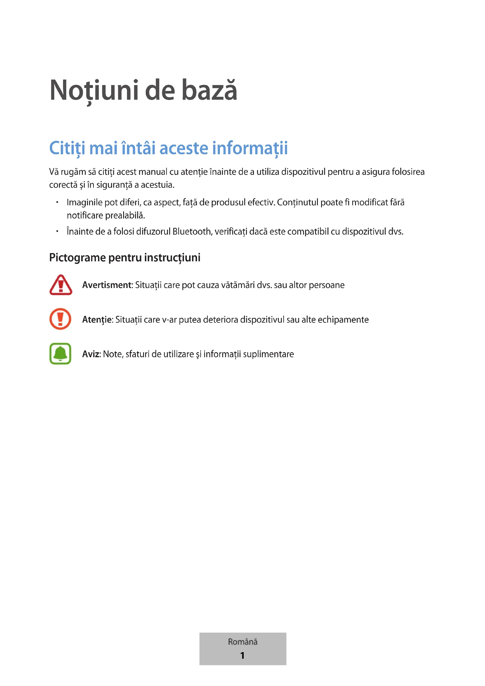 Înainte de a folosi difuzorul Bluetooth, verificați dacă este compatibil cu dispozitivul dvs. Pictograme pentru instrucţiuni Avertisment: Situaţii care pot cauza vătămări dvs. sau altor persoane Atenţie: Situaţii care v-ar putea deteriora dispozitivul sau alte echipamente Aviz: Note, sfaturi de utilizare şi informaţii suplimentare Română 1Noțiuni de bază