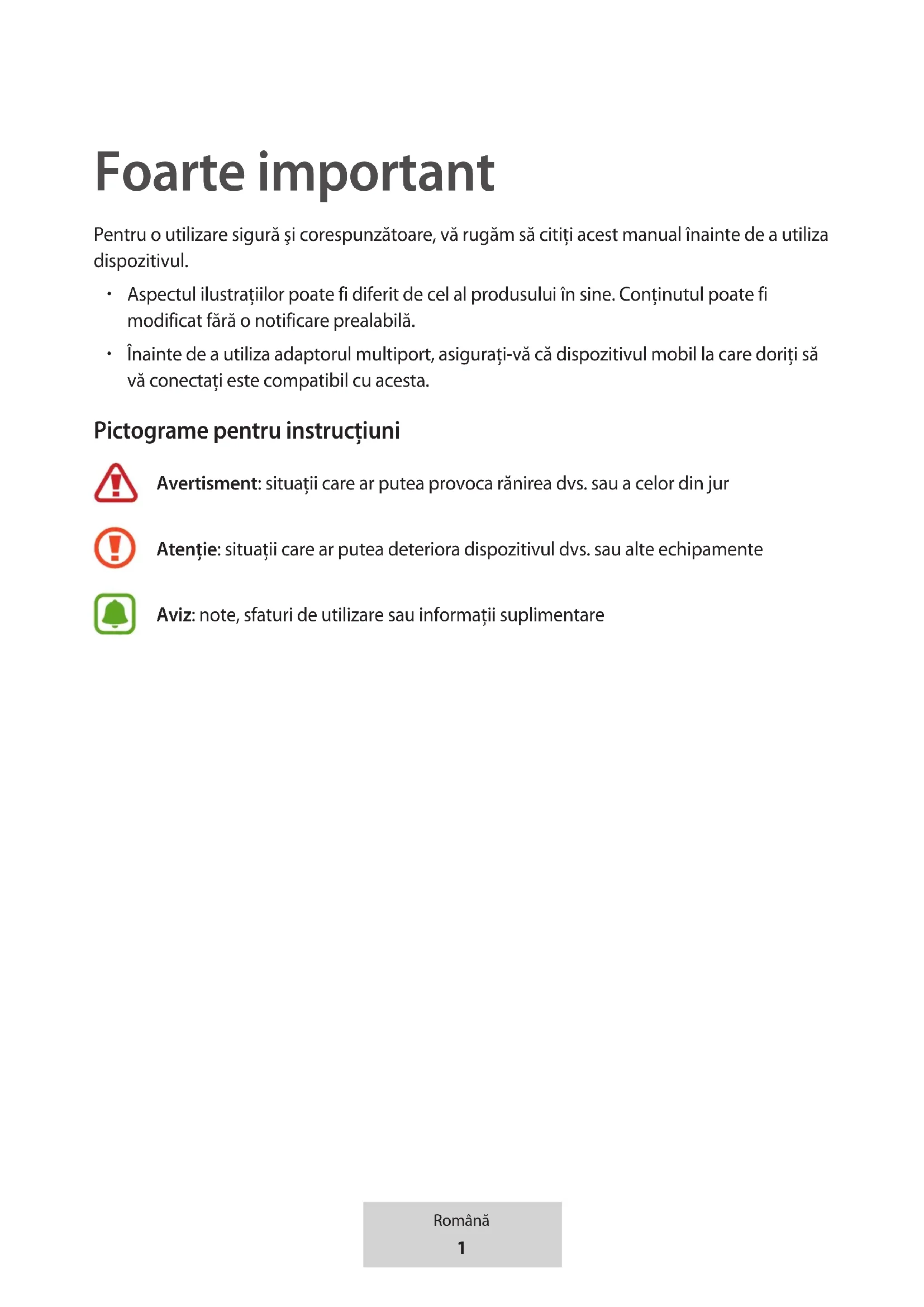 Înainte de a utiliza adaptorul multiport, asigurați-vă că dispozitivul mobil la care doriți să vă conectați este compatibil cu acesta. Pictograme pentru instrucţiuni Avertisment: situaţii care ar putea provoca rănirea dvs. sau a celor din jur Atenţie: situaţii care ar putea deteriora dispozitivul dvs. sau alte echipamente Aviz: note, sfaturi de utilizare sau informaţii suplimentare Română2 Română Introducere Conținutul pachetului Verificaţi dacă în cutia produsului se află următoarele articole: