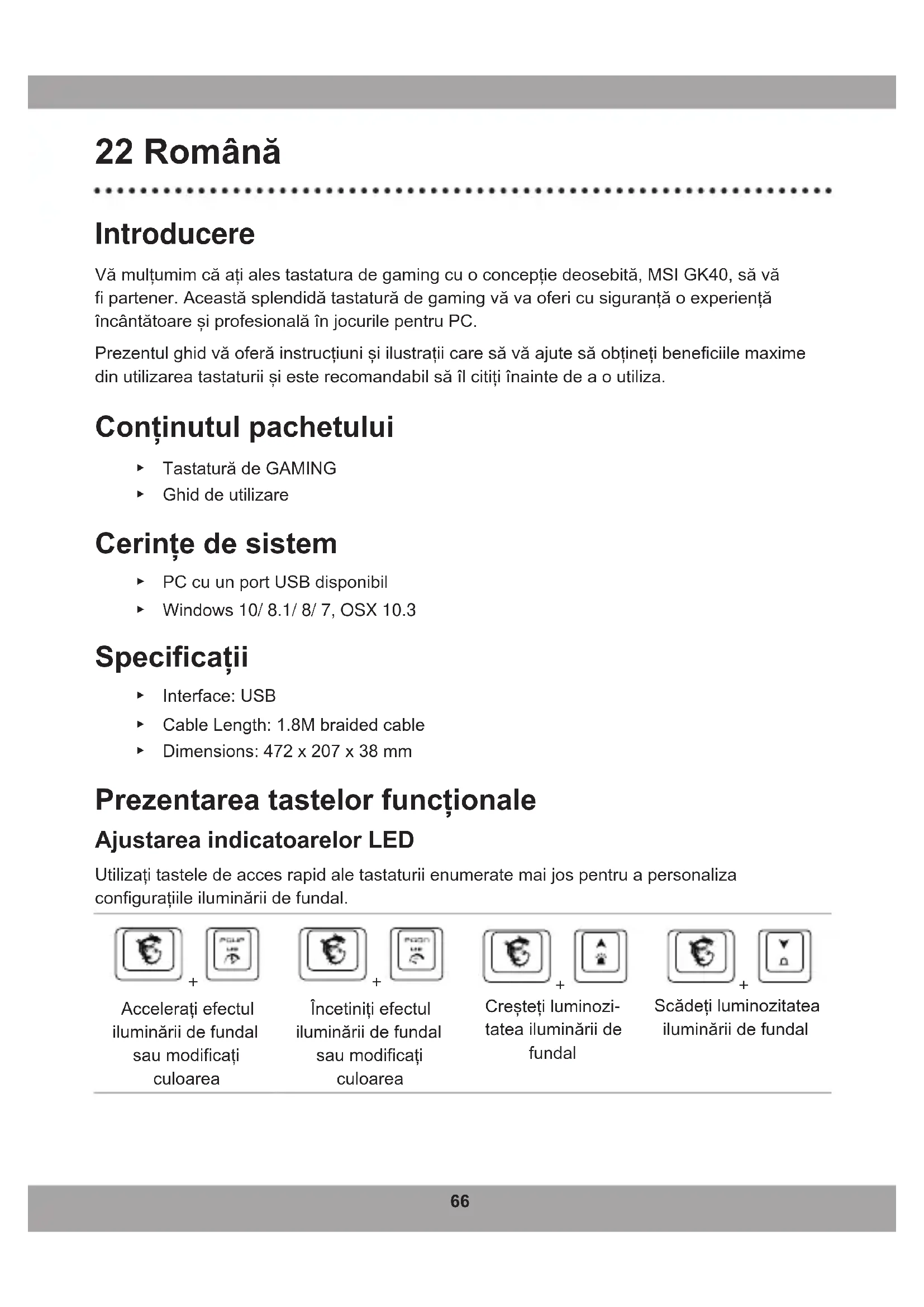 - Trykk + eller for å justere fargetonen. Henvising: Anti-ghosting Tab+Caps+Shift+Ctrl+Q+W+E+R+T+A+S+D+F+G+Z+X+C+V+B+Space 20 tastar Q+W+E+R+T+Y+U+I+O+P+Space 11 tastar A+S+D+F+G+H+J+K+L+; +Space 11 tastar Z+X+C+V+B+N+M+,+.+/+Backspace 11 tastar TAB+CAPS+Shift+Ctrl+Alt+Q+W+E+A+S+D+Z+X+C 14 tastar TAB+CAPS+Shift+Ctrl+Space+Q+W+E+A+S+D+F+G+Z+X+C+↑+←+↓+→ 20 tastar Shift-L+Shift-R+Ctrl-L+Ctrl-R+Alt-L+Alt-R+Space+↑+←+↓+→ 11 tastar A+S+D+F+J+K+L+;+Backspace 9 tastar66 22 Română Introducere Vă mulțumim că ați ales tastatura de gaming cu o concepție deosebită, MSI GK40, să vă fi partener. Această splendidă tastatură de gaming vă va oferi cu siguranță o experiență încântătoare și profesională în jocurile pentru PC. Prezentul ghid vă oferă instrucțiuni și ilustrații care să vă ajute să obțineți beneficiile maxime din utilizarea tastaturii și este recomandabil să îl citiți înainte de a o utiliza. Conținutul pachetului ▶ Tastatură de GAMING ▶ Ghid de utilizare Cerințe de sistem ▶ PC cu un port USB disponibil ▶ Windows 10/ 8.1/ 8/ 7, OSX 10.3 Specificații ▶ Interface: USB ▶ Cable Length: 1.8M braided cable ▶ Dimensions: 472 x 207 x 38 mm Prezentarea tastelor funcționale Ajustarea indicatoarelor LED Utilizați tastele de acces rapid ale tastaturii enumerate mai jos pentru a personaliza configurațiile iluminării de fundal.