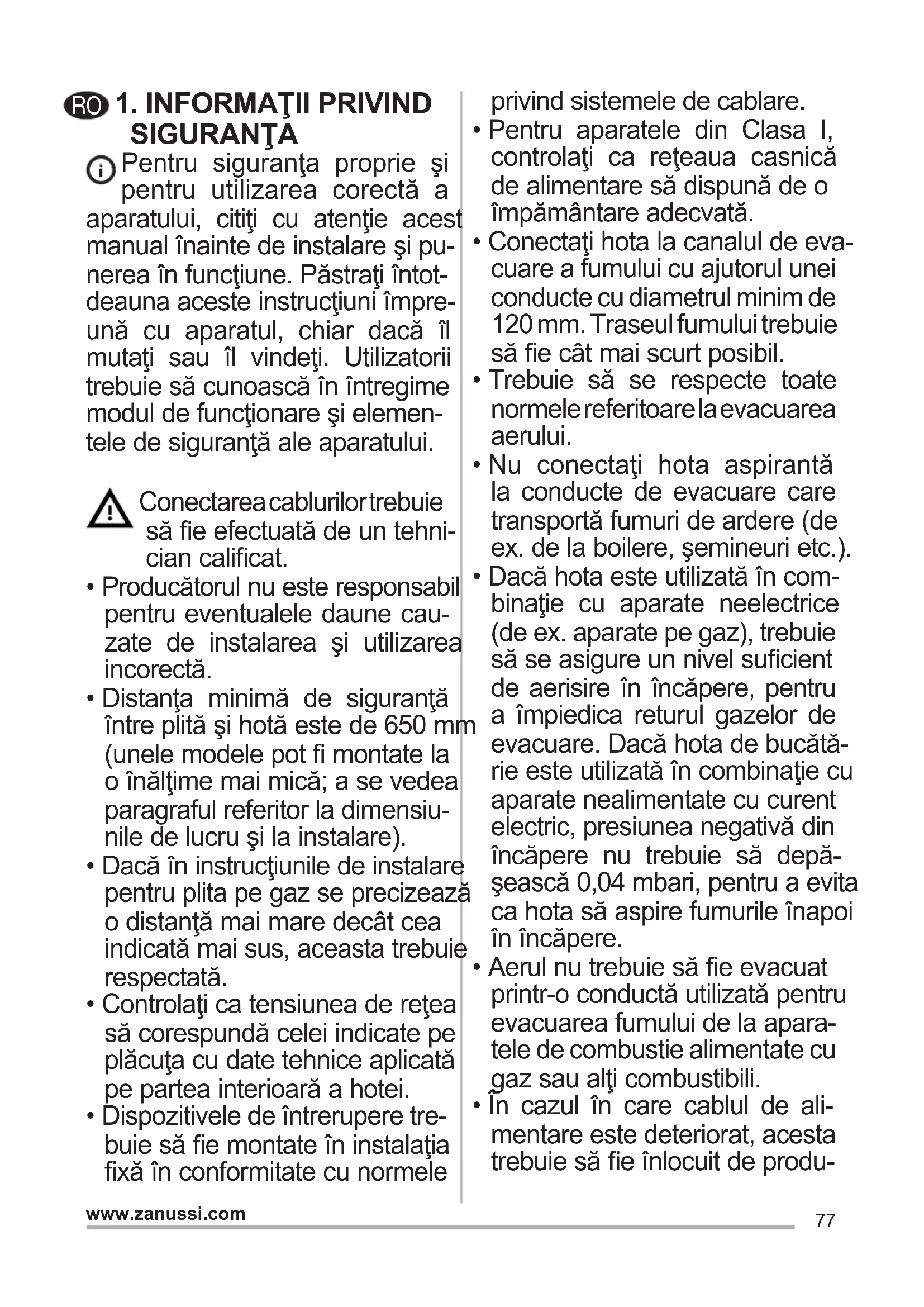 Žiarovka Príkon (W) Prípojka Napätie (V) Rozmer (mm) Kód ILCOS 4 E14 220-240 107 x 37 DRBB/F-4-220-240-E14-35/10077 www.zanussi.com 1.INFORMAŢIIPRIVIND SIGURANŢA Pentru siguranţa proprie şi pentru utilizarea corectă a aparatului, citiţi cu atenţie acest manual înainte de instalare şi pu- nerea în funcţiune. Păstraţi întot- deauna aceste instrucţiuni împre- ună cu aparatul, chiar dacă îl mutaţi sau îl vindeţi. Utilizatorii trebuie să cunoască în întregime modul de funcţionare şi elemen- tele de siguranţă ale aparatului. Conectarea cablurilor trebuie să e efectuată de un tehni- cian calicat.