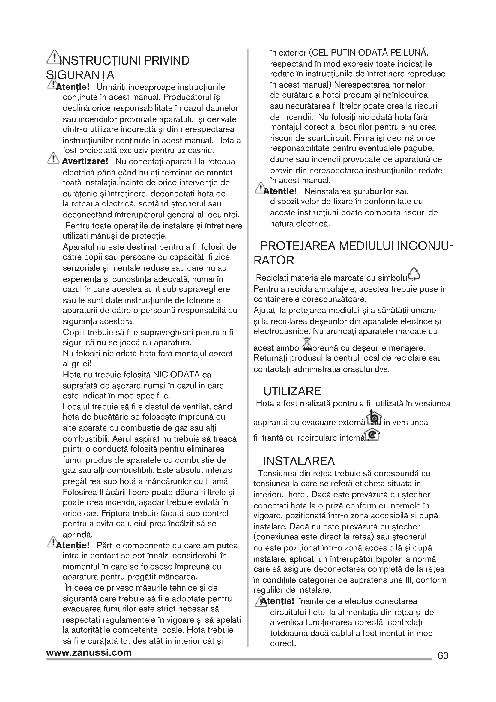 RATOR Reciclaţi materialele marcate cu simbolul . Pentru a recicla ambalajele, acestea trebuie puse în containerele corespunzătoare. Ajutaţi la protejarea mediului şi a sănătăţii umane şi la reciclarea deşeurilor din aparatele electrice şi electrocasnice. Nu aruncaţi aparatele marcate cu acest simbol împreună cu deşeurile menajere. Returnaţi produsul la centrul local de reciclare sau contactaţi administraţia oraşului dvs. UTILIZARE Hota a fost realizată pentru a fi utilizată în versiunea aspirantă cu evacuare externă sau în versiunea fi ltrantă cu recirculare internă . INSTALAREA Tensiunea din reţea trebuie să corespundă cu tensiunea la care se referă eticheta situată în interiorul hotei. Dacă este prevăzută cu ştecher conectaţi hota la o priză conform cu normele în vigoare, poziţionată într-o zona accesibilă şi după instalare. Dacă nu este prevăzută cu ştecher (conexiunea este direct la reţea) sau ştecherul nu este poziţionat într-o zonă accesibilă şi după instalare, aplicaţi un întrerupător bipolar la normă care să asigure deconectarea completă de la reţea în condiţiile categoriei de supratensiune III, conform regulilor de instalare. Atenţie! înainte de a efectua conectarea circuitului hotei la alimentaţia din reţea şi de a verifica funcţionarea corectă, controlaţi totdeauna dacă cablul a fost montat în mod corect.64 www.zanussi.com Distanţa minimă între suprafaţa suportului recipientelor pe dispozitivul de gătit şi partea de jos a hotei nu trebuie să fi e mai mică de 43cm în cazul maşinilor de gătit electrice, şi de 65cm în cazul maşinilor de gătit cu gaz sau mixte. Dacă instrucţiiunile dispozitivului de gătit cu gaz specifi că o distanţă mai mare, este necesar să ţineţi cont de aceasta. ÎNTREŢINERE Atenţie! Înainte de orice intervenţie de curăţenie şi întreţinere, deconectaţi hota de la reţeaua electrică, scoţând ştecherul sau deconectând întrerupătorul general al locuinţei. Hota trebuie curăţată frecvent (cel puţin cu aceeaşi frecvenţă cu care se curăţă fi ltrele anti-grăsime), fi e în interior cât şi în exterior. Pentru curăţare folosiţi un material îmbibat cu detergenţi lichizi neutri. Evitaţi folosirea produselor pe bază de abrazivi NU FOLOSIŢI ALCOOL! Atenţie! Nerespectarea normelor de curăţare a hotei şi de înlocuire a fi ltrelor conduce la potenţiale riscuri de incendii. Vă sfătuim să respectaţi îndeaproape instrucţiunile prezente în acest manual. Producătorul îşi declină orice responsabilitate în cazul daunelor la motor sau incendiilor provocate aparatului şi derivate dintr-o utilizare sau întreţinere incorectă precum şi din nerespectarea instrucţiunilor conţinute în acest manual. Filtru anti-grăsimi - Trebuie curăţat o dată pe lună cu detergenţi neabrazivi, manual sau utilizând maşina de spălat vase, la temperaturi scăzute şi folosind un program scurt. Filtrul metalic anti-grăsimi, spălat cu maşina de spălat vase se poate decolora, dar nu-şi va pierde caracteristicile de fi ltrare. Filtru cu carbon activ NElavabil Saturaţia fi ltrului de cărbune depinde de folosirea mai mult sau mai puţin prelungită a tipului de maşina de gătit precum şi de curăţarea regulară a fi ltrului pentru grăsime. În orice caz, cartuşul fi ltrului trebuie înlocuit cel mult la fi ecare patru luni. NU-l spălaţi sau refolosiţi Clack!