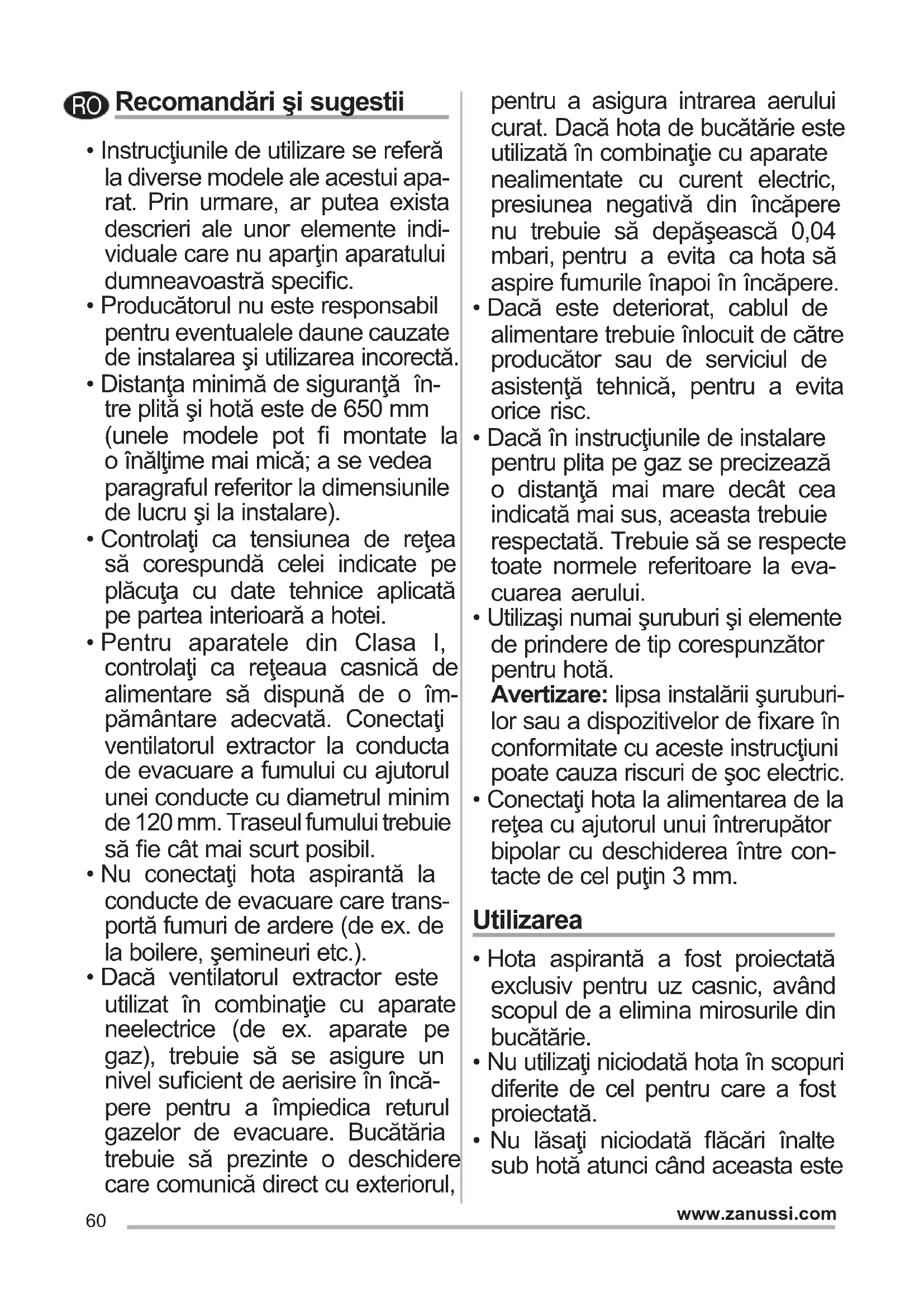 - Nu lăsaţi niciodată ăcări înalte sub hotă atunci când aceasta este RO61 www.zanussi.com în funcţiune.