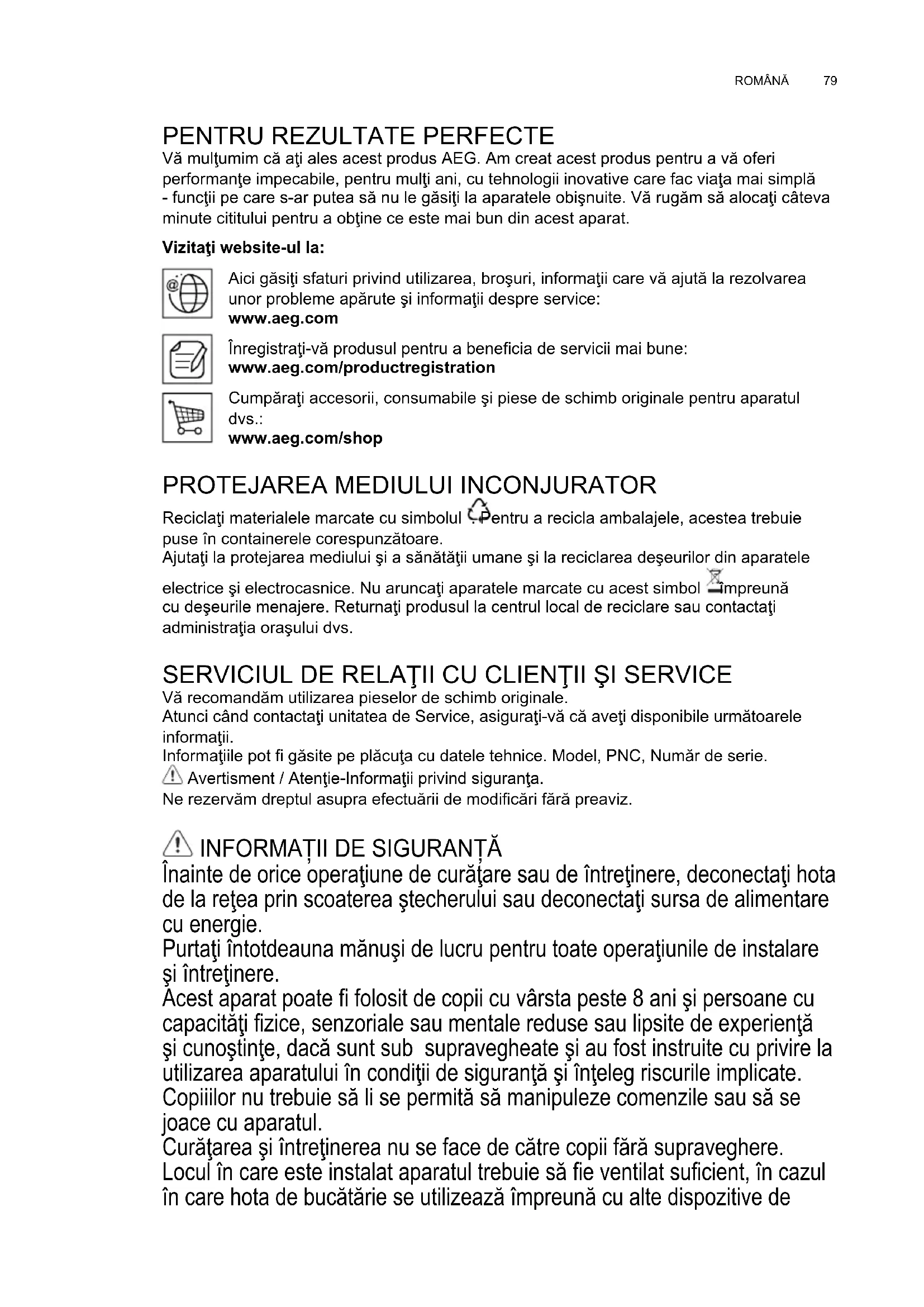 Vă mulţumim că aţi ales acest produs AEG. Am creat acest produs pentru a vă oferi performanţe impecabile, pentru mulţi ani, cu tehnologii inovative care fac viaţa mai simplă - funcţii pe care s-ar putea să nu le găsiţi la aparatele obişnuite. Vă rugăm să alocaţi câteva minute cititului pentru a obţine ce este mai bun din acest aparat. Vizitaţi website-ul la: Aici găsiţi sfaturi privind utilizarea, broşuri, informaţii care vă ajută la rezolvarea unor probleme apărute şi informaţii despre service: www.aeg.com Înregistraţi-vă produsul pentru a benecia de servicii mai bune: www.aeg.com/productregistration Cumpăraţi accesorii, consumabile şi piese de schimb originale pentru aparatul dvs.: www.aeg.com/shop