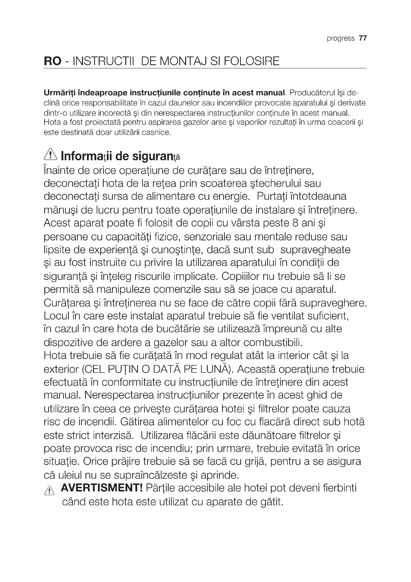 Înainte de orice operaţiune de curăţare sau de întreţinere, deconectaţi hota de la reţea prin scoaterea ştecherului sau deconectaţi sursa de alimentare cu energie. Purtaţi întotdeauna mănuşi de lucru pentru toate operaţiunile de instalare şi întreţinere. Acest aparat poate fi folosit de copii cu vârsta peste 8 ani şi persoane cu capacităţi fizice, senzoriale sau mentale reduse sau lipsite de experienţă şi cunoştinţe, dacă sunt sub supravegheate şi au fost instruite cu privire la utilizarea aparatului în condiţii de siguranţă şi înţeleg riscurile implicate. Copiiilor nu trebuie să li se permită să manipuleze comenzile sau să se joace cu aparatul. Curăţarea şi întreţinerea nu se face de către copii fără supraveghere. Locul în care este instalat aparatul trebuie să fie ventilat suficient, în cazul în care hota de bucătărie se utilizează împreună cu alte dispozitive de ardere a gazelor sau a altor combustibili. Hota trebuie să fie curăţată în mod regulat atât la interior cât şi la exterior (CEL PUŢIN O DATĂ PE LUNĂ). Această operaţiune trebuie efectuată în conformitate cu instrucţiunile de întreţinere din acest manual. Nerespectarea instrucţiunilor prezente în acest ghid de utilizare în ceea ce priveşte curăţarea hotei şi filtrelor poate cauza risc de incendii. Gătirea alimentelor cu foc cu flacără direct sub hotă este strict interzisă. Utilizarea flăcării este dăunătoare filtrelor şi poate provoca risc de incendiu; prin urmare, trebuie evitată în orice situaţie. Orice prăjire trebuie să se facă cu grijă, pentru a se asigura că uleiul nu se supraîncălzeste şi aprinde. AVERTISMENT! Părţile accesibile ale hotei pot deveni fierbinti când este hota este utilizat cu aparate de gătit.78 progress Instrucțiuni de siguranţă Pentru înlocuirea becurilor, utilizati numai tipul de becuri indicat în secţiunea Întreţinere/Înlocuirea becurilor din acest manual. AVERTISMENT! Nu conectaţi aparatul la reţeaua electrică până când instalarea este complet terminată. În ceea ce priveşte măsurile tehnice şi de siguranţă care trebuie adoptate pentru evacuarea fumului, este important să se urmărească îndeaproape normele locale. Sistemul de evacuare a fumului pentru acest aparat nu trebuie să fie conectat la nici sistem de ventilaţie existent care este folosit în alte scopuri, cum ar fi evacuarea gazelor de ardere rezultate de la aparatele consumatoare de gaz sau alţi combustibili. Nu folosiţi şi nu lăsaţi hota fără bec montat corect din cauza riscului de electrocutare. Nu folosiţi niciodată hota fără ca aceasta să aibă grilele montate în mod eficient. Hota nu trebuie utilizată NICIODATĂ ca suprafaţă de sprijin dacă acest lucru nu este precizat in mod expres. Folosiţi numai şuruburile de fixare furnizate împreună cu produsul pentru instalare sau, în cazul în care nu sunt incluse, achiziţionaţi tipul corespunzător de şuruburi. Use the correct length for the screws which are identified in the Installation Guide. În caz de incertitudine, consultaţi un centru de asistenţă service autorizat sau o persoană cu calificare corespunzătoare. AVERTISMENT! Neinstalarea şuruburilor sau a dispozitivul de fixare în conformitate cu aceste instrucţiuni poate duce la pericolelor de natură electrică. Protejarea mediului inconjurator Reciclaţi materialele marcate cu simbolul . Pentru a recicla ambalajele, acestea trebuie puse în containerele corespunzătoare. Ajutaţi la protejarea mediului şi a sănătăţii umane şi la reciclarea deşeurilor din aparatele electrice şi electrocasnice. Nu aruncaţi aparatele marcate cu acest simbol împreună cu deşeurile menajere. Returnaţi produsul la centrul local de reciclare sau contactaţi administraţia oraşului dvs. Utilizare Hota a fost realizată pentru a fi utilizată în versiunea aspirantă cu evacuare externă sau în versiunea filtrantă cu recirculare internă . Instalarea Tensiunea din reţea trebuie să corespundă cu tensiunea la care se referă eticheta situată în interiorul hotei. Dacă este prevăzută cu ştecher conectaţi hota la o priză conform cu normele în vigoare, poziţionată întro zona accesibilă şi după instalare. Dacă nu este prevăzută cu ştecher (conexiunea este direct la reţea) sau ştecherul nu este poziţionat întro zonă accesibilă şi după instalare, aplicaţi un întrerupător bipolar la normă care să asigure deconectarea completă de la reţea în condiţiile categoriei de supratensiune III, conform regulilor de instalare. Atenţie! înainte de a efectua conectarea circuitului hotei la alimentaţia din reţea şi de a verifica funcţionarea corectă, controlaţi totdeauna dacă cablul a fost montat în mod corect.progress 79 Hota este prevăzută cu un cablu de alimentare special; în cazul deteriorării acestuia, apelaţi la serviciul de asistenţă tehnică. Distanţa minimă între suprafaţa suportului recipientelor pe dispozitivul de gătit şi partea de jos a hotei nu trebuie să fie mai mică de 50cm în cazul maşinilor de gătit electrice, şi de 65cm în cazul maşinilor de gătit cu gaz sau mixte. Dacă instrucţiiunile dispozitivului de gătit cu gaz specifică o distanţă mai mare, este necesar să ţineţi cont de aceasta. Funcţionarea Se recomandă o viteza crescută, în special în cazul unei concentraţii mari de vapori în bucătărie. Vă sfătuim să o lăsaţi să aspire 5 minute înainte de a demara procesul de coacere şi de a o lăsa în funcţiune, la închiderea procesului de coacere, pentru încă 15 minute (aproximativ).
