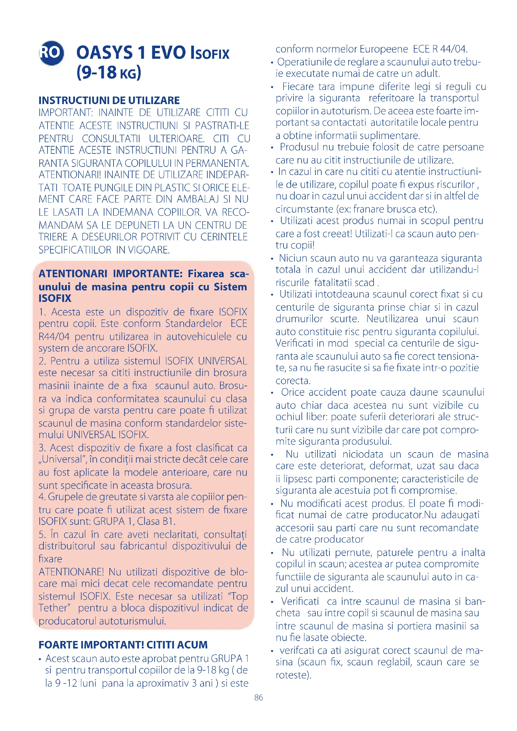 SPECIFICATIILOR IN VIGOARE. ATENTIONARI IMPORTANTE: Fixarea sca- unului de masina pentru copii cu Sistem ISOFIX