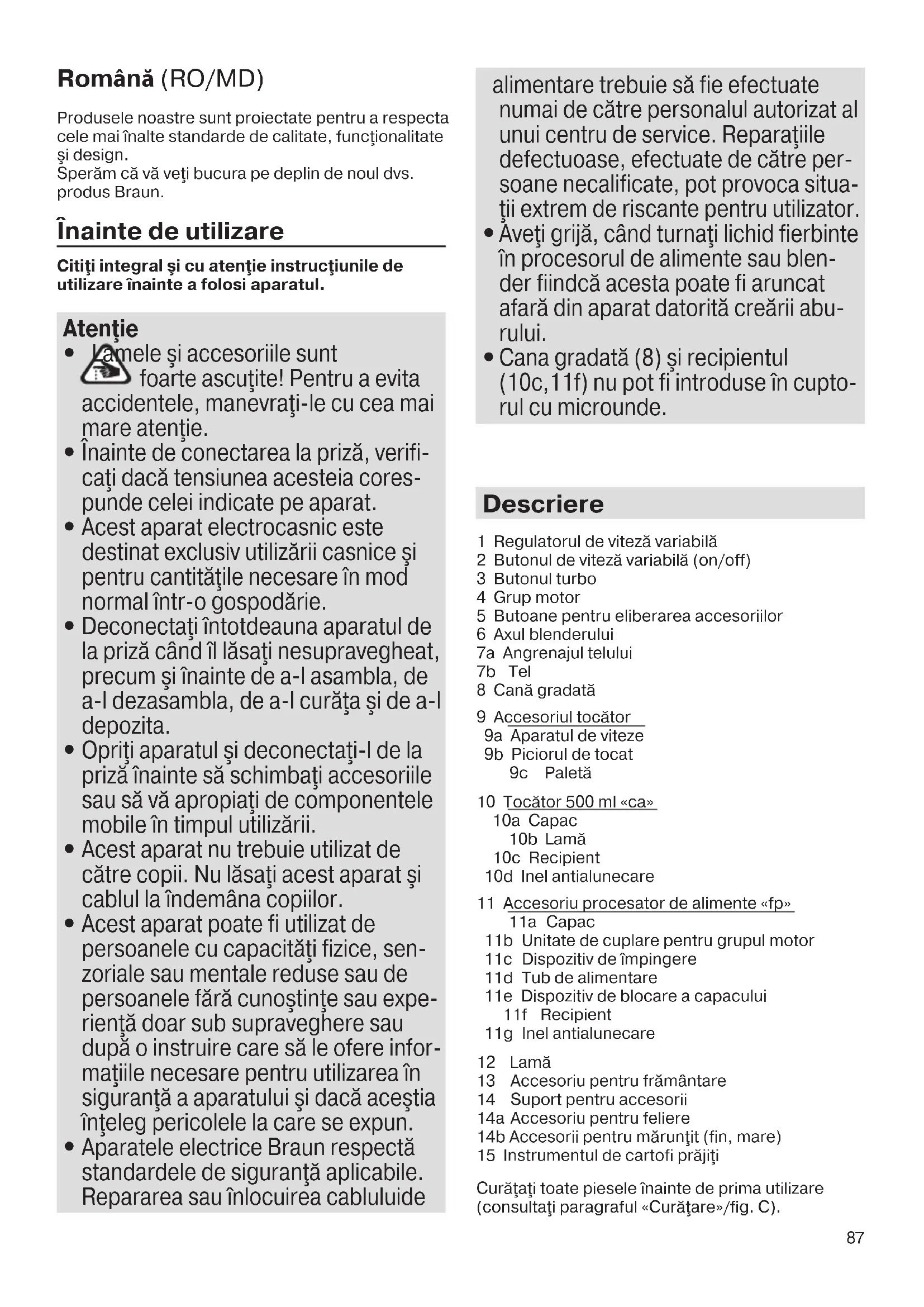 info@braunhousehold.com.tr 5722111674_MQ5007-5037-5077_INT_AUNZ_S6-116.indd 86 15.07.15 12:2287 Română (RO/MD) Produsele noastre sunt proiectate pentru a respecta cele mai înalte standarde de calitate, funcţionalitate şi design. Sperăm că vă veţi bucura pe deplin de noul dvs. produs Braun. Înainte de utilizare Citiţi integral şi cu atenţie instrucţiunile de utilizare înainte a folosi aparatul. Atenţie