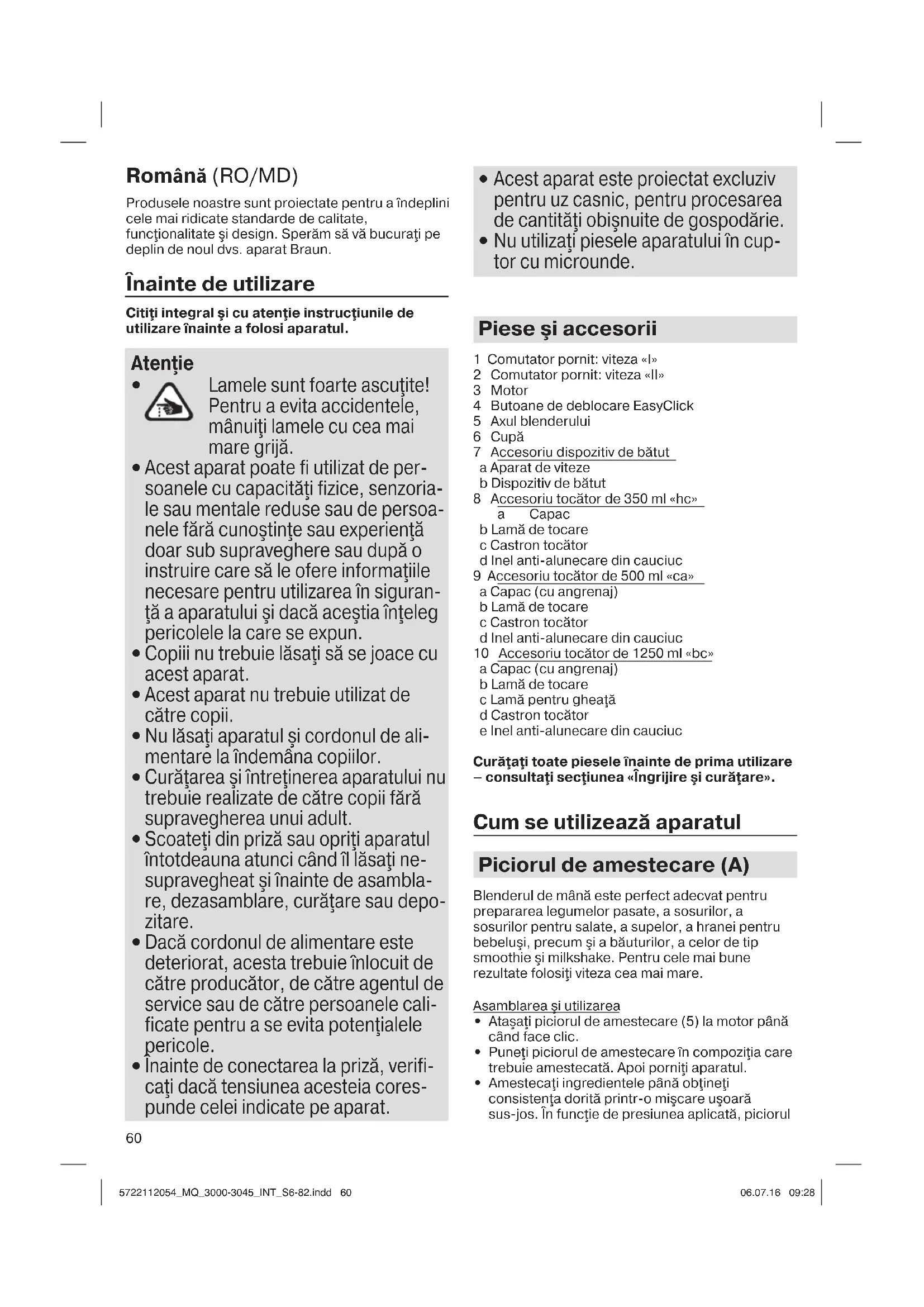 - Când procesaţi alimente cu conţinut ridicat de pigment (de exemplu, morcovi), accesoriile se pot decolora. Ştergeţi aceste piese cu ulei vegetal înainte de a le spăla. Atât specificaţiile de proiectare, cât şi aceste instrucţiuni de utilizare se pot schimba fără aviz prealabil. Acestea pot fi modificate fără notificare. Nu aruncaţi produsul împreună cu deşeurile menajere la sfârşitul ciclului de viaţă al aces- tuia. Produsul poate fi remis la un centru de service Braun sau la un punct de colectare corespunzător din ţara dvs. Materialele şi obiectele destinate contactului cu produsele alimentare sunt în conformitate cu dispoziţiile regulamentului European 1935/2004. 5722112054_MQ_3000-3045_INT_S6-82.indd 625722112054_MQ_3000-3045_INT_S6-82.indd 62 06.07.16 09:2806.07.16 09:2863