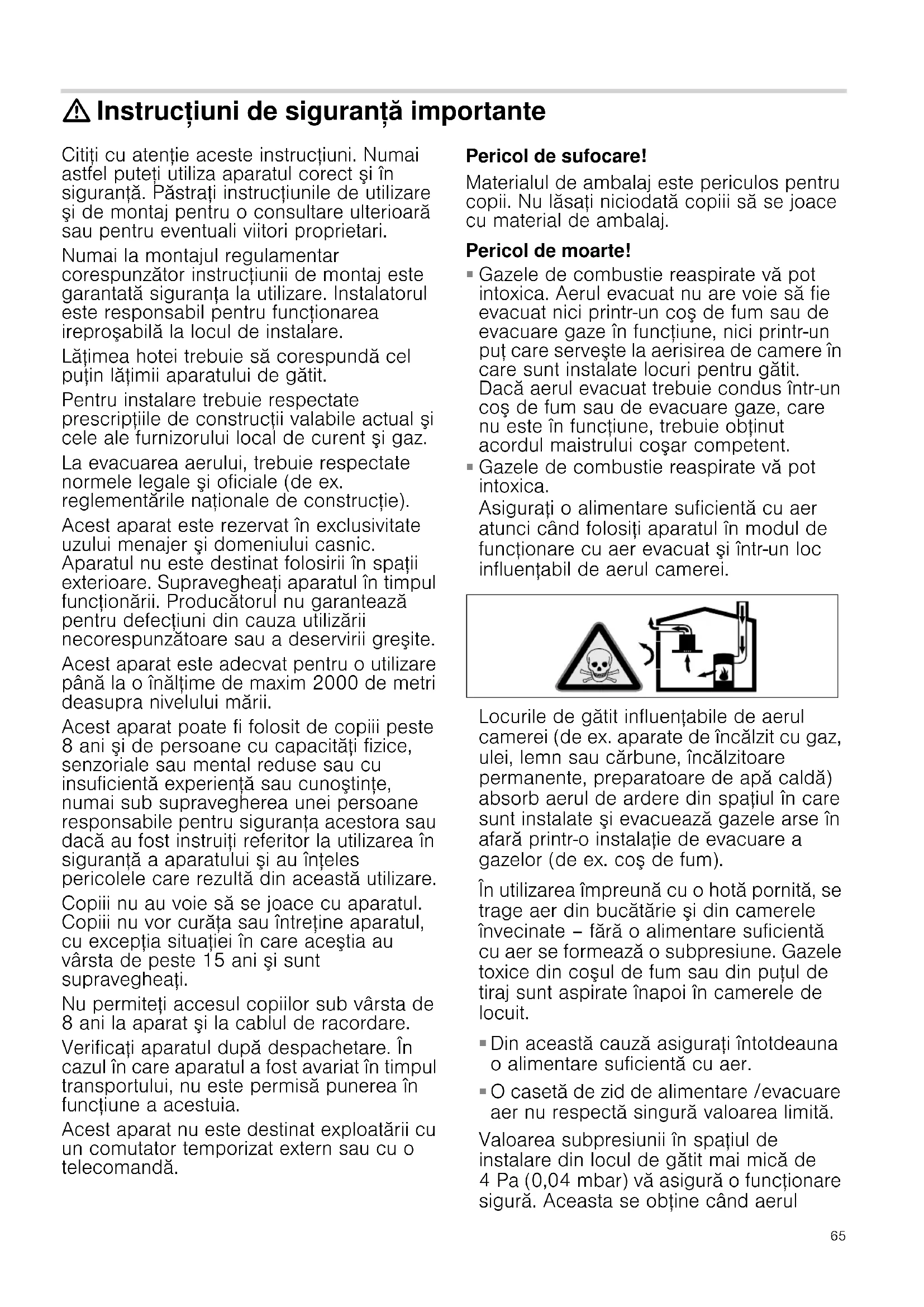 O casetă de zid de alimentare /evacuare aer nu respectă singură valoarea limită. Valoarea subpresiunii în spaţiul de instalare din locul de gătit mai mică de 4 Pa (0,04 mbar) vă asigură o funcţionare sigură. Aceasta se obţine când aerul66 necesar pentru ardere circulă prin deschideri ca de ex. uşi, ferestre în legătură cu o casetă de zid de alimentare / evacuare aer sau prin alte mijloace tehnice. Cereţi întotdeauna sfatul unui coşar profesionist, care poate aprecia întregul complex de aerisire al casei şi vă poate propune măsura adecvată pentru aerisire. Dacă hota funcţionează exclusiv cu aer recirculat, funcţionarea este posibilă fără restricţie. Pericol de moarte!