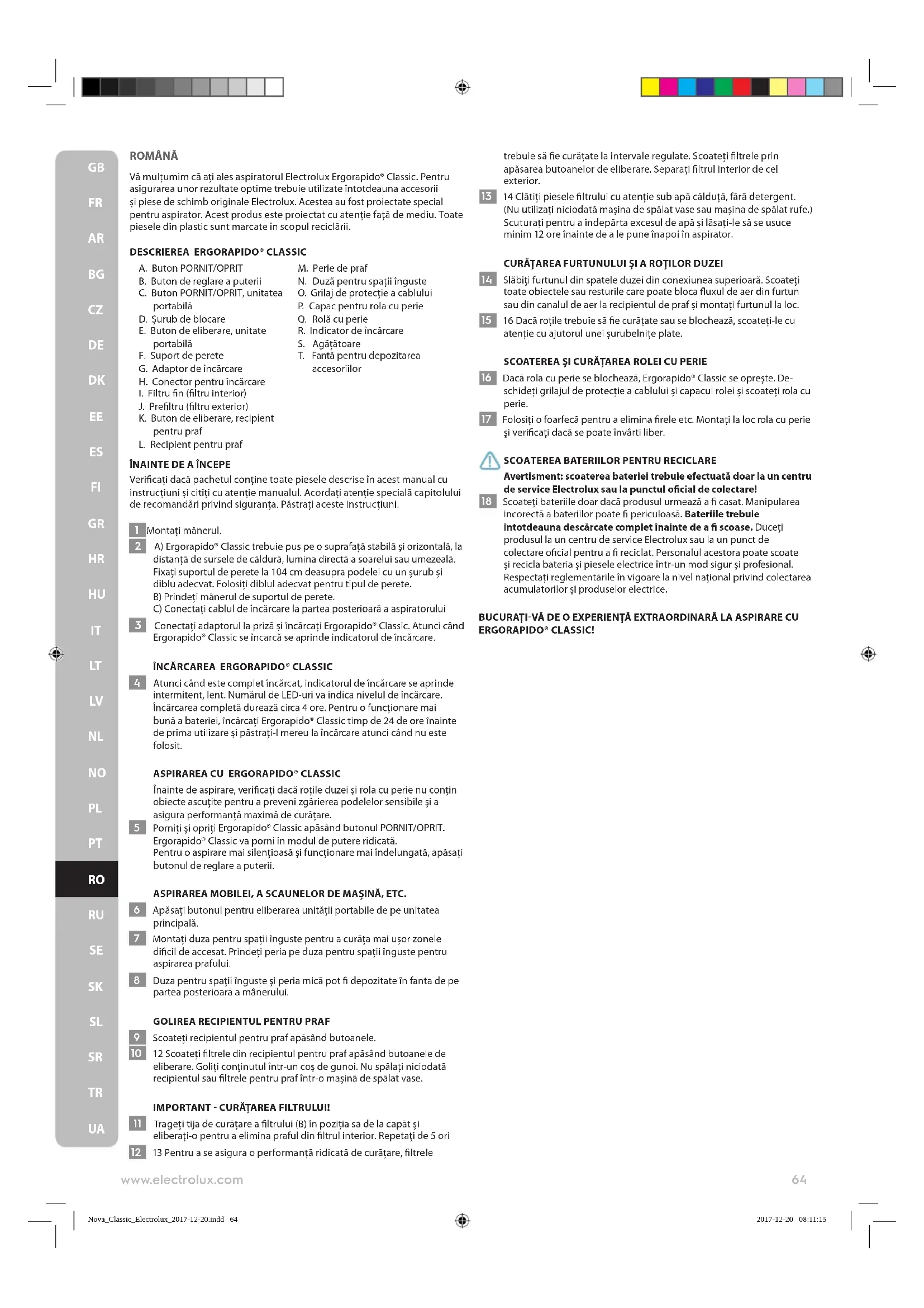 Avertisment: scoaterea bateriei trebuie efectuată doar la un centru de service Electrolux sau la punctul ocial de colectare! 18 Scoateți bateriile doar dacă produsul urmează a casat. Manipularea incorectă a bateriilor poate periculoasă. Bateriile trebuie întotdeauna descărcate complet înainte de a scoase. Duceți produsul la un centru de service Electrolux sau la un punct de colectare ocial pentru a reciclat. Personalul acestora poate scoate și recicla bateria și piesele electrice într-un mod sigur și profesional. Respectați reglementările în vigoare la nivel naţional privind colectarea acumulatorilor și produselor electrice. BUCURAȚI-VĂ DE O EXPERIENȚĂ EXTRAORDINARĂ LA ASPIRARE CU ERGORAPIDO® CLASSIC!