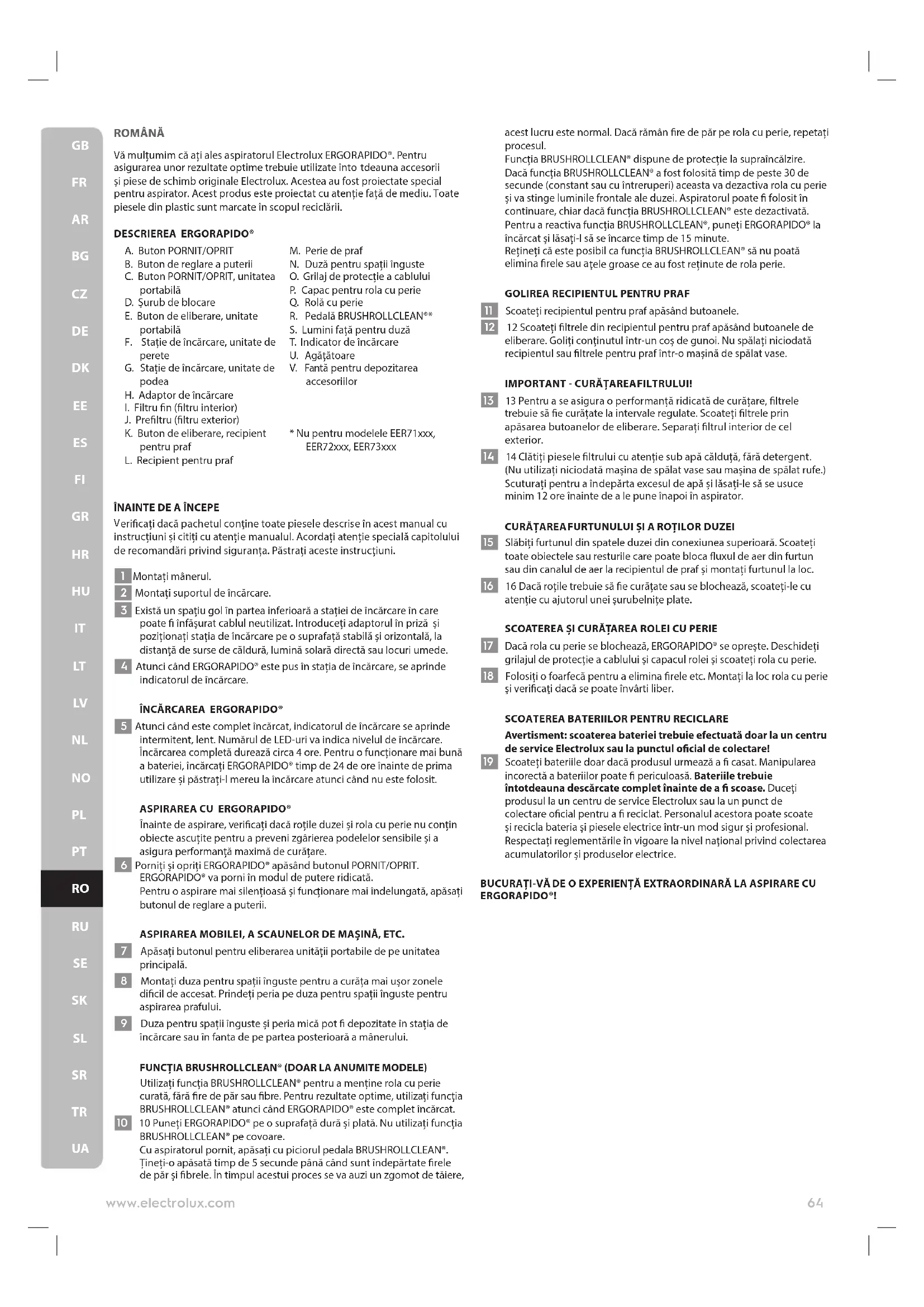 Avertisment: scoaterea bateriei trebuie efectuată doar la un centru de service Electrolux sau la punctul ocial de colectare! 19 Scoateți bateriile doar dacă produsul urmează a casat. Manipularea incorectă a bateriilor poate periculoasă. Bateriile trebuie întotdeauna descărcate complet înainte de a scoase. Duceți produsul la un centru de service Electrolux sau la un punct de colectare ocial pentru a reciclat. Personalul acestora poate scoate și recicla bateria și piesele electrice într-un mod sigur și profesional. Respectați reglementările în vigoare la nivel naţional privind colectarea acumulatorilor și produselor electrice. BUCURAȚI-VĂ DE O EXPERIENȚĂ EXTRAORDINARĂ LA ASPIRARE CU ERGORAPIDO®!