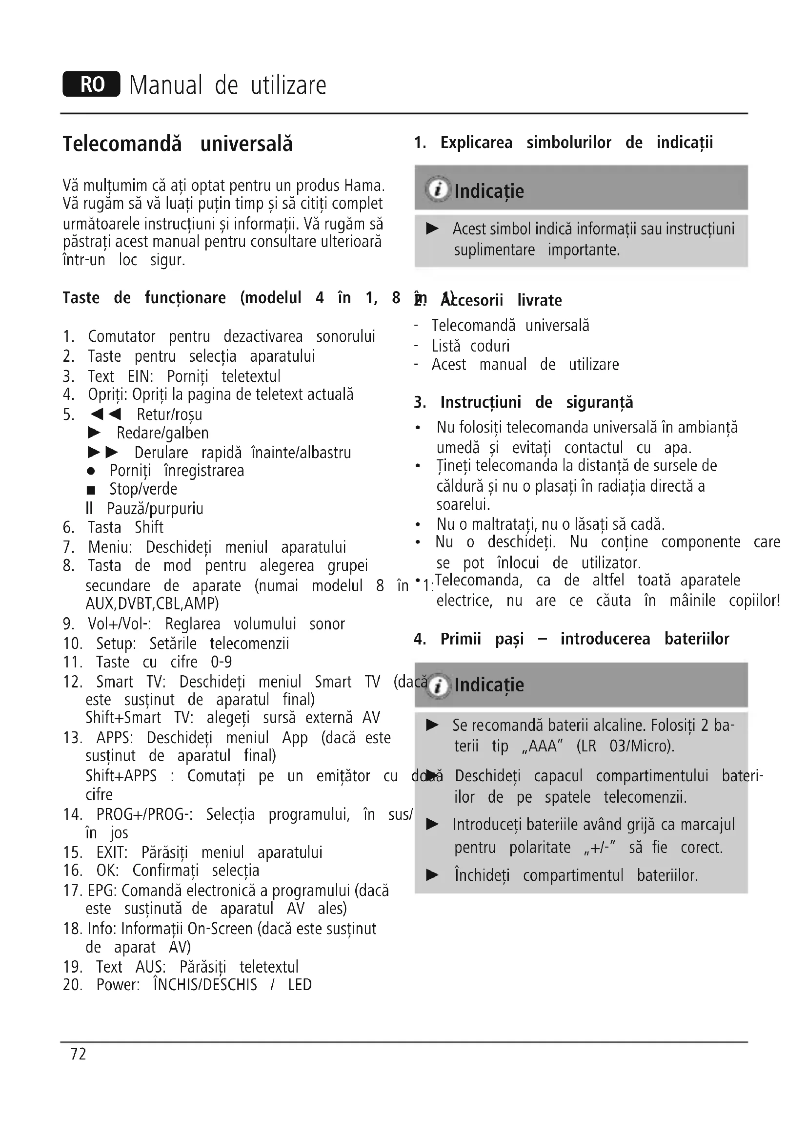 Instrucţiuni pentru protecţia mediului înconjurător: Din momentul aplicării directivelor europene 2012/19/EU şi 2006/66/EU în dreptul național sunt valabile următoarele: Aparatele electrice şi electronice nu pot salubrizate cu gunoiul menajer. Consumatorul este obligat conform legii să predea aparatele electrice și electronice la sfârșitul duratei de utilizare la locurile de colectare publice sau înapoi de unde au fost cumpărate. Detaliile sunt reglementate de către legislaţia țării respective. Simbolul de pe produs, în instrucţiunile de utilizare sau pe ambalaj indică aceste reglementări. Prin reciclarea, revaloricarea materialelor sau alte forme de valoricare a aparatelor scoase din uz aduceți o contribuție importantă la protecția mediului nostru înconjurător. 76Universalfjärrkontroll Tack för att du har köpt en produkt från Hama. Ta dig tid och läs igenom nedanstående anvisningar och information. Förvara bruksanvisningen på en säker plats för framtida behov. Funktionsknappar (på modellerna 4 i 1, 8 i 1)
