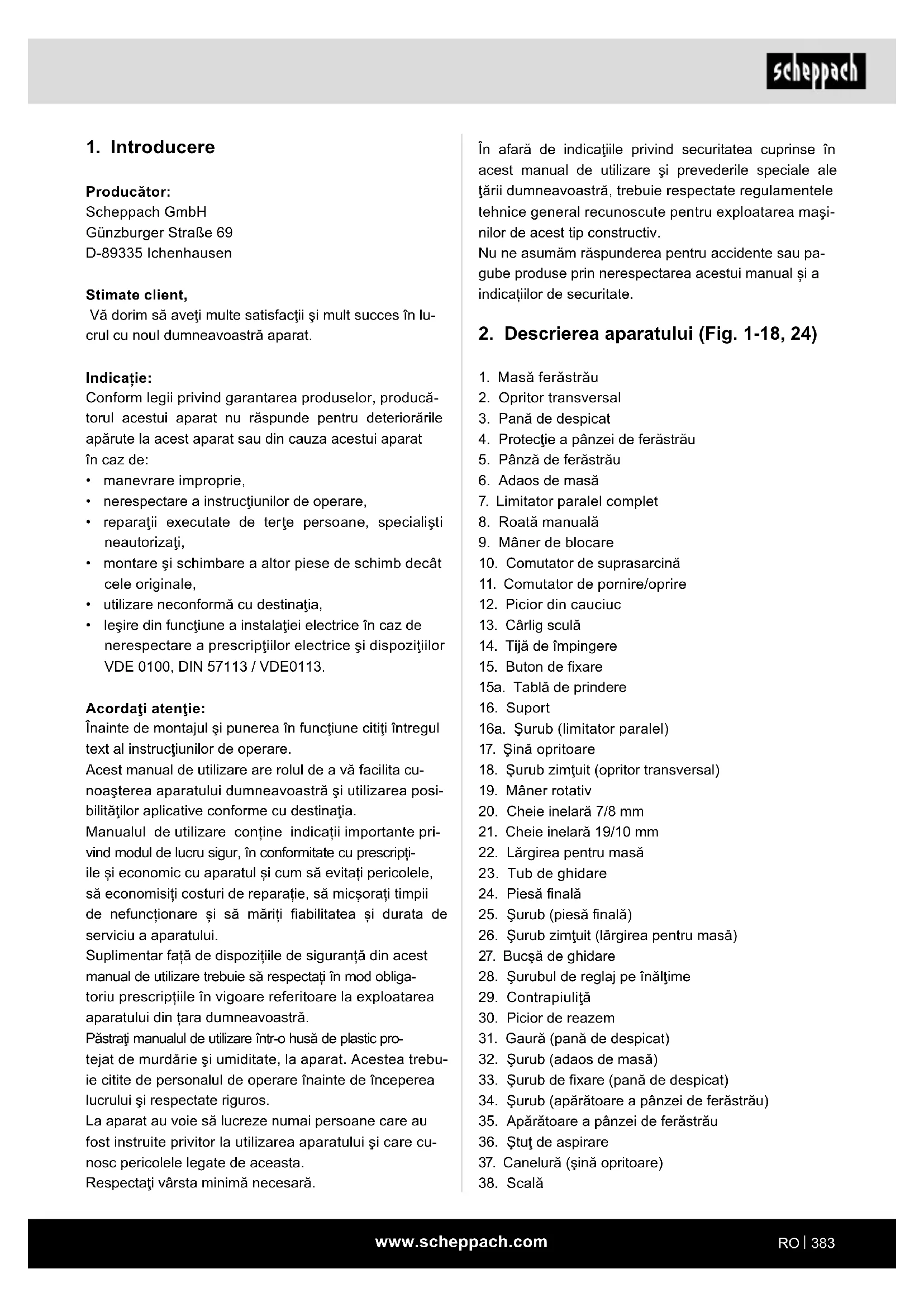- Ieşire din funcţiune a instalaţiei electrice în caz de nerespectare a prescripţiilor electrice şi dispoziţiilor VDE 0100, DIN 57113 / VDE0113. Acordaţi atenţie: Înainte de montajul şi punerea în funcţiune citiţi întregul text al instrucţiunilor de operare. Acest manual de utilizare are rolul de a vă facilita cu- noaşterea aparatului dumneavoastră şi utilizarea posi- bilităţilor aplicative conforme cu destinaţia. Manualul de utilizare conține indicații importante pri- vind modul de lucru sigur, în conformitate cu prescripți- ile și economic cu aparatul și cum să evitați pericolele, să economisiți costuri de reparație, să micșorați timpii de nefuncționare și să măriți abilitatea și durata de serviciu a aparatului. Suplimentar față de dispozițiile de siguranță din acest manual de utilizare trebuie să respectați în mod obliga- toriu prescripțiile în vigoare referitoare la exploatarea aparatului din țara dumneavoastră. Păstraţi manualul de utilizare într-o husă de plastic pro- tejat de murdărie şi umiditate, la aparat. Acestea trebu- ie citite de personalul de operare înainte de începerea lucrului şi respectate riguros. La aparat au voie să lucreze numai persoane care au fost instruite privitor la utilizarea aparatului şi care cu- nosc pericolele legate de aceasta. Respectaţi vârsta minimă necesară.www.scheppach.com