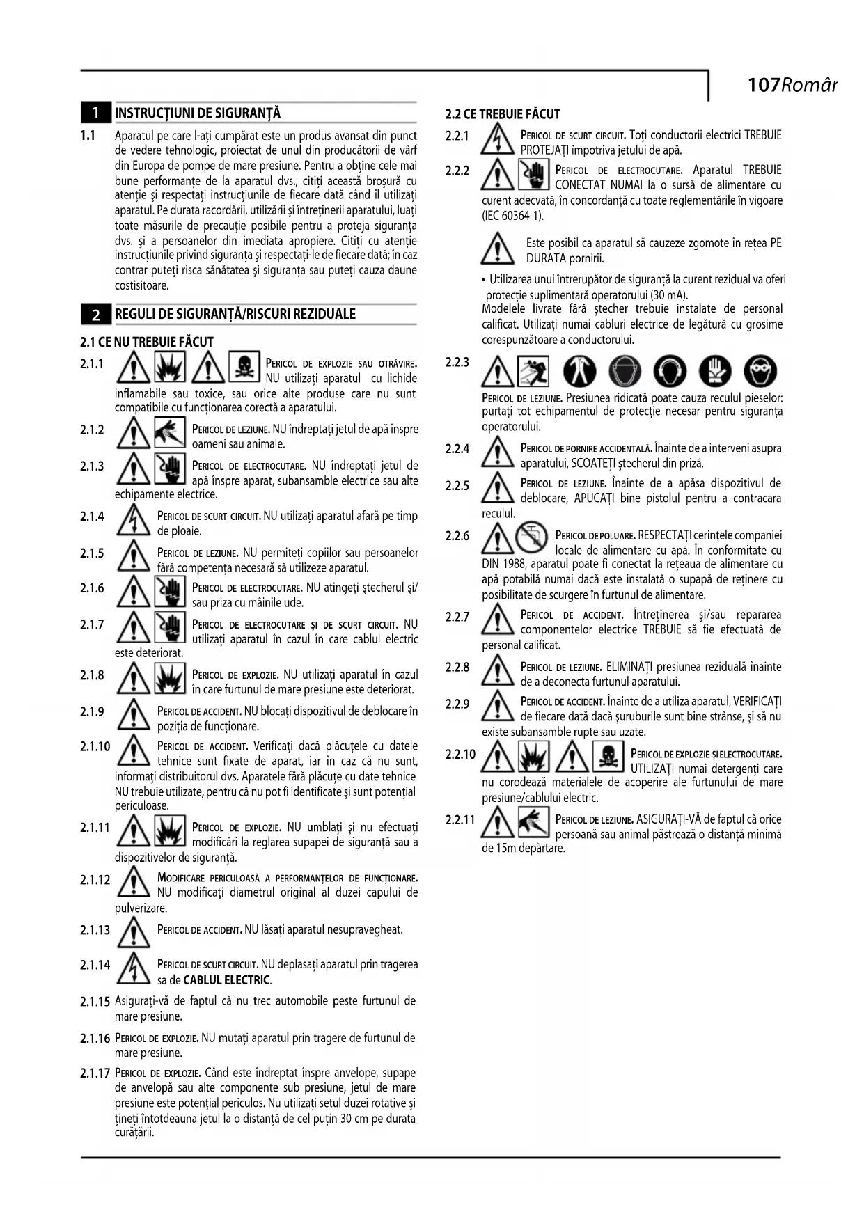 de vedere tehnologic, proiectat de unul din producătorii de vârf din Europa de pompe de mare presiune. Pentru a obţine cele mai bune performanţe de la aparatul dvs., citiţi această broşură cu atenţie şi respectaţi instrucţiunile de fiecare dată când îl utilizaţi aparatul. Pe durata racordării, utilizării şi întreţinerii aparatului, luaţi toate măsurile de precauţie posibile pentru a proteja siguranţa dvs. şi a persoanelor din imediata apropiere. Citiţi cu atenţie instrucţiunile privind siguranţa şi respectaţi-le de fiecare dată; în caz contrar puteţi risca sănătatea şi siguranţa sau puteţi cauza daune costisitoare.