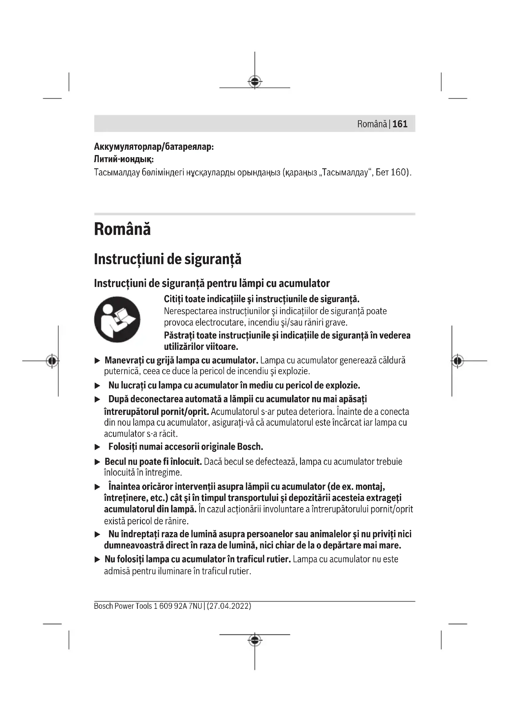 Ұсынылған литий-иондық аккумуляторлар қауіпті тауарларға қойылатын талаптарға бағынады. Пайдаланушы аккумуляторларды көшеде қосымша құжаттарсыз тасымалдай алады. Үшінші тұлғалар (мысалы, әуе көлігі немесе жіберу) орамаға және маркаларға қойылатын арнайы талаптарды сақтау керек. Жіберуге дайындау кезінде қауіпті жүктерді тасымалдау маманымен хабарласу керек. Аккумуляторды корпусы зақымдалған болса ғана жіберіңіз. Ашық түйіспелерді желімдеңіз және аккумуляторды орамада қозғалмайтындай ораңыз. Қажет болса, қосымша ұлттық ережелерді сақтаңыз. Кәдеге жарату Аккумуляторлық фонарьларды, аккумуляторларды, керек-жарақтарды және орау материалдарын экологиялық тұрғыдан дұрыс утилизациялауға тапсыру керек. Аккумуляторлық фонарьларды және аккумуляторларды/батареяларды үй қоқысына тастамаңыз! Тек қана ЕО елдері үшін: Ескі электрлік және электрондық құрылғылар туралы 2012/19/EU еуропалық директивасы және оның ұлттық заңнамада қолданылуы бойынша пайдалануға бұдан былай жарамсыз аккумуляторлық шамдарды және 2006/66/ЕC еуропалық директивасы бойынша зақымдалған немесе ескірген аккумуляторларды/ батареяларды бөлек жинап, қоршаған орта үшін қауіпсіз жолмен қайта өңдеуге жіберу қажет. Қате жолмен кәдеге жаратылған ескі электрлік және электрондық құрылғылар қауіпті заттардың болу мүмкіндігіне байланысты қоршаған ортаға және адам денсаулығына зиянды әсер тигізуі мүмкін. 1 609 92A 7NU | (27.04.2022) Bosch Power ToolsRomână | 161 Аккумуляторлар/батареялар: Литий-иондық: Тасымалдау бөліміндегі нұсқауларды орындаңыз (қараңыз „Тасымалдау“, Бет160). Română Instrucţiuni de siguranţă Instrucţiuni de siguranţă pentru lămpi cu acumulator Citiţi toate indicaţiile şi instrucţiunile de siguranţă. Nerespectarea instrucţiunilor şi indicaţiilor de siguranţă poate provoca electrocutare, incendiu şi/sau răniri grave. Păstraţi toate instrucţiunile şi indicaţiile de siguranţă în vederea utilizărilor viitoare. u Manevraţi cu grijă lampa cu acumulator. Lampa cu acumulator generează căldură puternică, ceea ce duce la pericol de incendiu şi explozie. u Nu lucraţi cu lampa cu acumulator în mediu cu pericol de explozie.u După deconectarea automată a lămpii cu acumulator nu mai apăsaţi întrerupătorul pornit/oprit. Acumulatorul s‑ar putea deteriora. Înainte de a conecta din nou lampa cu acumulator, asiguraţi-vă că acumulatorul este încărcat iar lampa cu acumulator s-a răcit. u Folosiţi numai accesorii originale Bosch. u Becul nu poate fi înlocuit. Dacă becul se defectează, lampa cu acumulator trebuie înlocuită în întregime. u Înaintea oricăror intervenţii asupra lămpii cu acumulator (de ex. montaj, întreţinere, etc.) cât şi în timpul transportului şi depozitării acesteia extrageţi acumulatorul din lampă. În cazul acţionării involuntare a întrerupătorului pornit/oprit există pericol de rănire. u Nu îndreptaţi raza de lumină asupra persoanelor sau animalelor şi nu priviţi nici dumneavoastră direct în raza de lumină, nici chiar de la o depărtare mai mare. u Nu folosiţi lampa cu acumulator în traficul rutier. Lampa cu acumulator nu este admisă pentru iluminare în traficul rutier. Bosch Power Tools 1 609 92A 7NU | (27.04.2022)162 | Română ATENŢIE! Nu privi pentru timp îndelungat spre fasciculul luminos. Radiaţia optică poate fi nocivă pentru ochi. u Nu acoperi capul lămpii în timpul funcţionării lămpii cu acumulator. Capul lămpii se încălzeşte în timpul funcţionării şi poate provoca arsuri în cazul acumulării de căldură. u În cazul deteriorării sau utilizării necorespunzătoare a acumulatorului, se pot degaja vapori. Acumulatorul poate arde sau exploda. Aerisiţi bine încăperea şi solicitaţi asistenţă medicală dacă starea dumneavoastră de sănătate se înrăutăţeşte. Vaporii pot irita căile respiratorii. u În cazul utilizării necorespunzătoare sau al unui acumulator deteriorat, din acumulator se poate scurge lichid inflamabil. Evitaţi contactul cu acesta. În cazul contactului accidental, clătiţi bine cu apă. Dacă lichidul vă intră în ochi, consultaţi de asemenea un medic. Lichidul scurs din acumulator poate cauza iritaţii ale pielii sau arsuri. u În urma contactului cu obiecte ascuţite ca de exemplu cuie sau şurubelniţe sau prin acţiunea unor forţe exterioare asupra sa, acumulatorul se poate deteriora. Se poate produce un scurtcircuit intern în urma căruia acumulatorul să se aprindă, să scoată fum, să explodeze sau să se supraîncălzească. u Feriţi acumulatorii nefolosiţi de agrafele de birou, monede, chei, cuie, şuruburi sau alte obiecte metalice mici, care ar putea provoca şuntarea contactelor. Un scurtcircuit între co